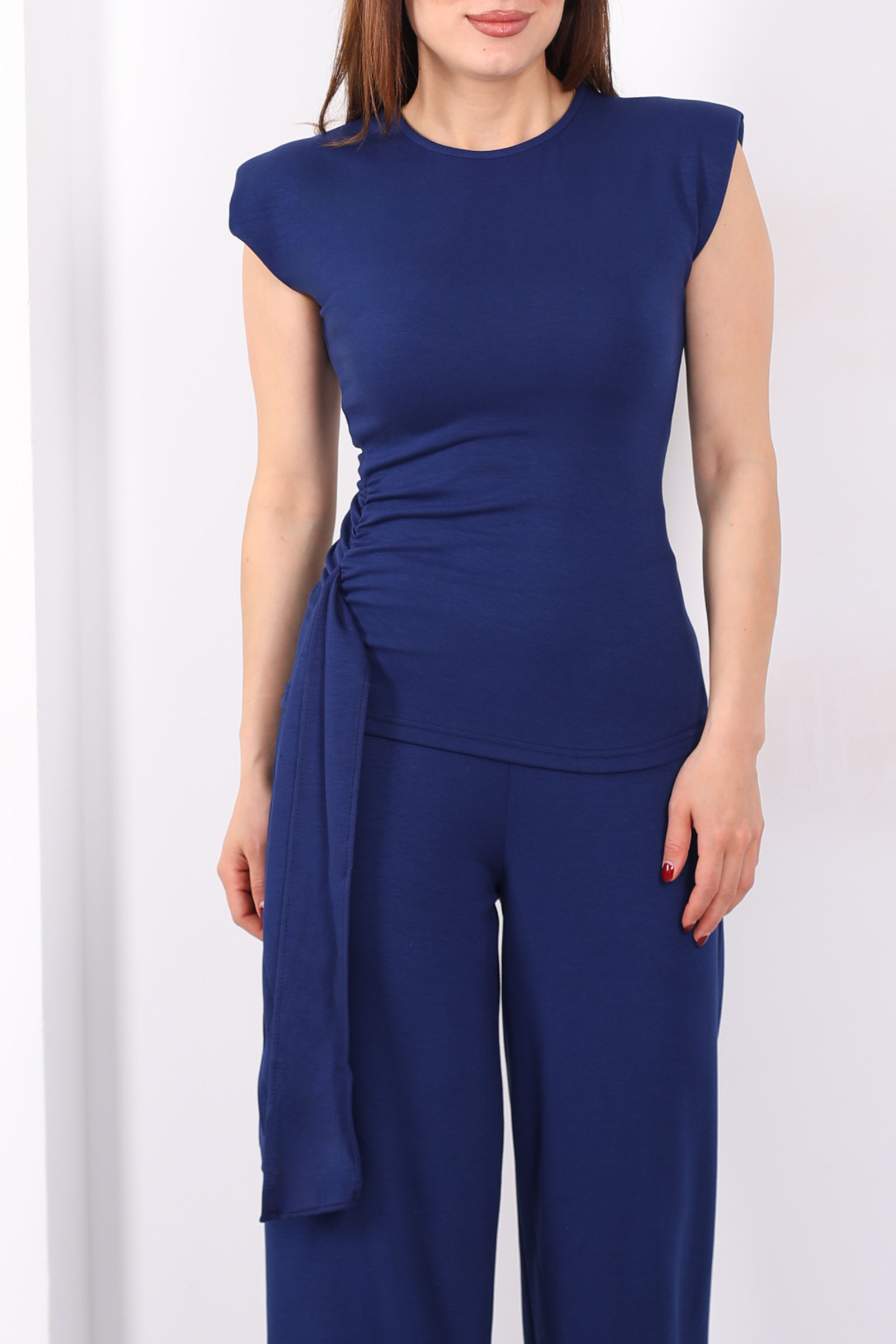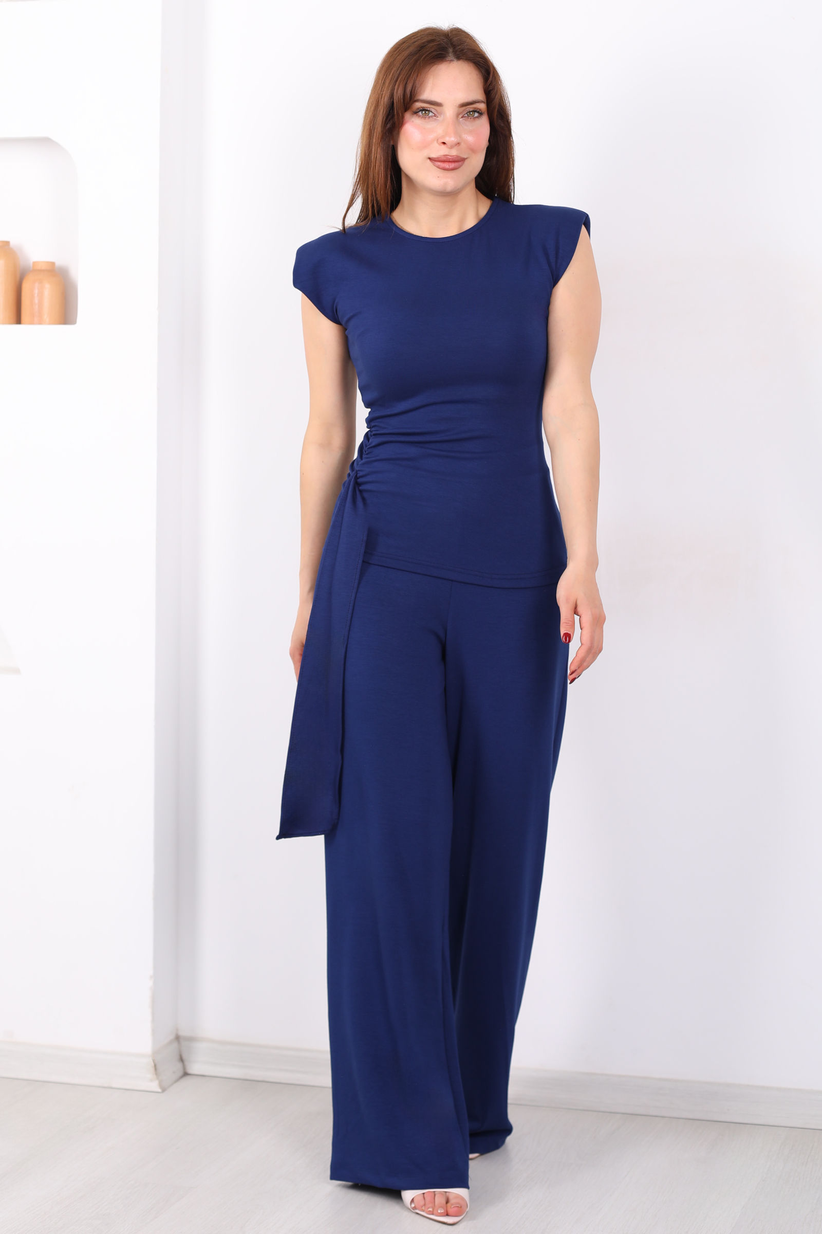 Yanı Drapeli Kuşaklı Kadın Lacivert Modal Pantolon Takım