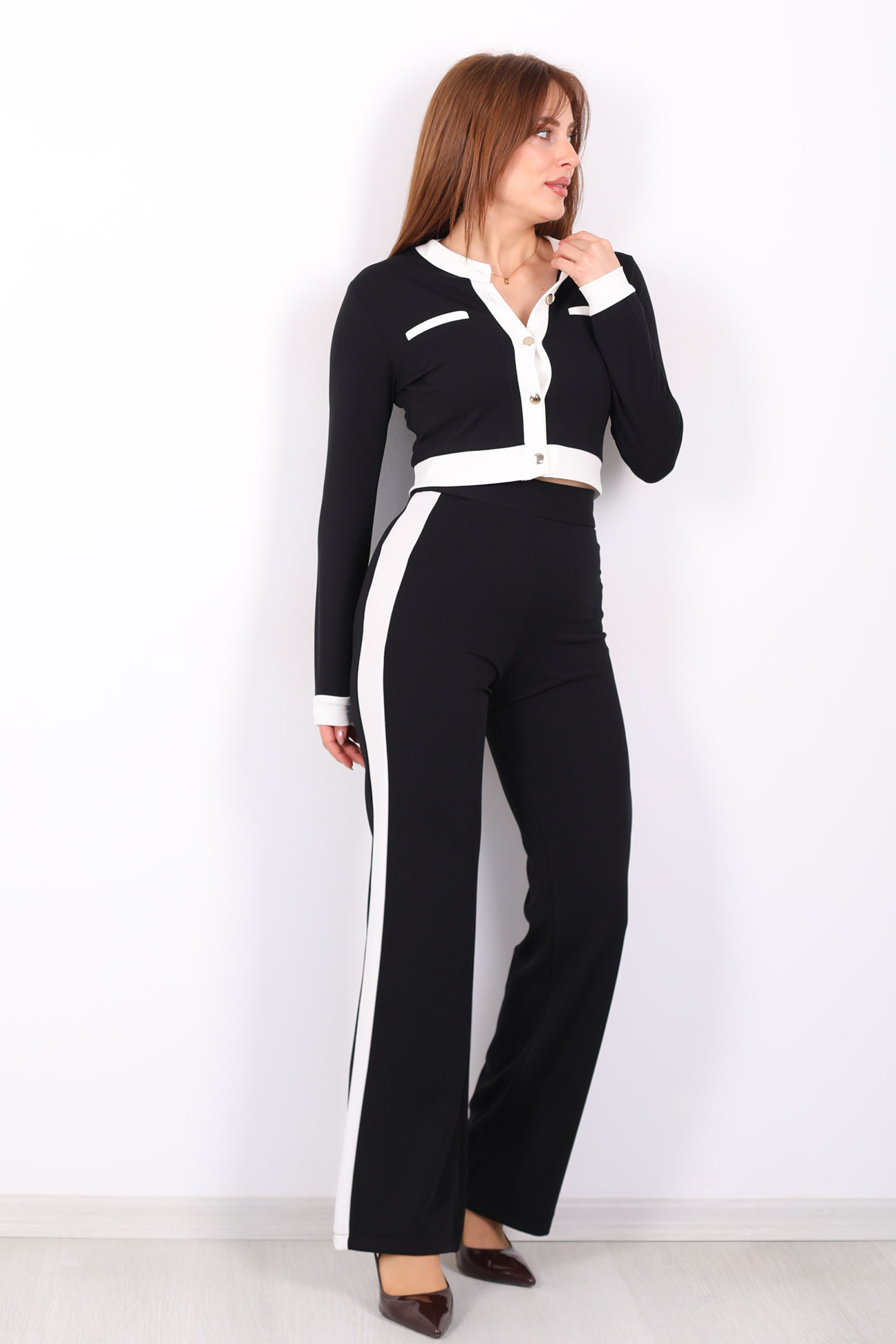Siyah yan şeritli düğmeli Venedik takım, modern ve şık tasarımıyla her stilin vazgeçilmezi olacak. Yan şerit detayları, takıma dinamik bir hava katarken, düğme detayları şıklığına şıklık ekler. Yumuşak kumaşı, rahatlık sağlarken, siyah renginin zamansız şıklığı her ten rengine mükemmel uyum sağlar. Hem iş hayatınızda hem de günlük şıklığınızda rahatlıkla kullanabileceğiniz bu takım, hem şık hem de konforlu bir görünüm sunar. Modern çizgiler ve rahat kesim, her kombine uyum sağlar.