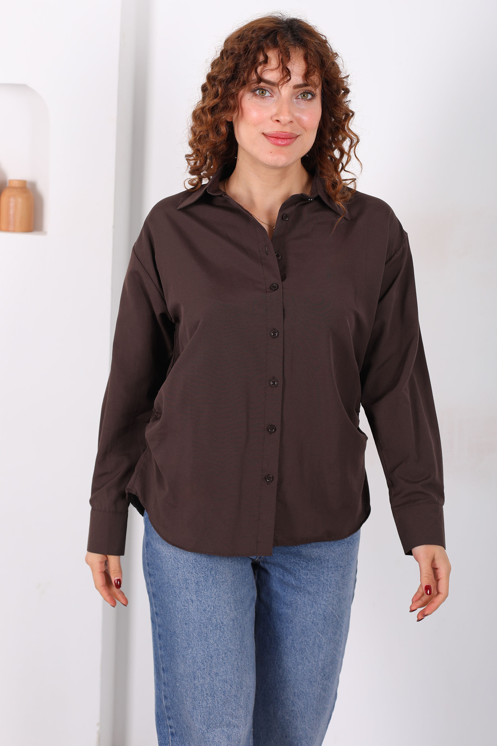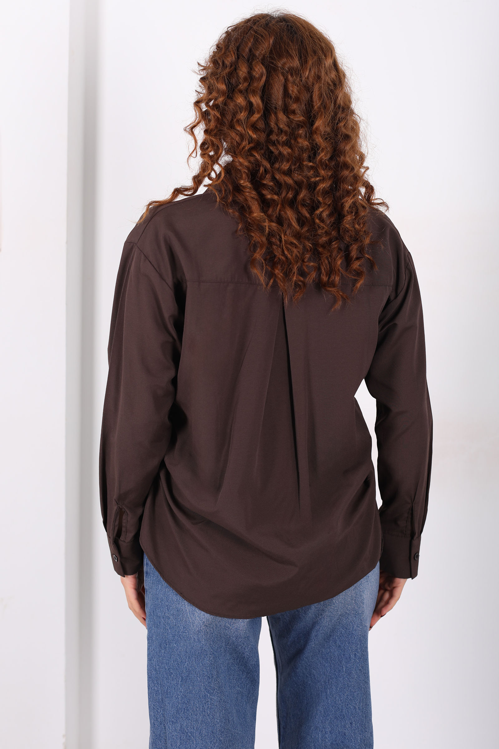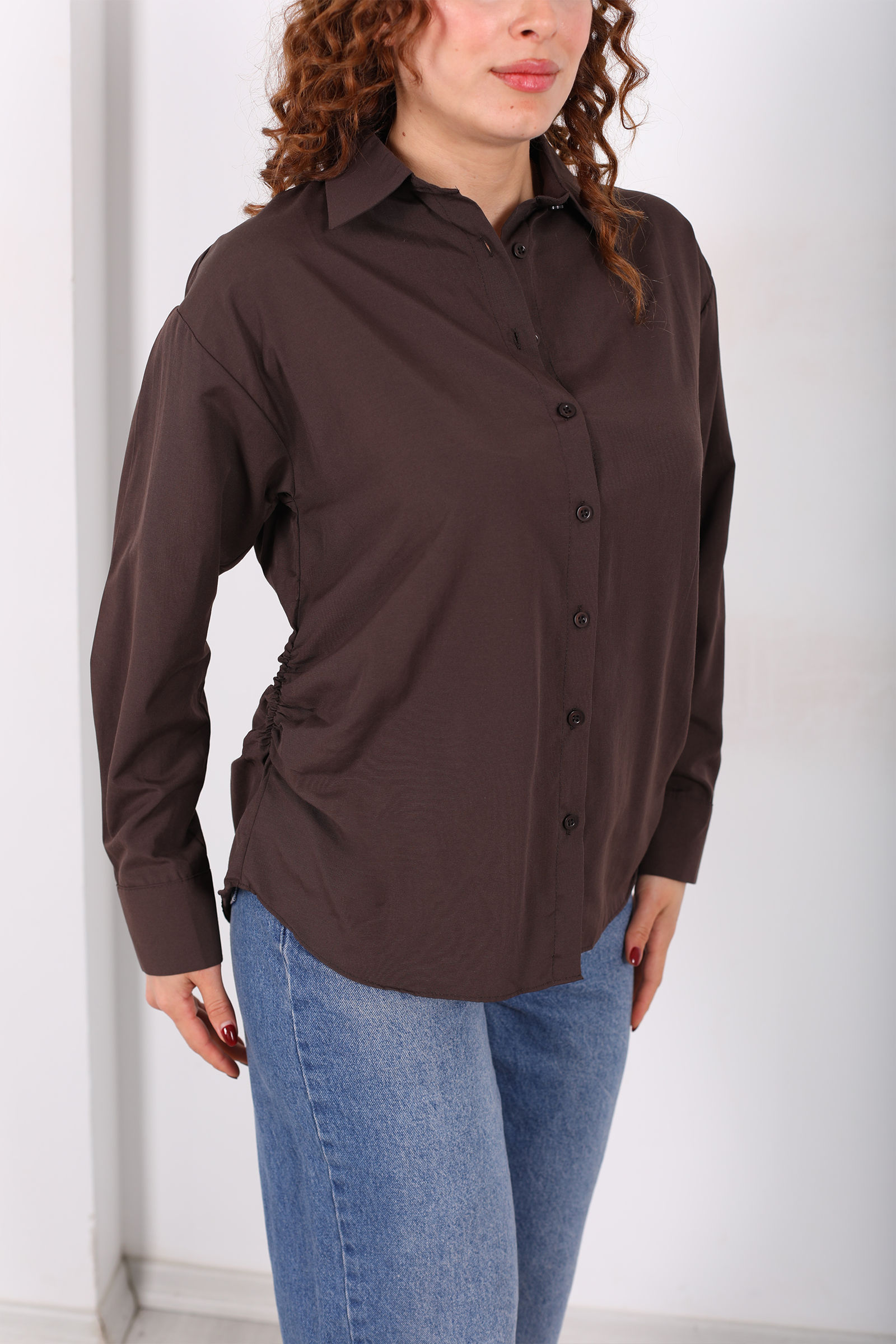Yanları Büzgülü Acı Kahve Kadın Basic Gömlek