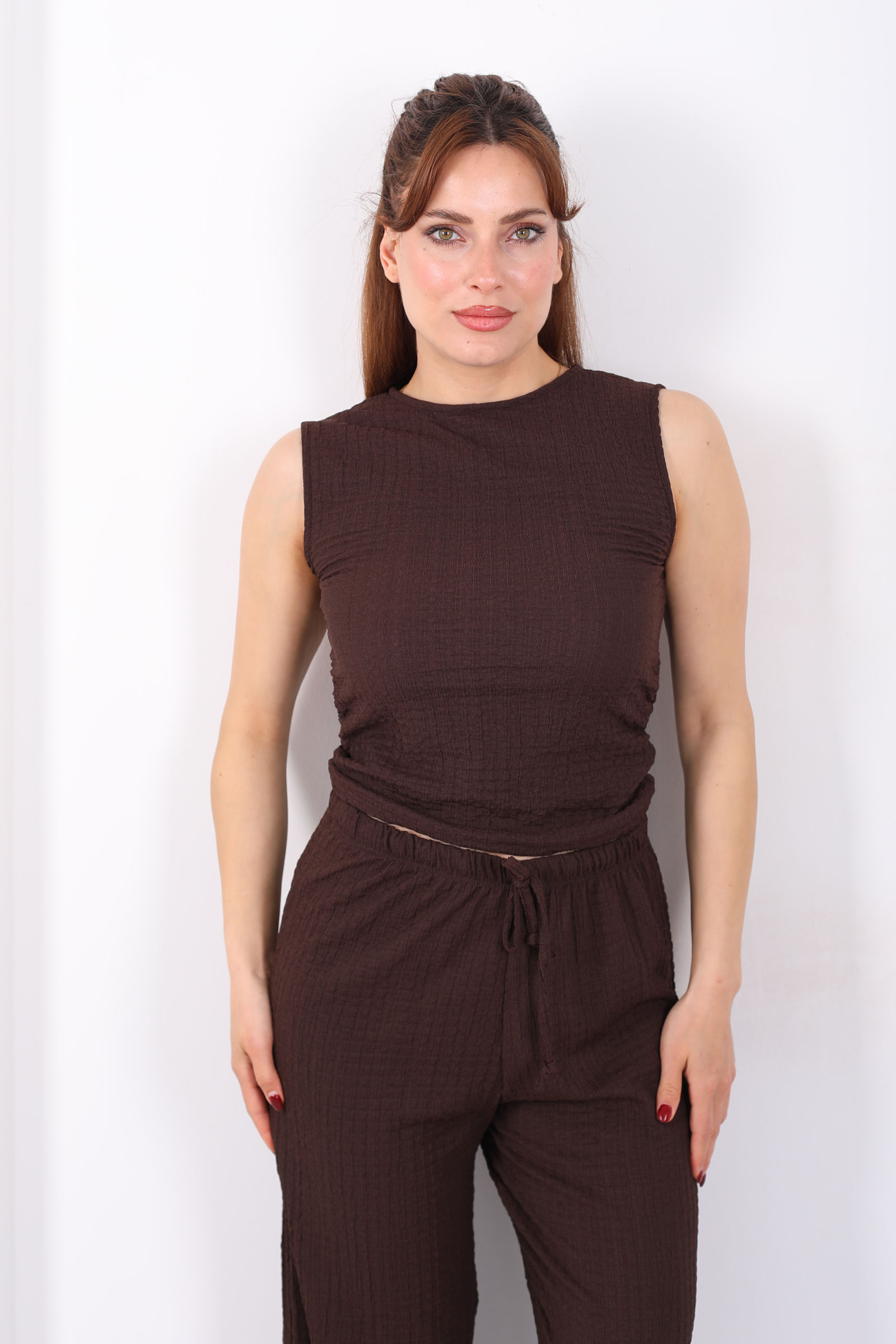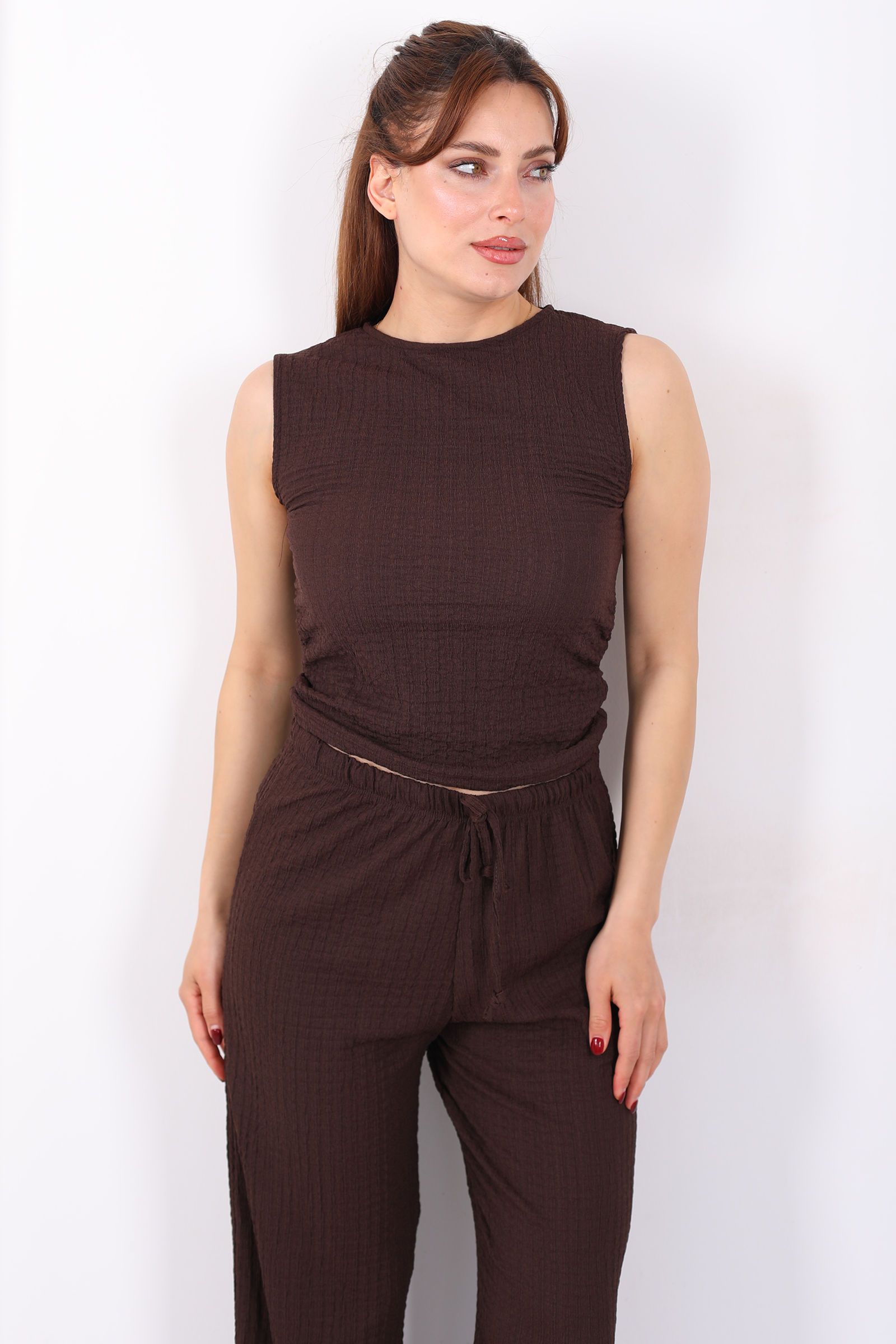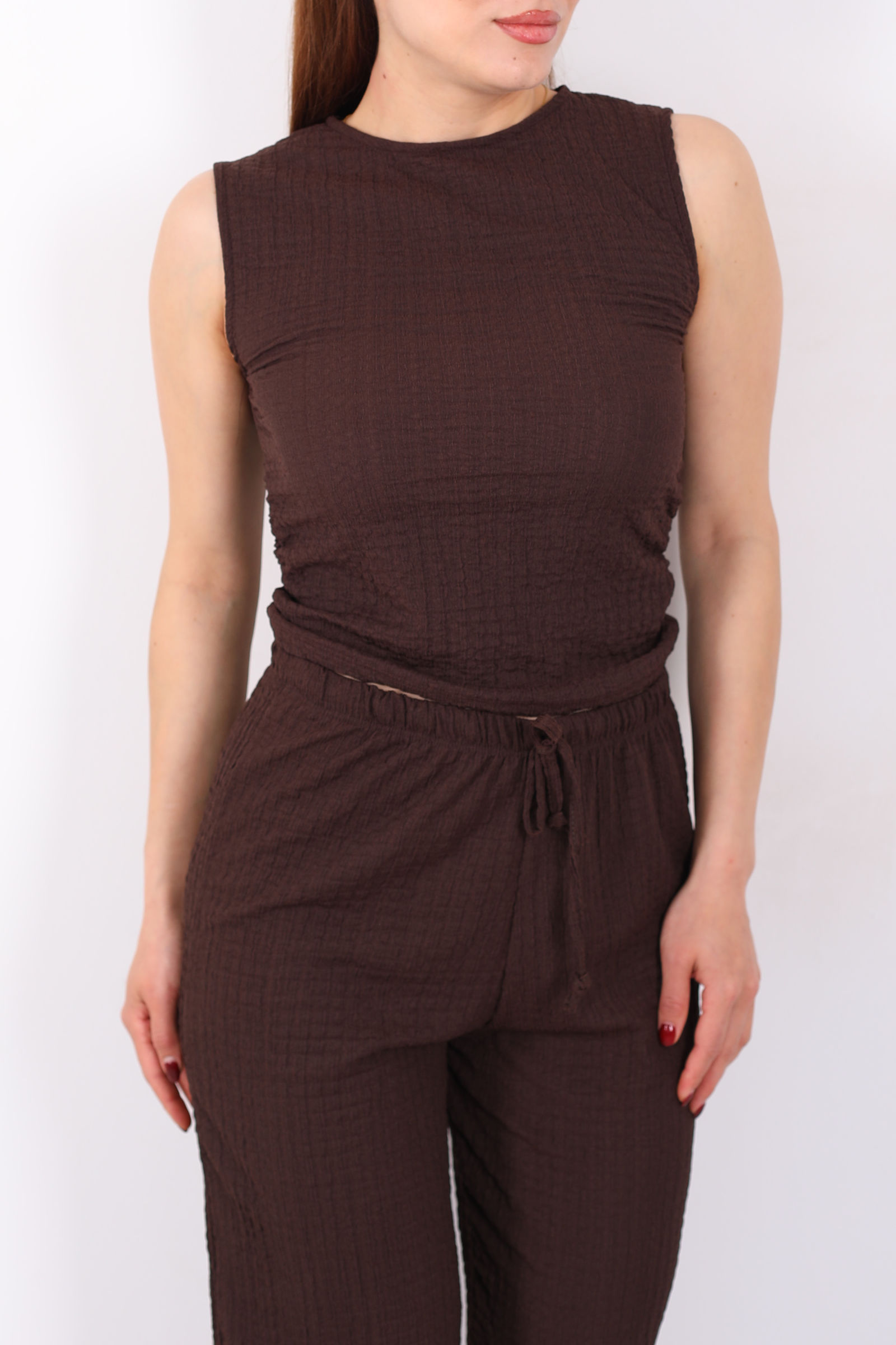 Yanları Drapeli Bisiklet Yaka Kadın Acı Kahve Kolsuz Bubble Bluz