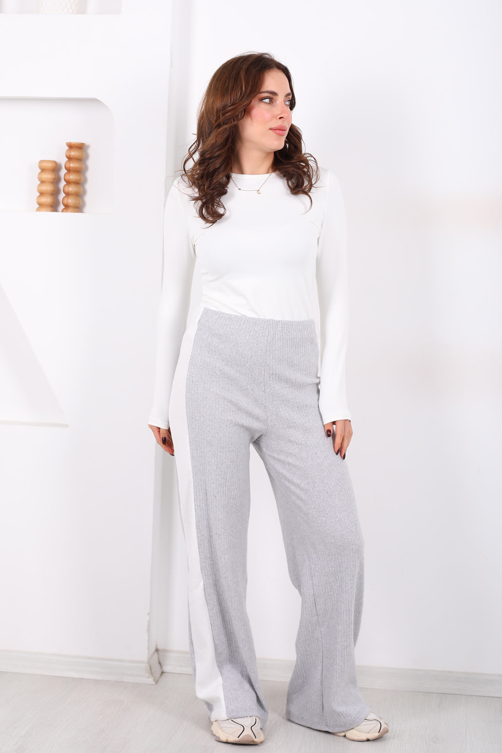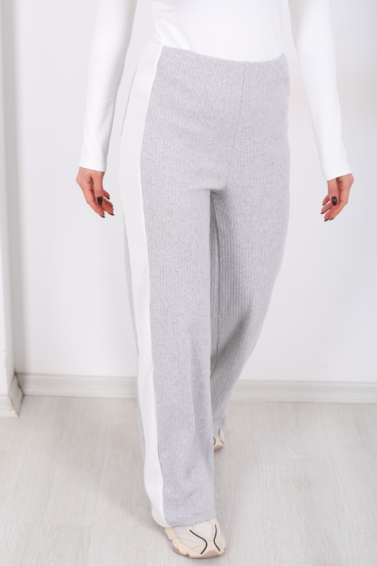 Yanları Şeritli Bol Paça Gri Kadın Yumoş Pantolon
