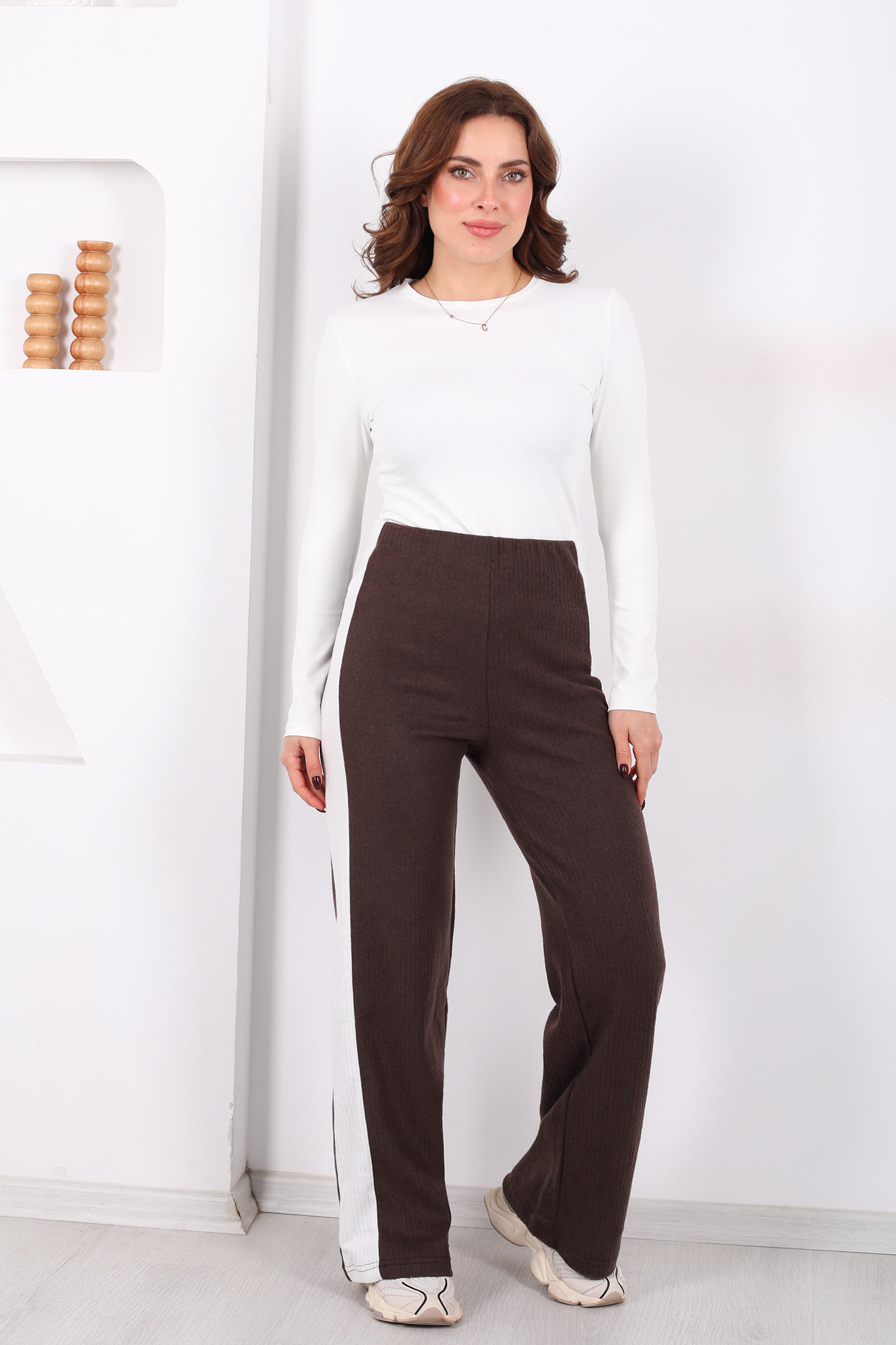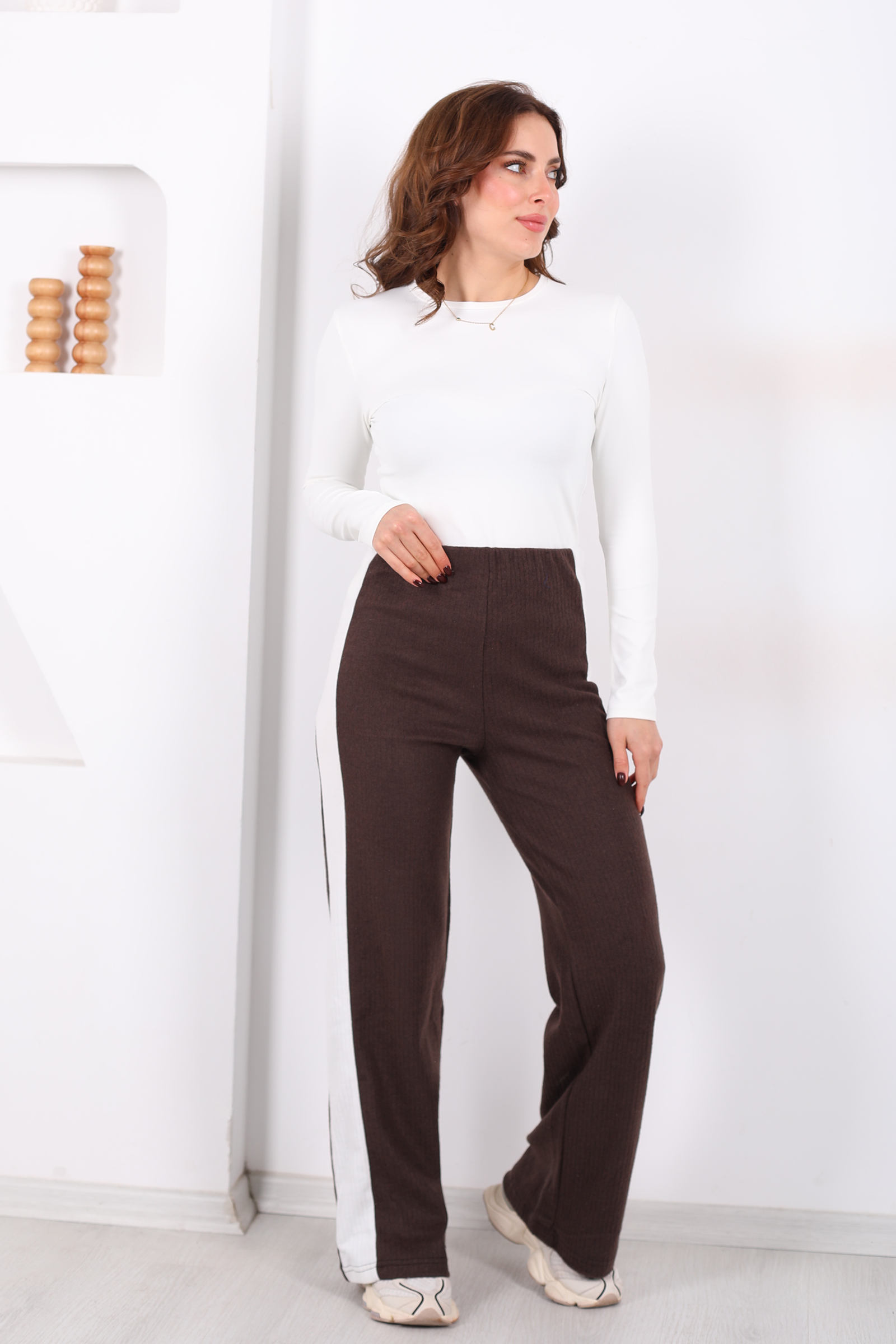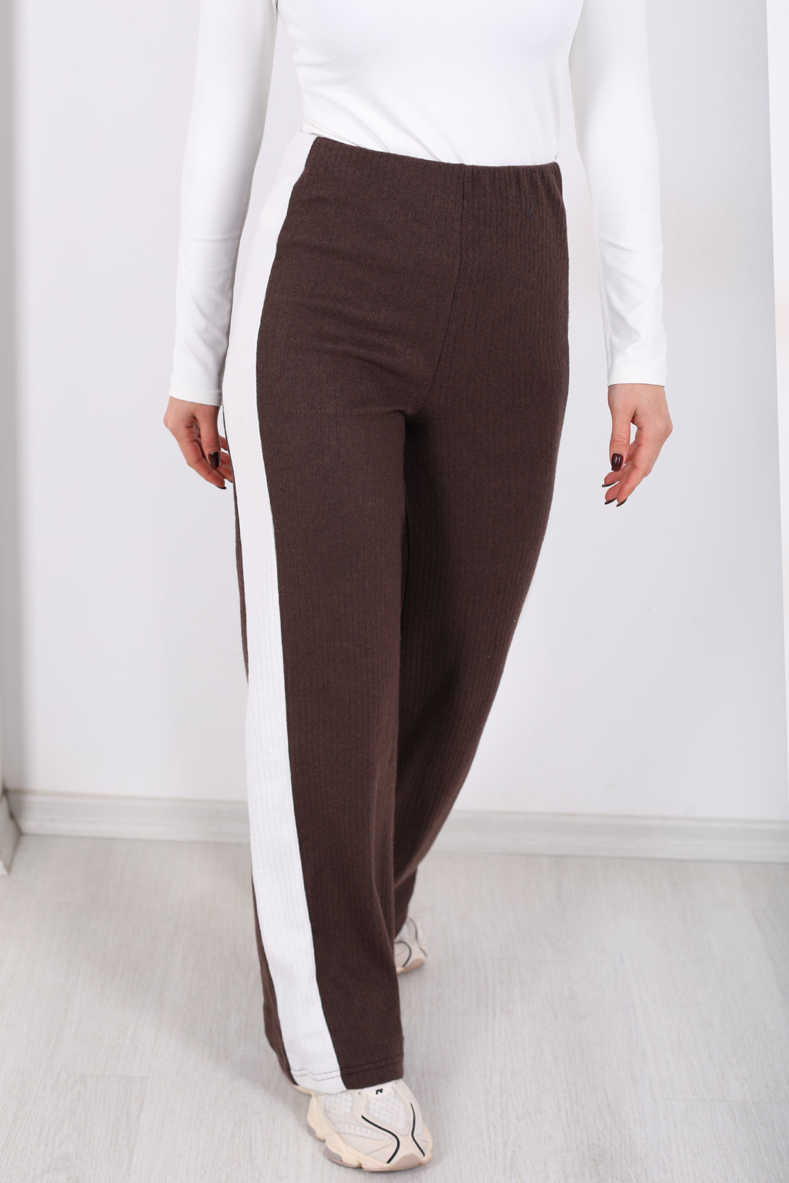 Yanları Şeritli Bol Paça Kahverengi Kadın Yumoş Pantolon