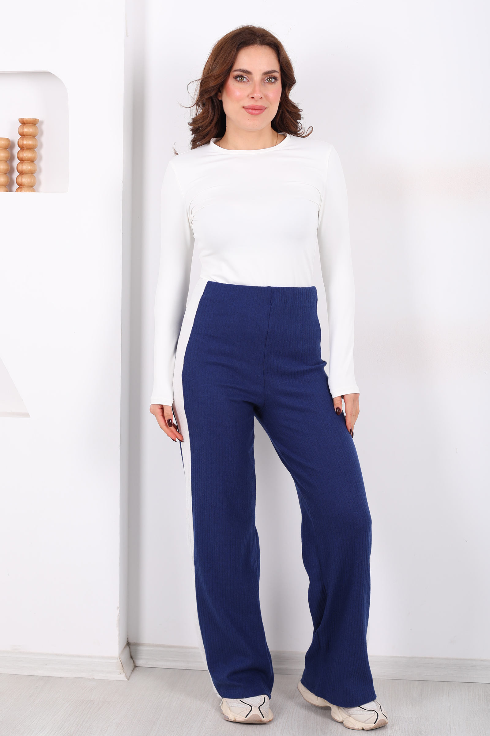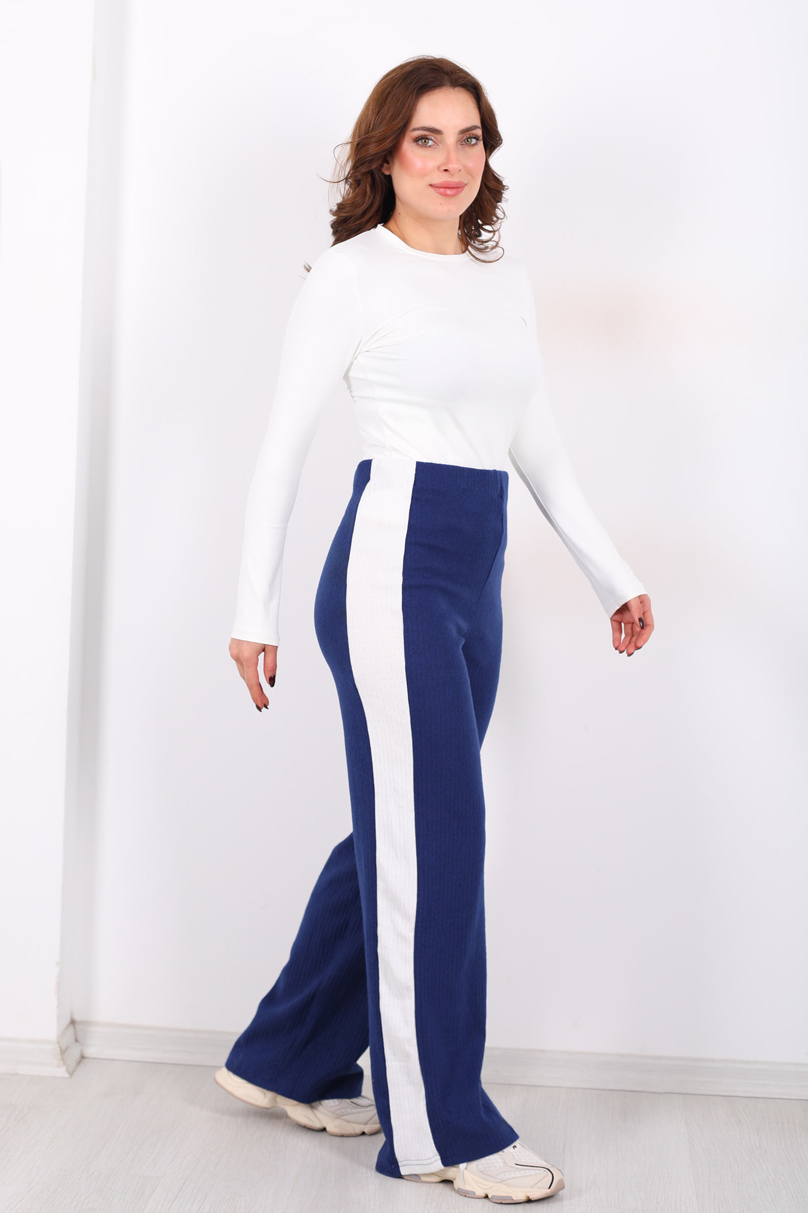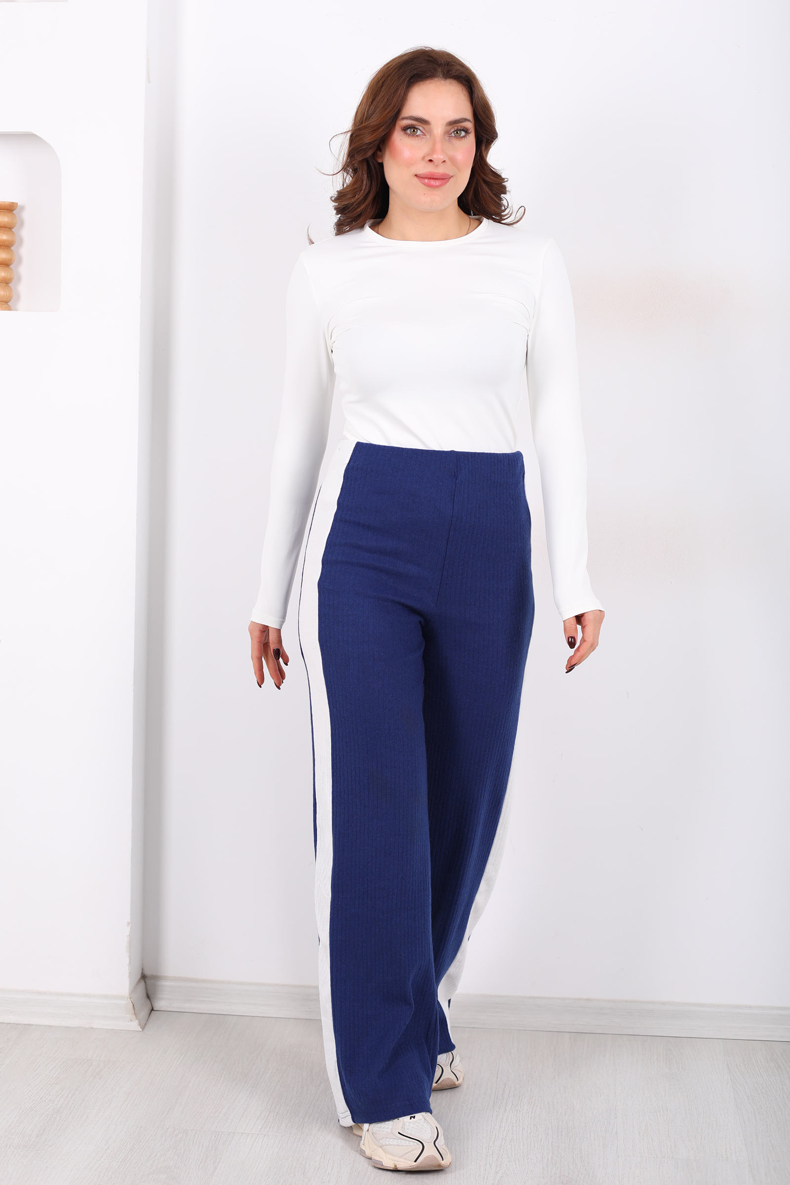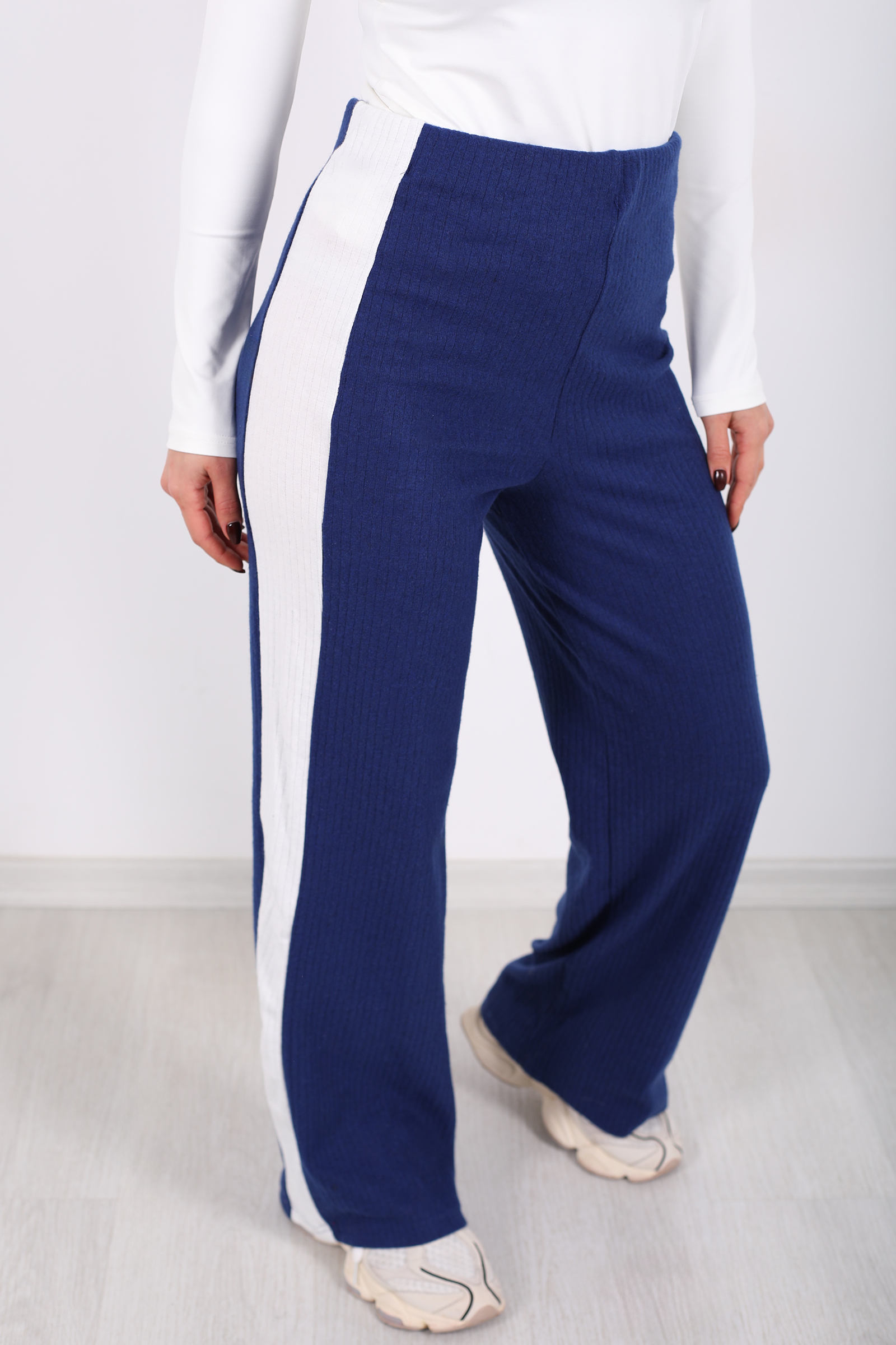 Yanları Şeritli Bol Paça Saks Mavisi Kadın Yumoş Pantolon