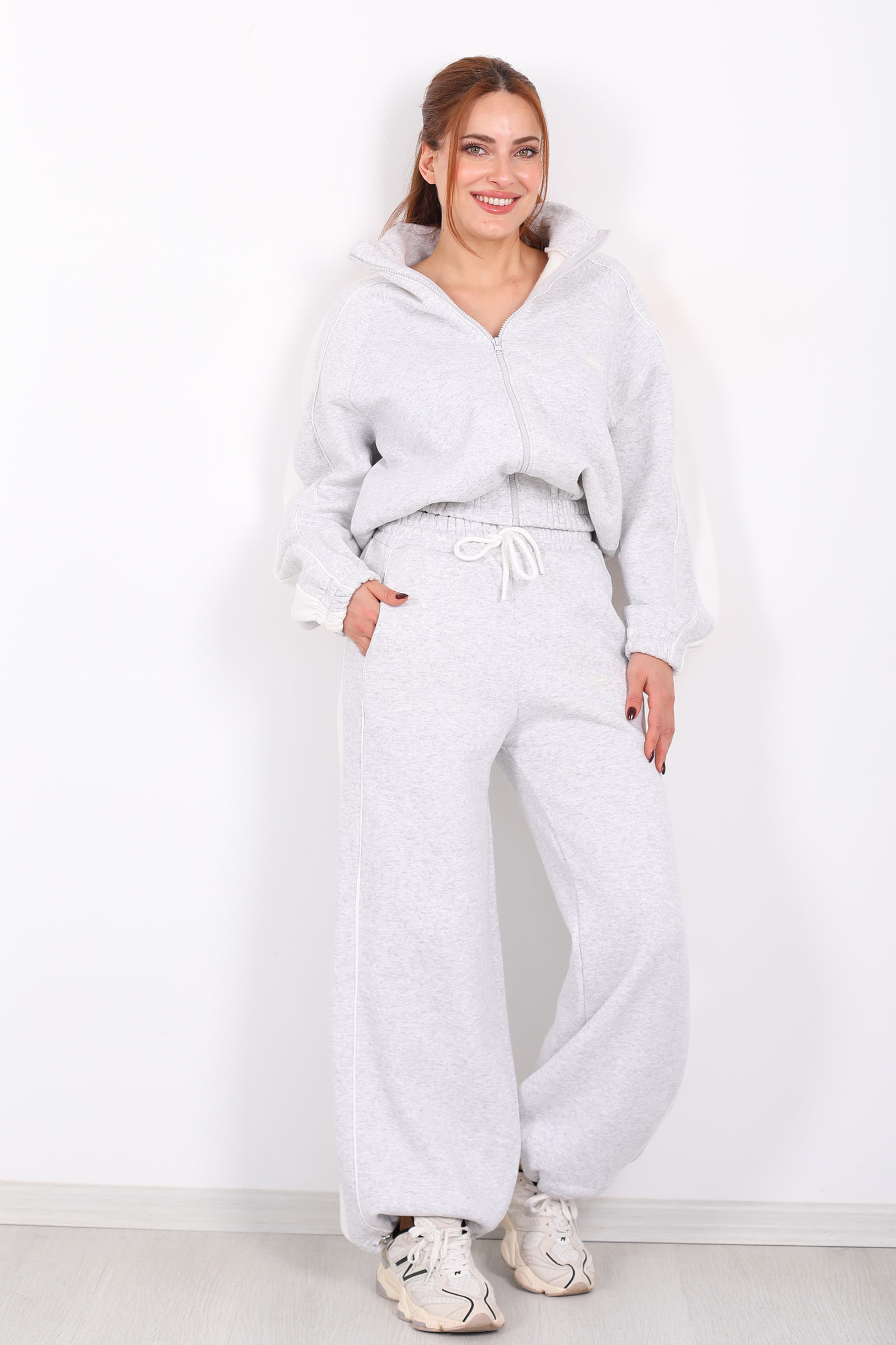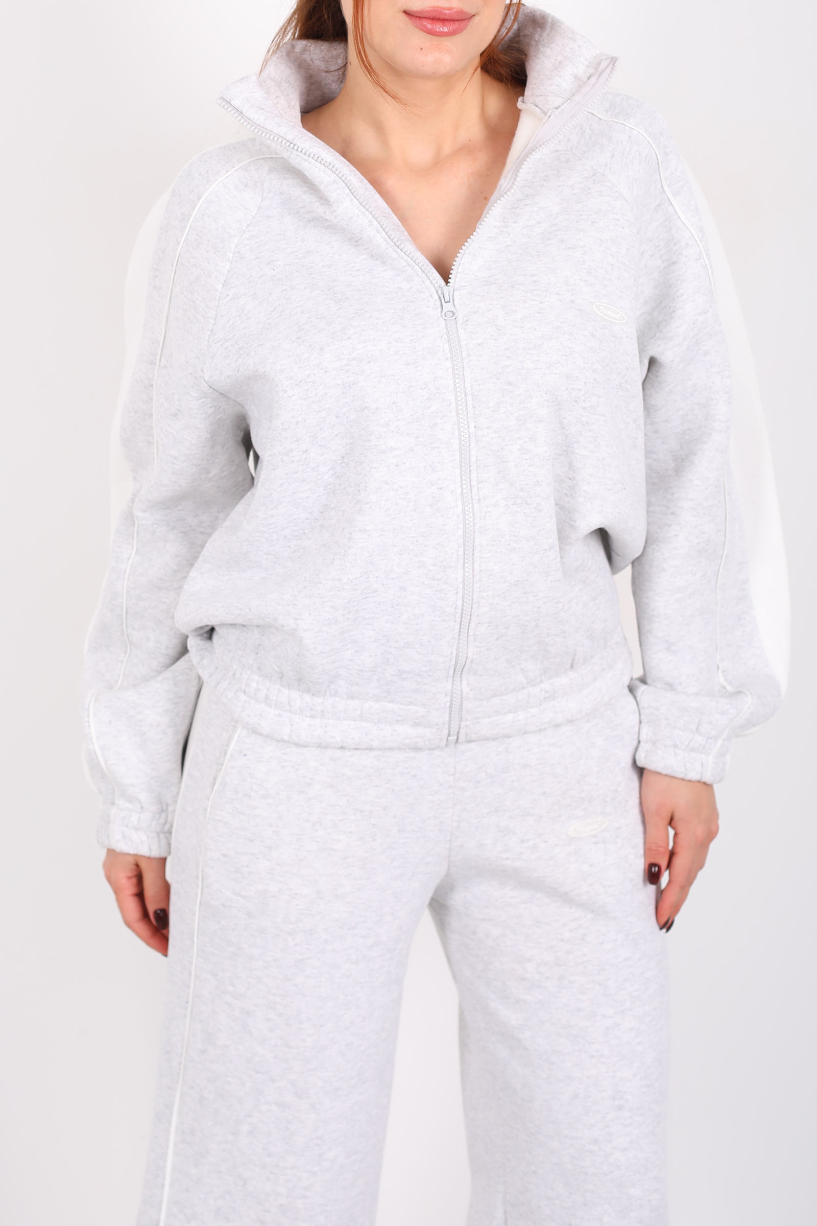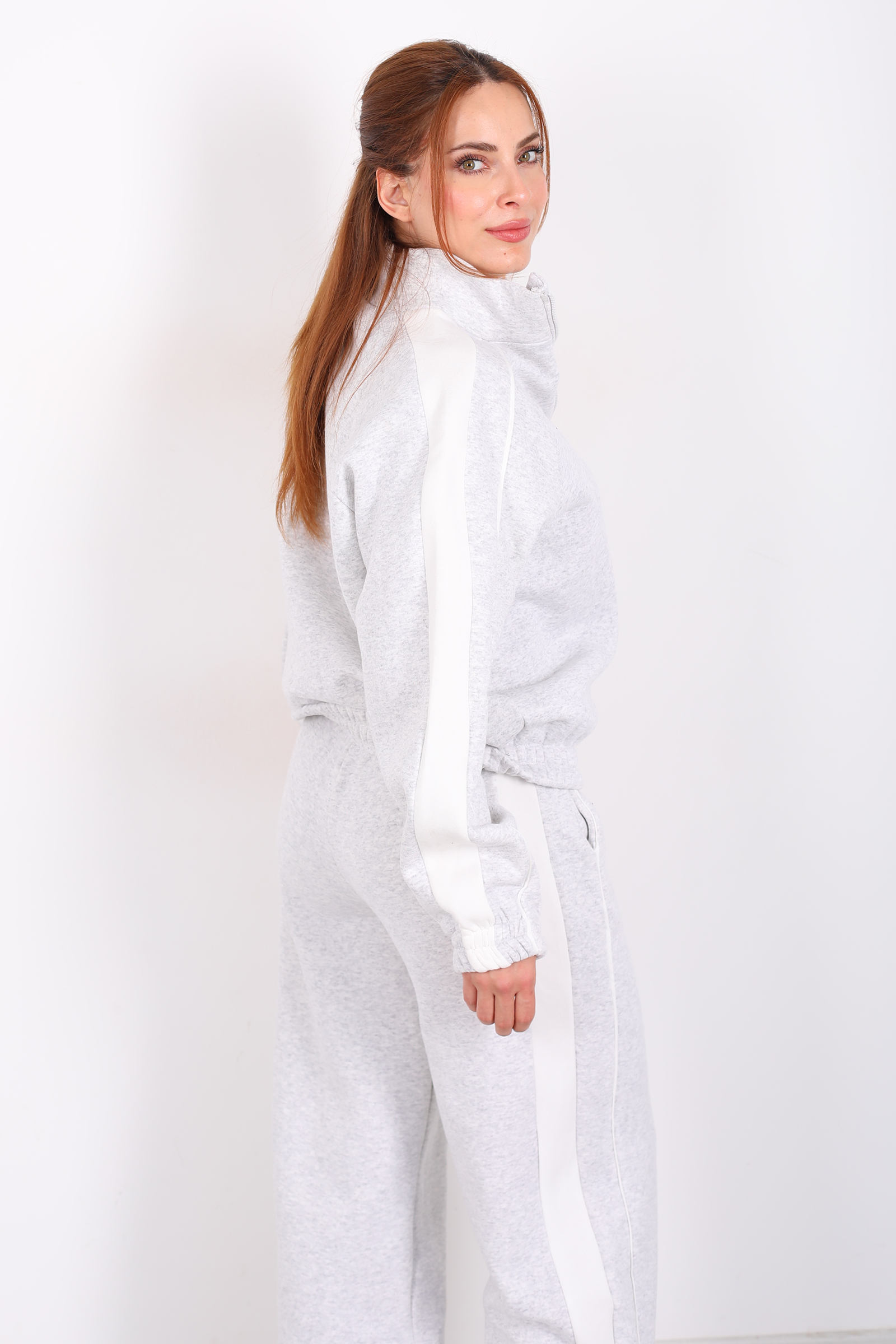 Yanları Şeritli Fermuarlı Gri Kadın Üç İp Takım