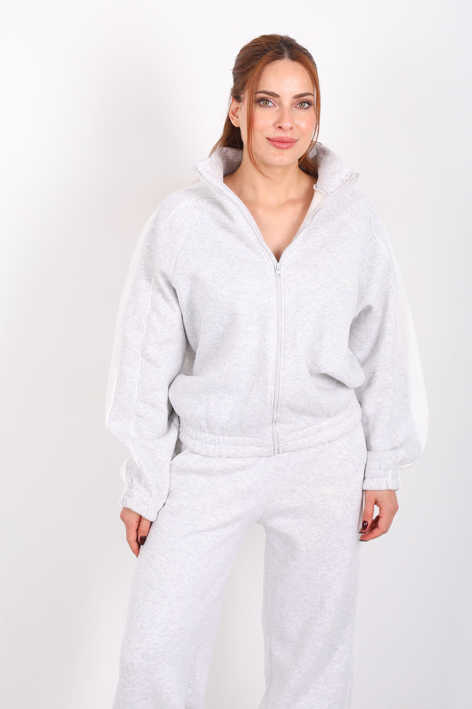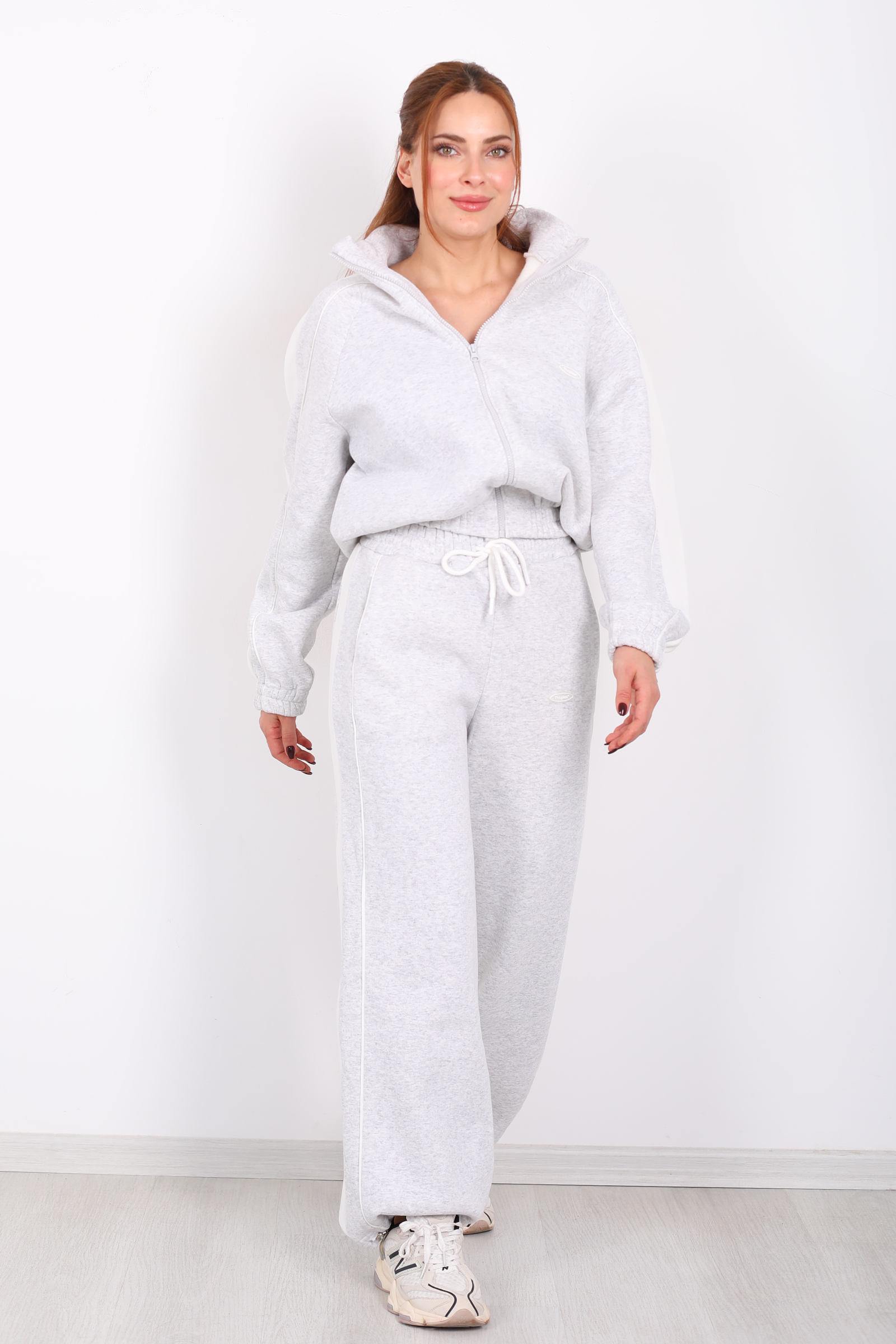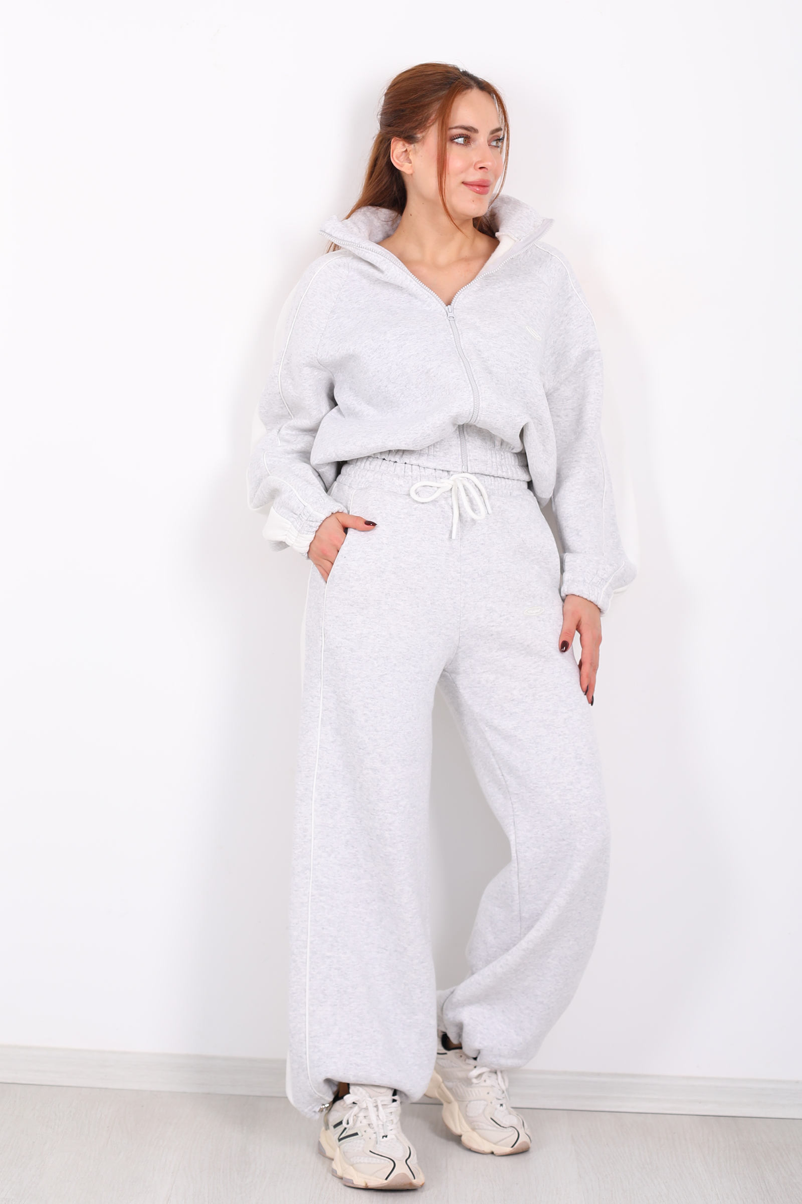 Yanları Şeritli Fermuarlı Gri Kadın Üç İp Takım