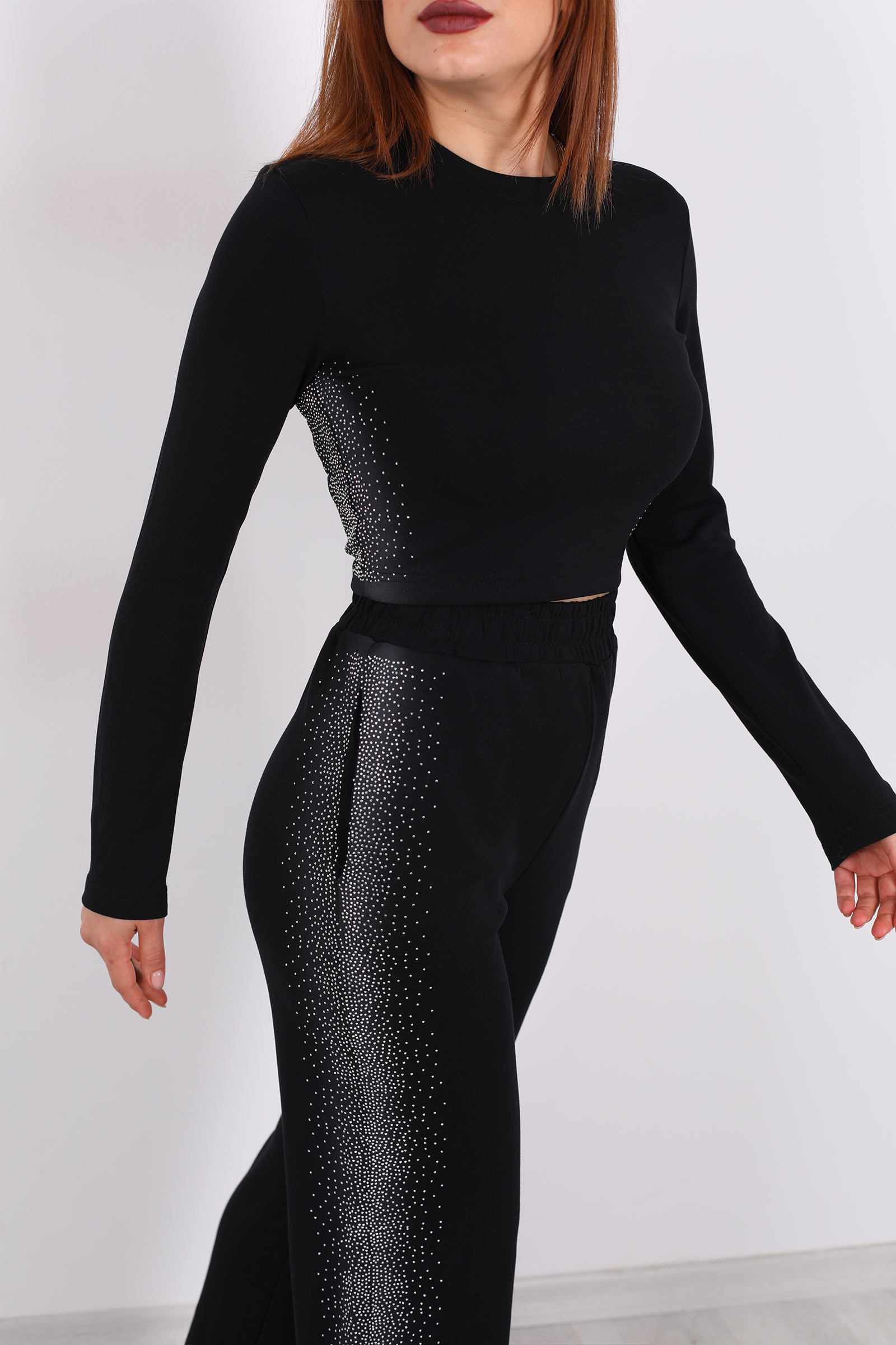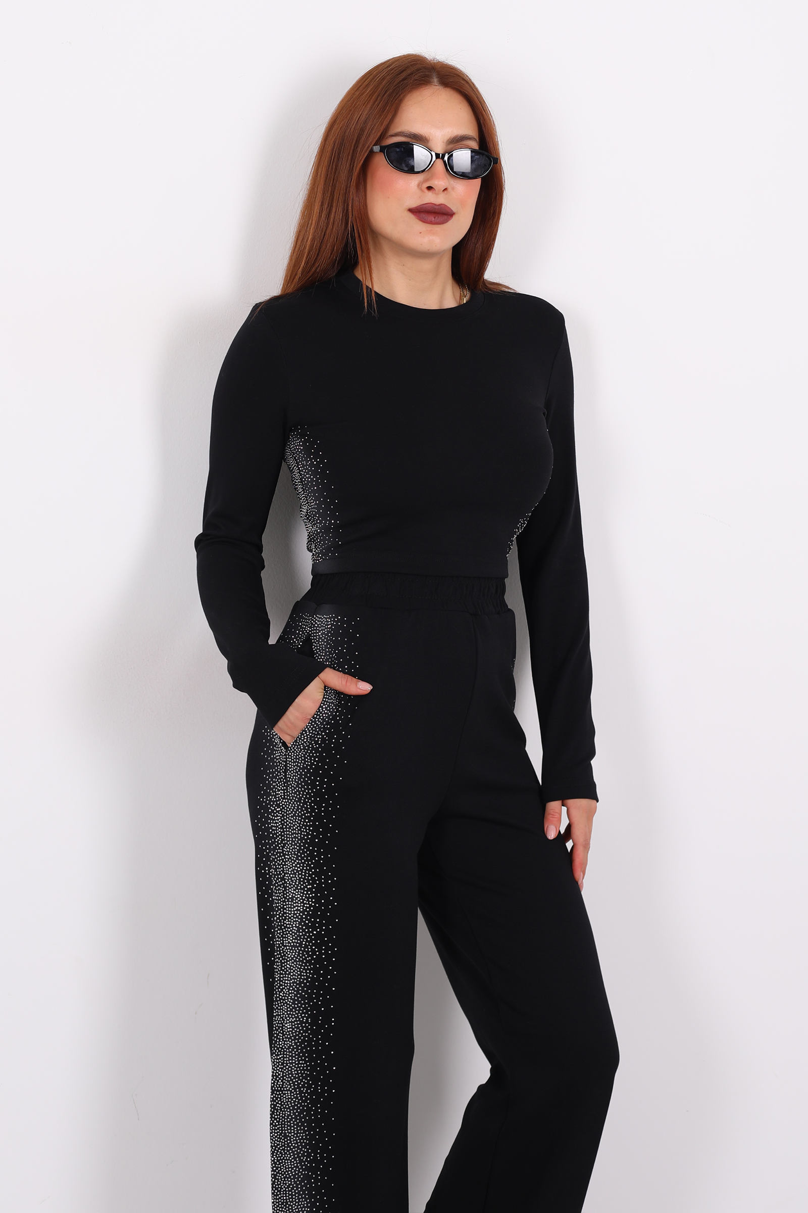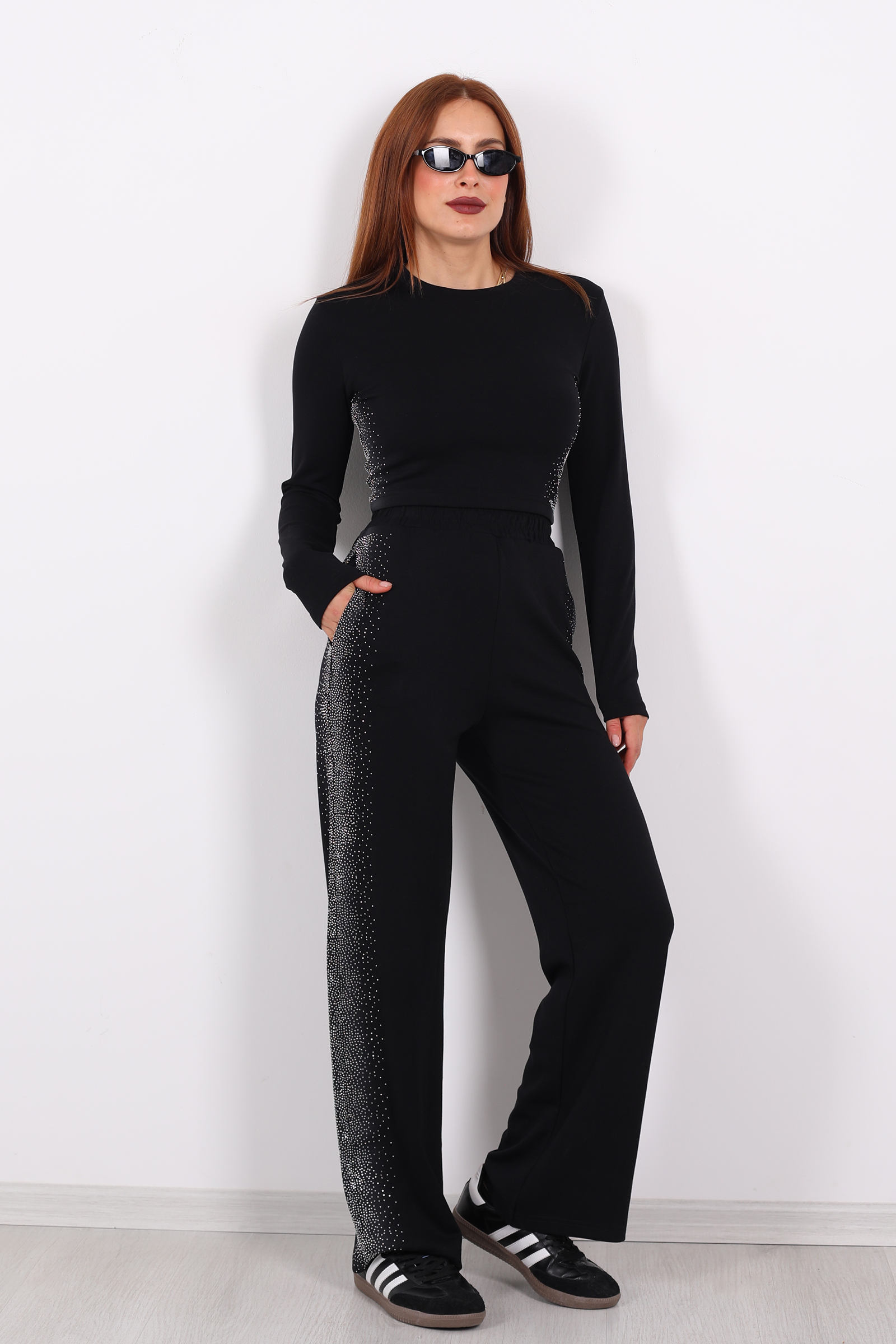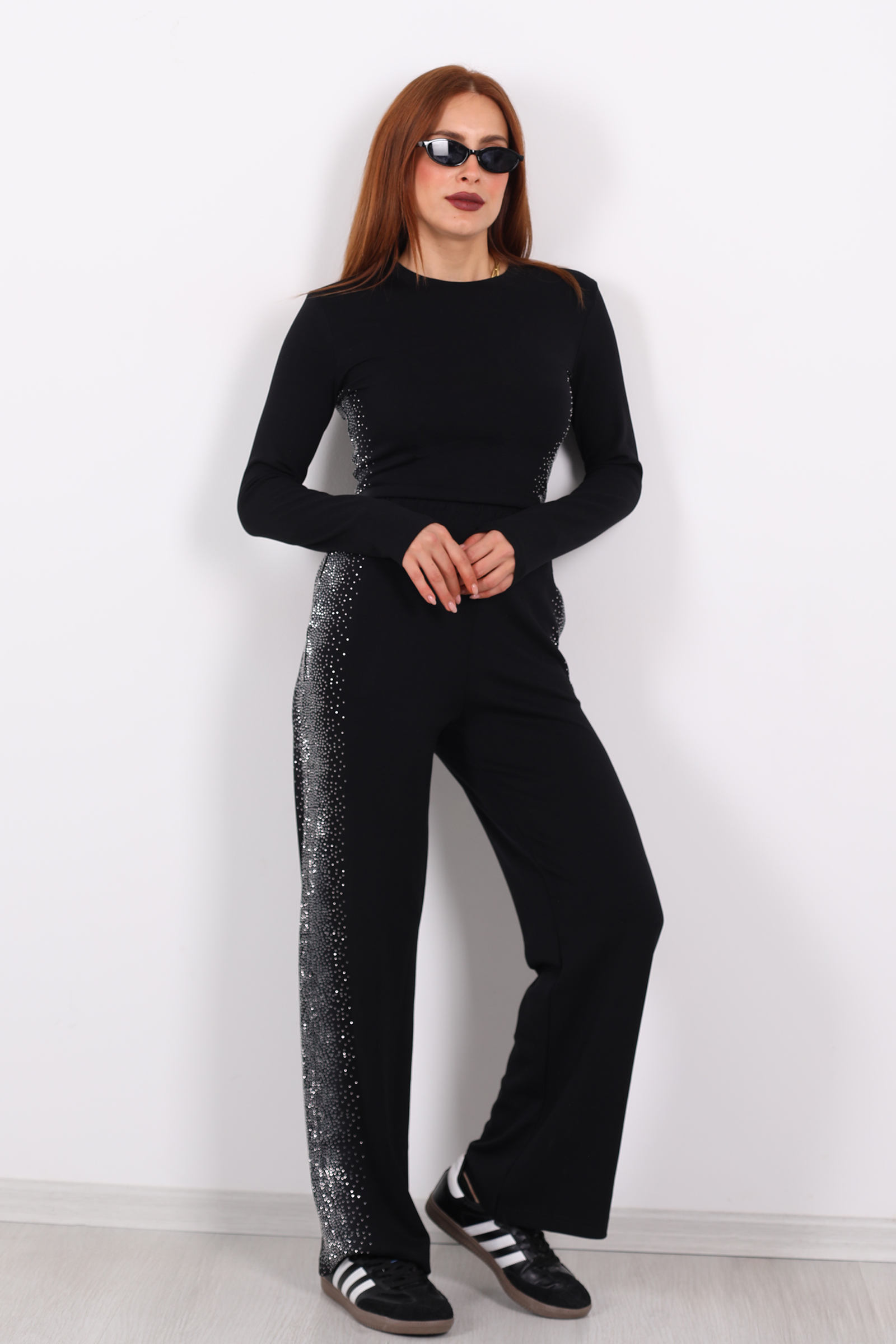 Siyahın şıklığına zarif bir dokunuş kazandırılan bu modal takım, yanlardaki taş işlemeleriyle sade ve parlak bir denge yakalıyor. Takımın üst ve alt parçaları, modal kumaşın ipeksi yumuşaklığı ve hafif akıcılığı ile konforu yüksek bir his sağlıyor. Modal kumaş, nefes alabilen ve nemi ciltten uzaklaştıran yapısıyla hem gün boyu rahatlık sunar.
