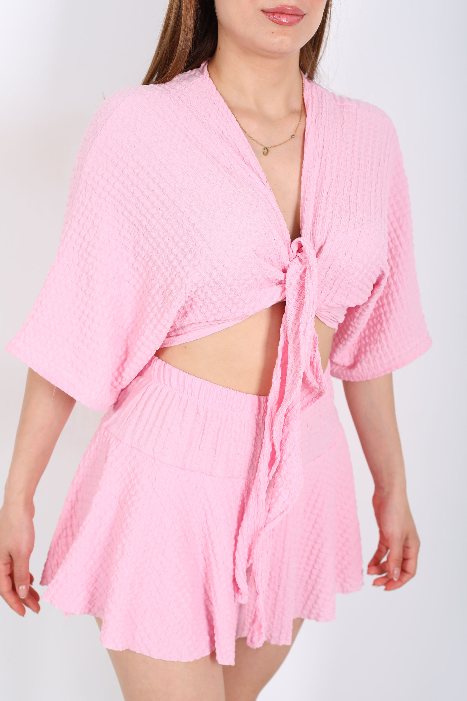 Yarasa Kol Bağlamalı Pembe Kadın Bubble Bluz