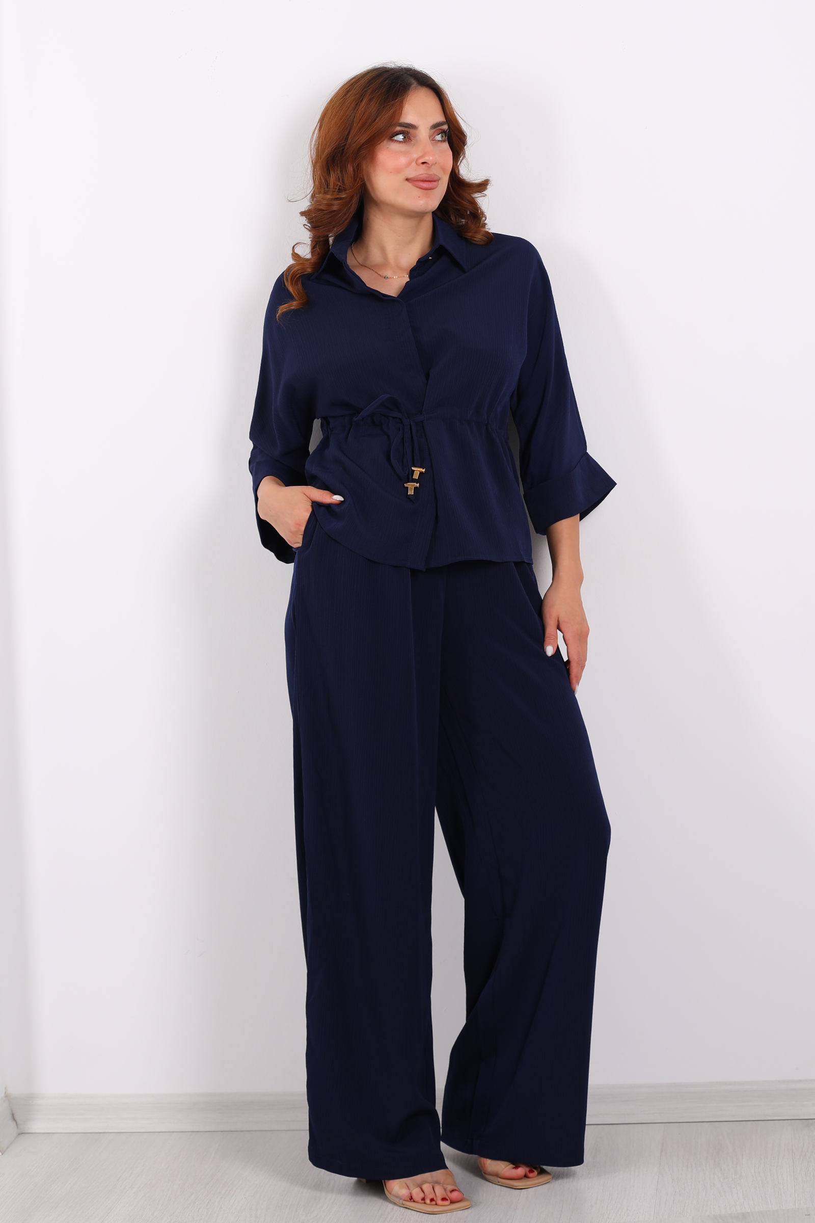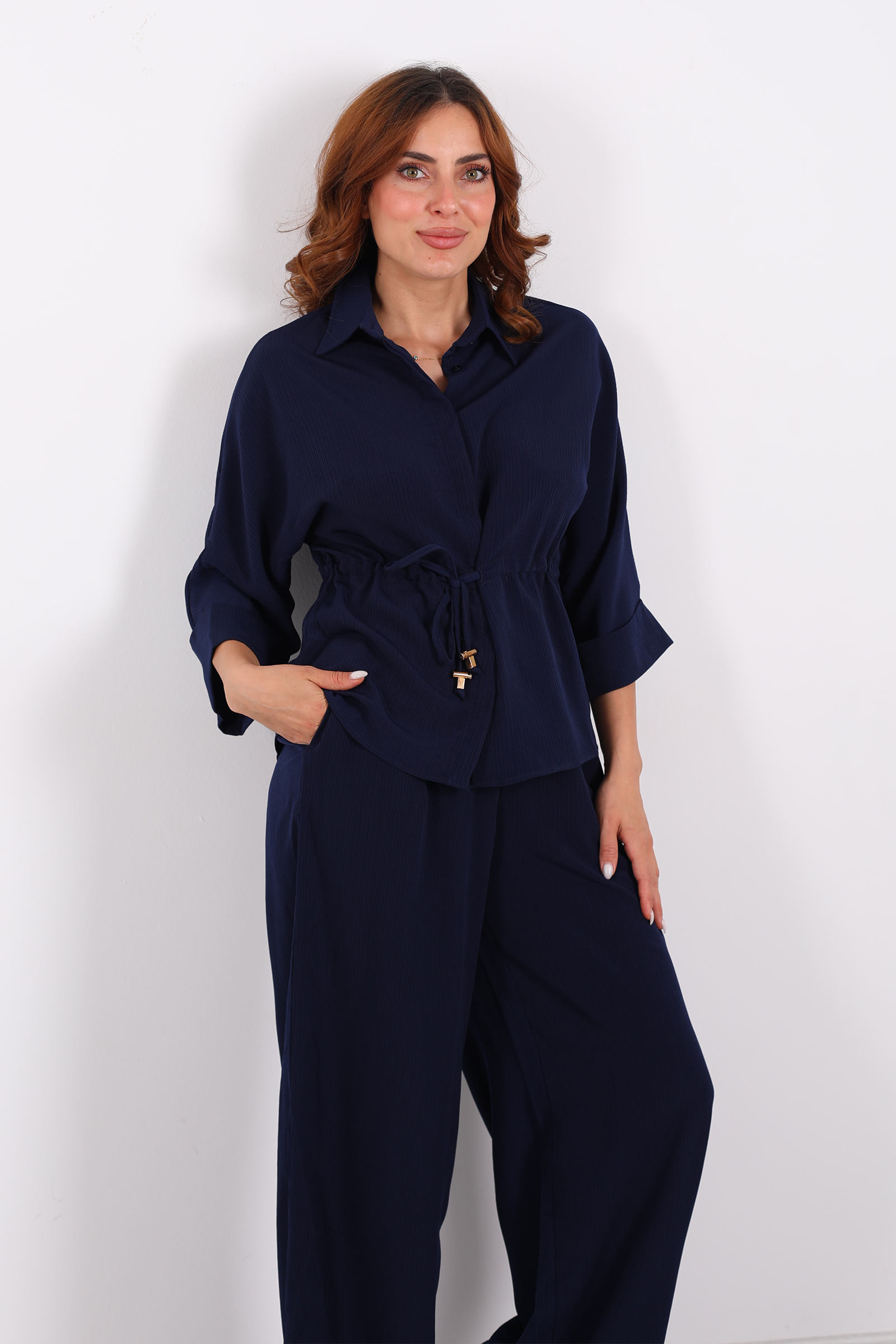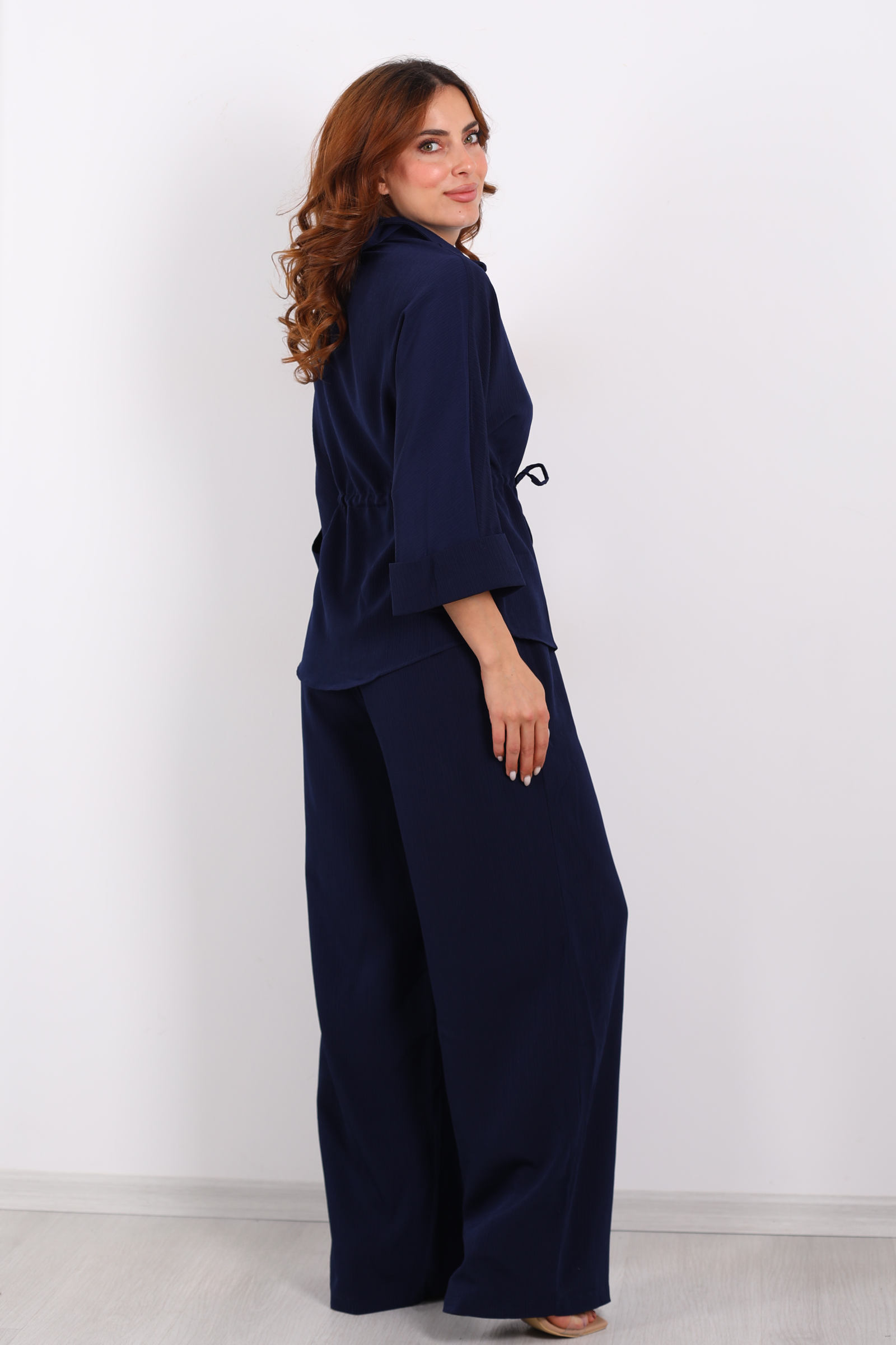 Sergilediği salaş kesim ve bağcık detayıyla öne çıkan bu takım, lacivert tonunun derinliğiyle stilinize sofistike bir dokunuş getiriyor. Yarasa kolları, omuz çizgisinden aşağı doğru dökümlü bir yapı sunarken bedeninizi sıkmadan akan formuyla konforu artırıyor. Bel bağcığı sayesinde bele kavuşan siluet, alt parçanın uzun İspanyol paçası ile birlikte hem şıklık hem hareket özgürlüğü sağlar.Polyester kumaş dokusunun hafifliği ve esnek olmaması, takımın formunu korurken günlük aktivitelerinizde pratikliği korur.