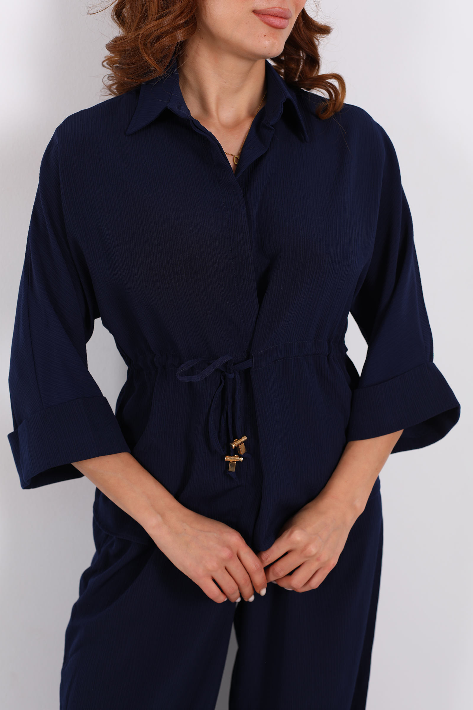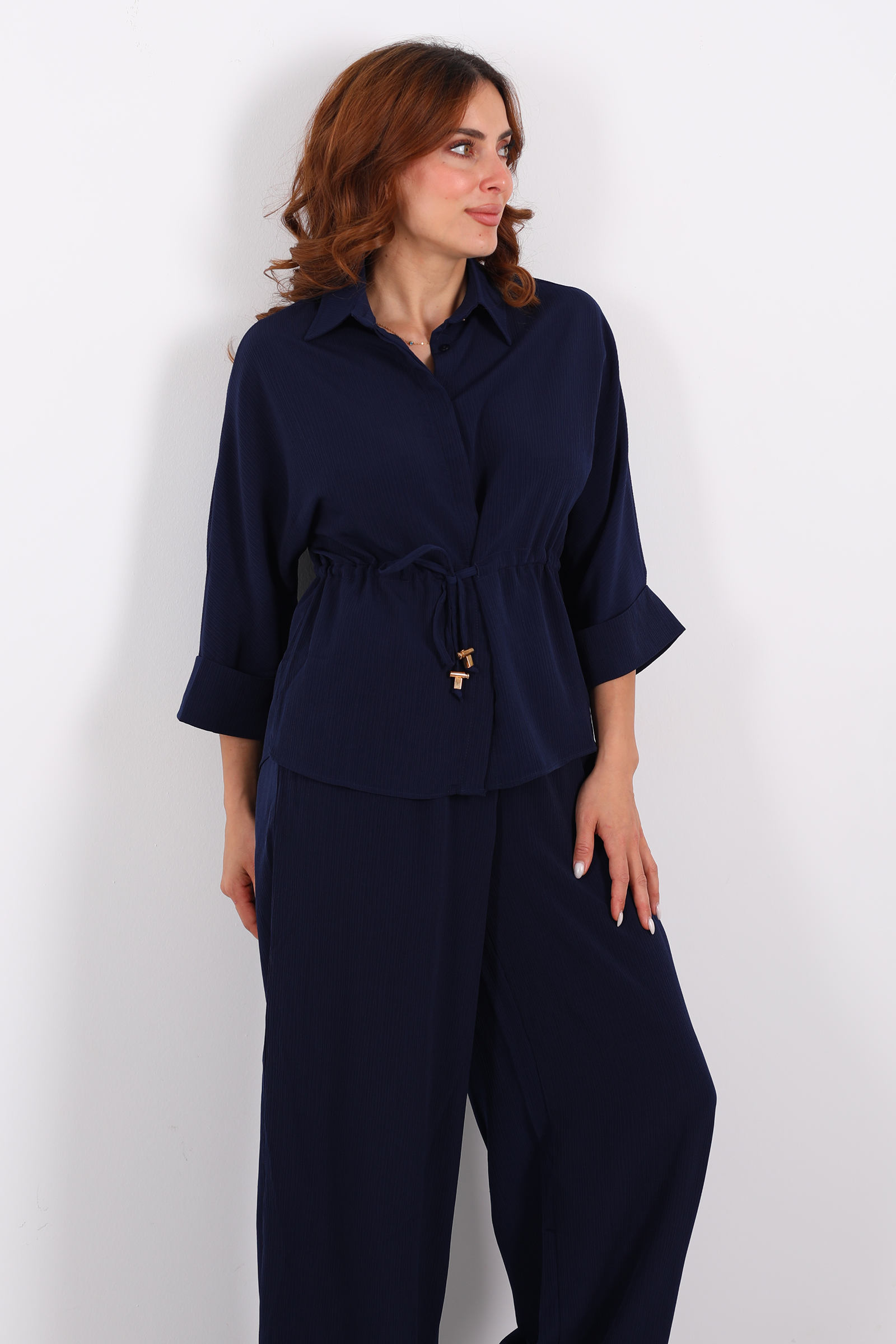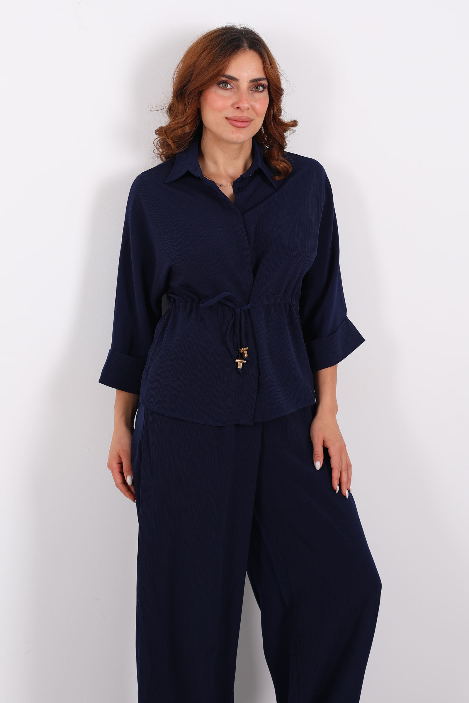 Sergilediği salaş kesim ve bağcık detayıyla öne çıkan bu takım, lacivert tonunun derinliğiyle stilinize sofistike bir dokunuş getiriyor. Yarasa kolları, omuz çizgisinden aşağı doğru dökümlü bir yapı sunarken bedeninizi sıkmadan akan formuyla konforu artırıyor. Bel bağcığı sayesinde bele kavuşan siluet, alt parçanın uzun İspanyol paçası ile birlikte hem şıklık hem hareket özgürlüğü sağlar.Polyester kumaş dokusunun hafifliği ve esnek olmaması, takımın formunu korurken günlük aktivitelerinizde pratikliği korur.