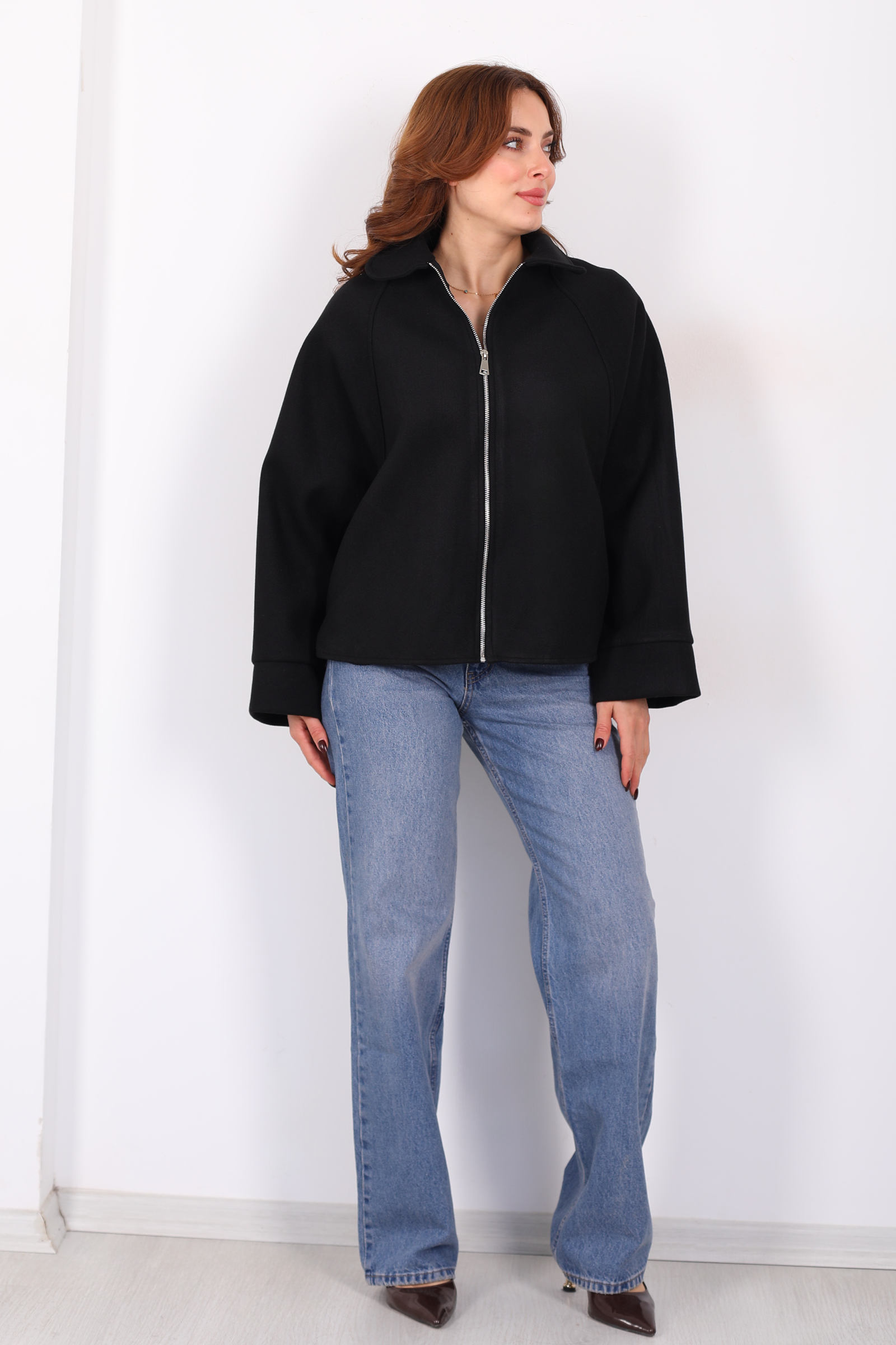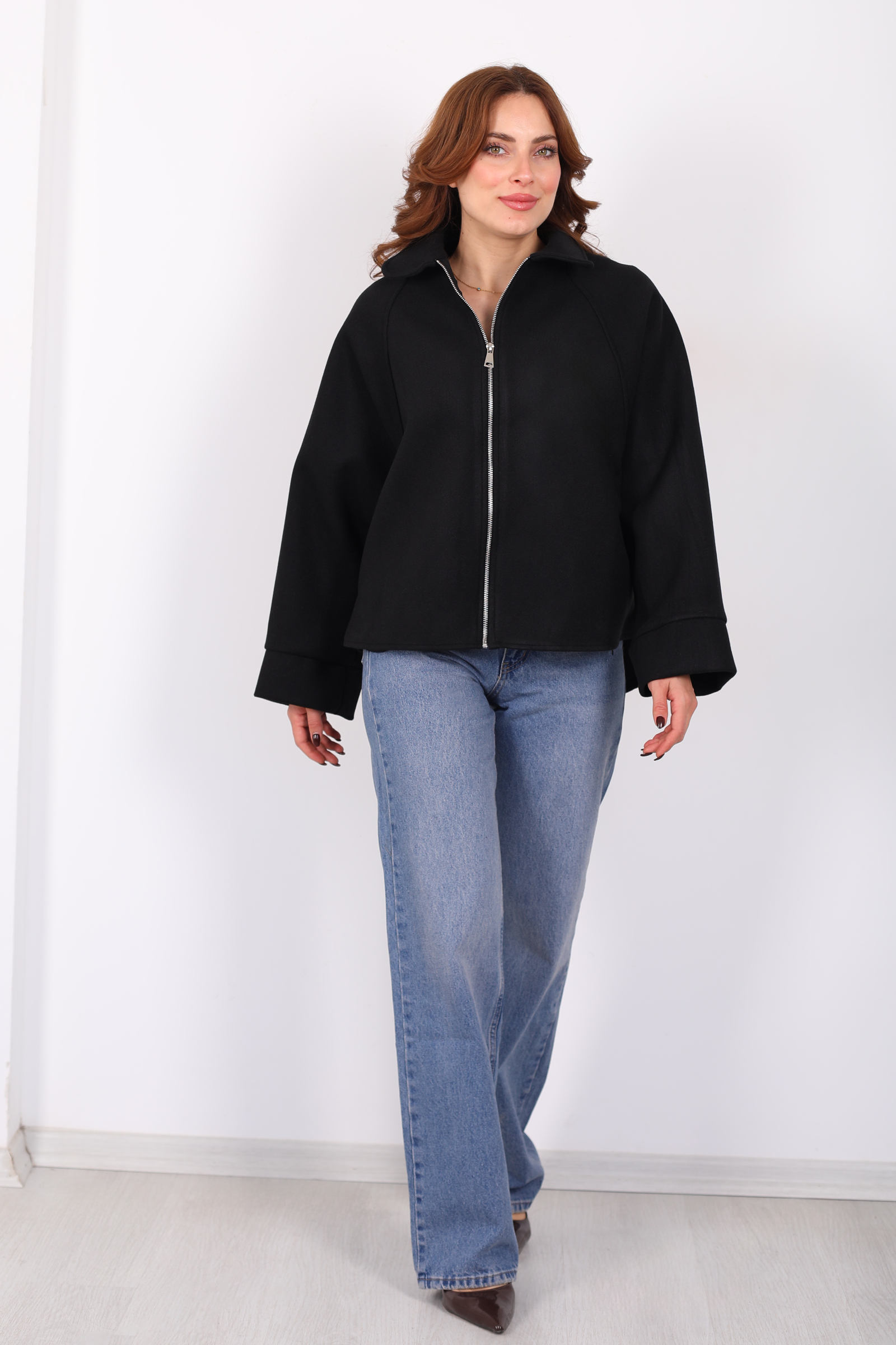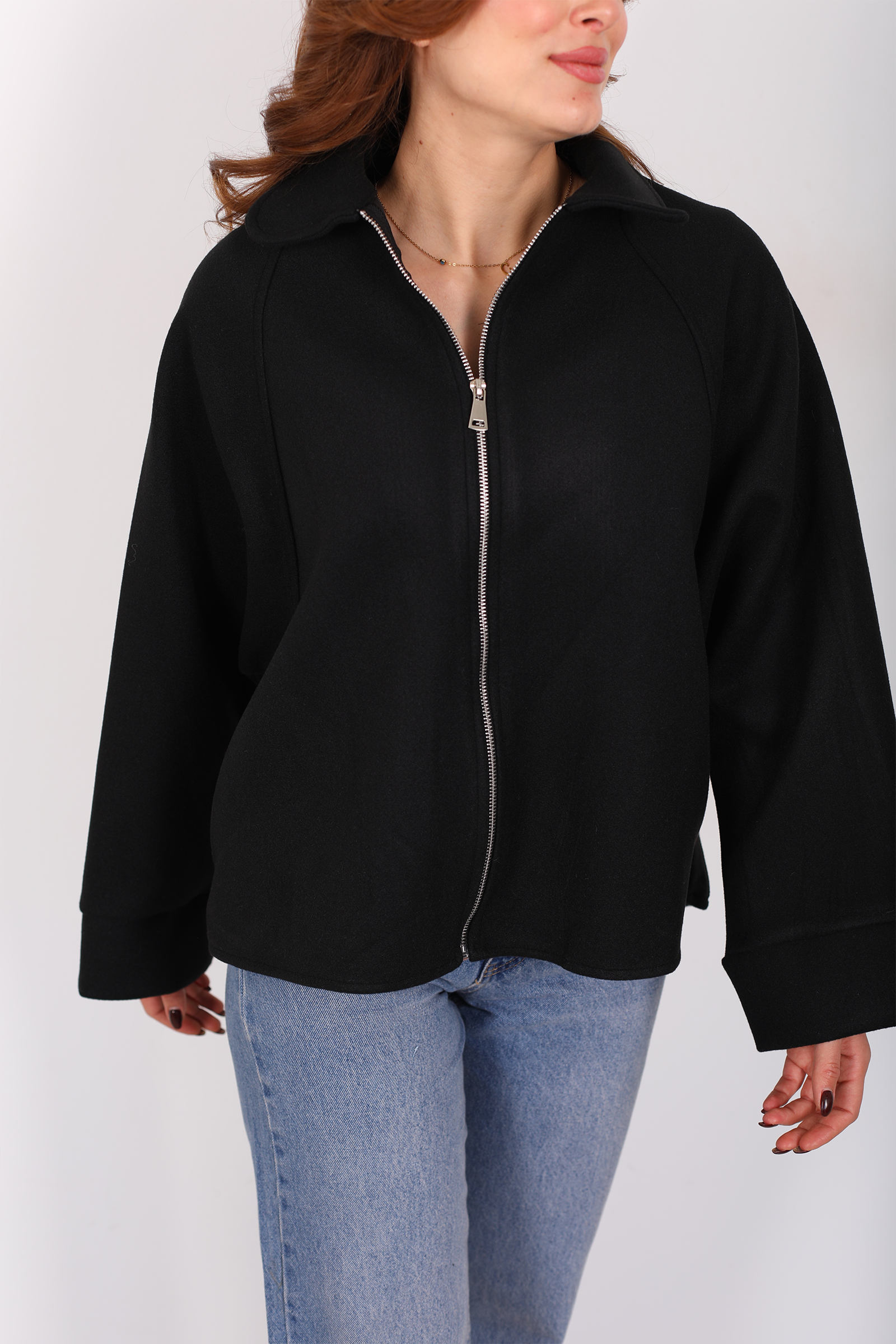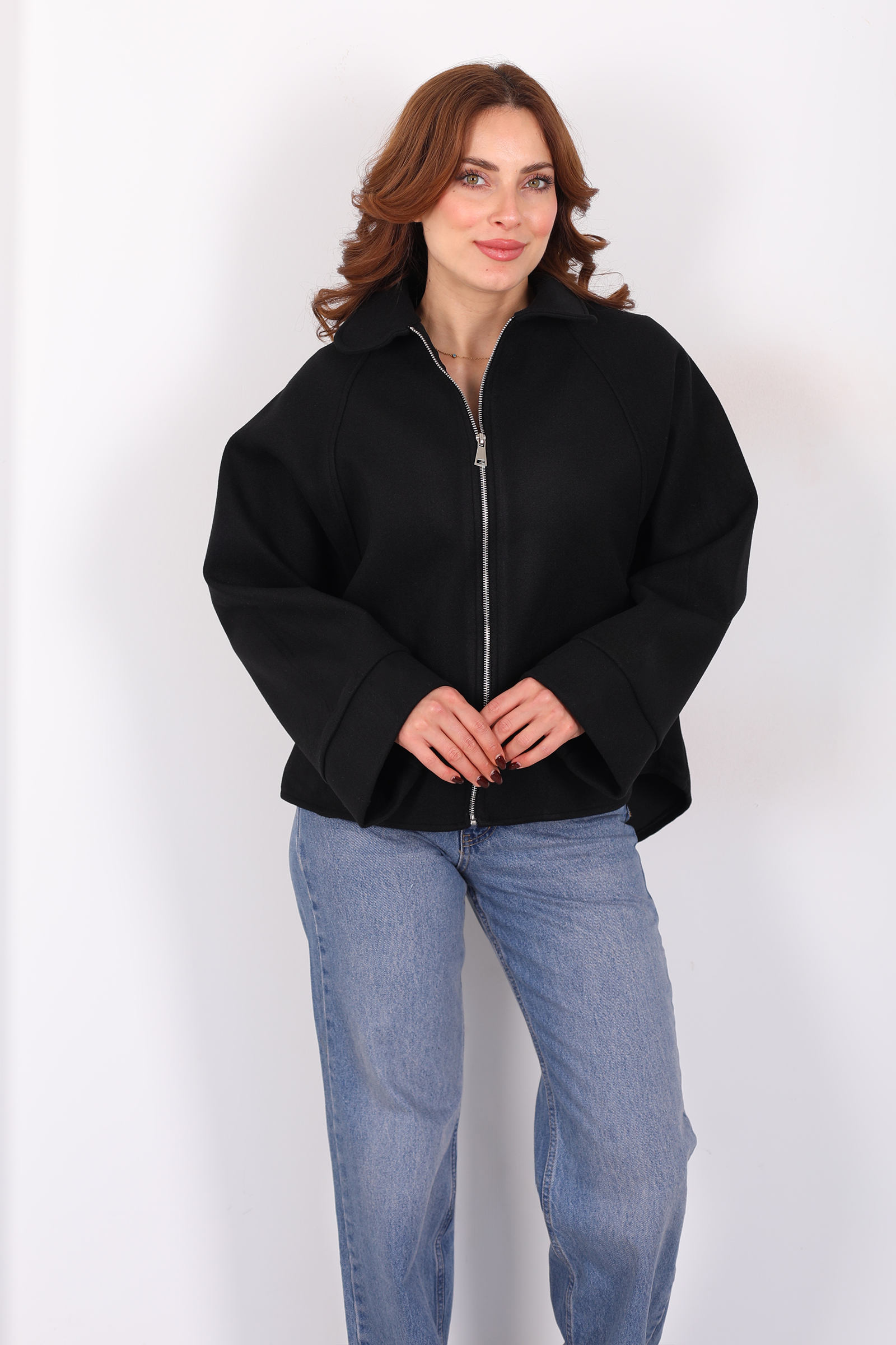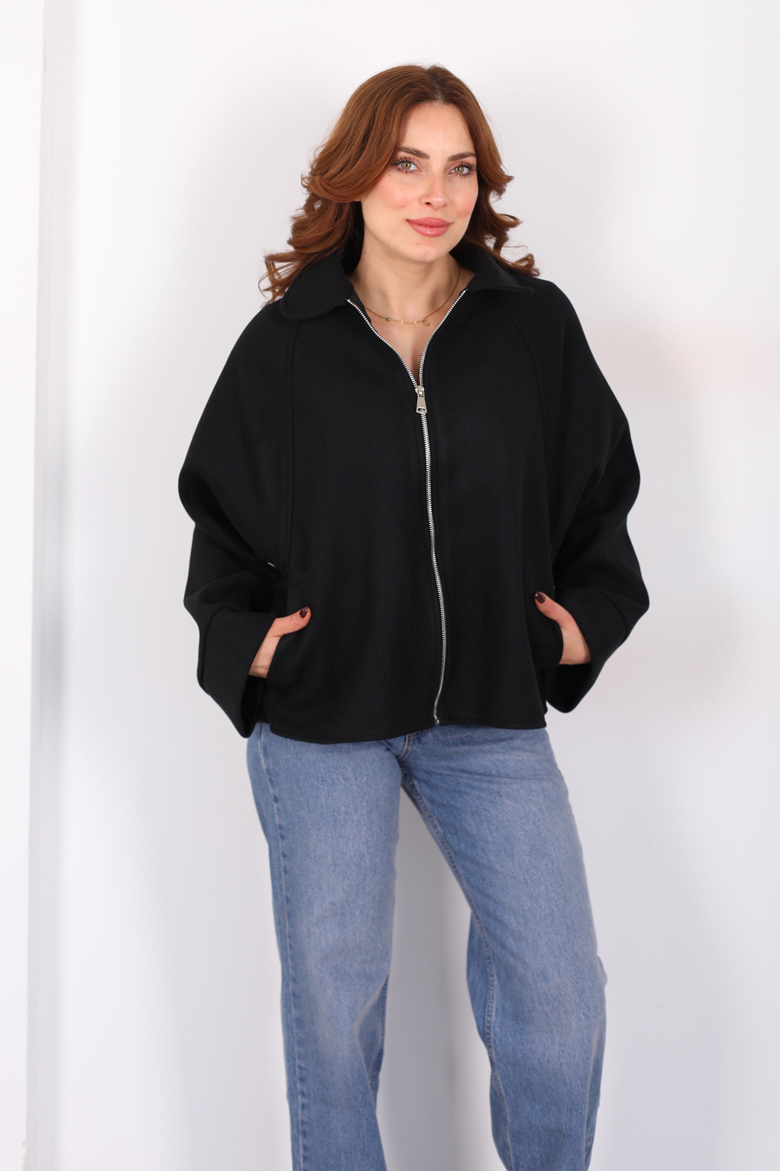 Yarasa kol kesimiyle hareketlenen bu siyah kaşe ceket, hem modern çizgiyi hem de fonksiyonel stili bir arada sunuyor. Fermuar detaylı ön kapama, sade dış giyime sportif bir vurgu getirirken ceketin akışkan silueti omuzlardan bele doğru dengeli bir form oluşturur. Kaşe kumaşın sıcak ve dokusal yapısı soğuk günlerde konfor sağlarken siyah tonuyla da hemen her alt giyimle zarif bir uyum yakalayabilir. Jean ya da kumaş pantolonlarla bütünleşen bu parça, günlük kombinlerini sofistike bir çizgiyle tamamlar.