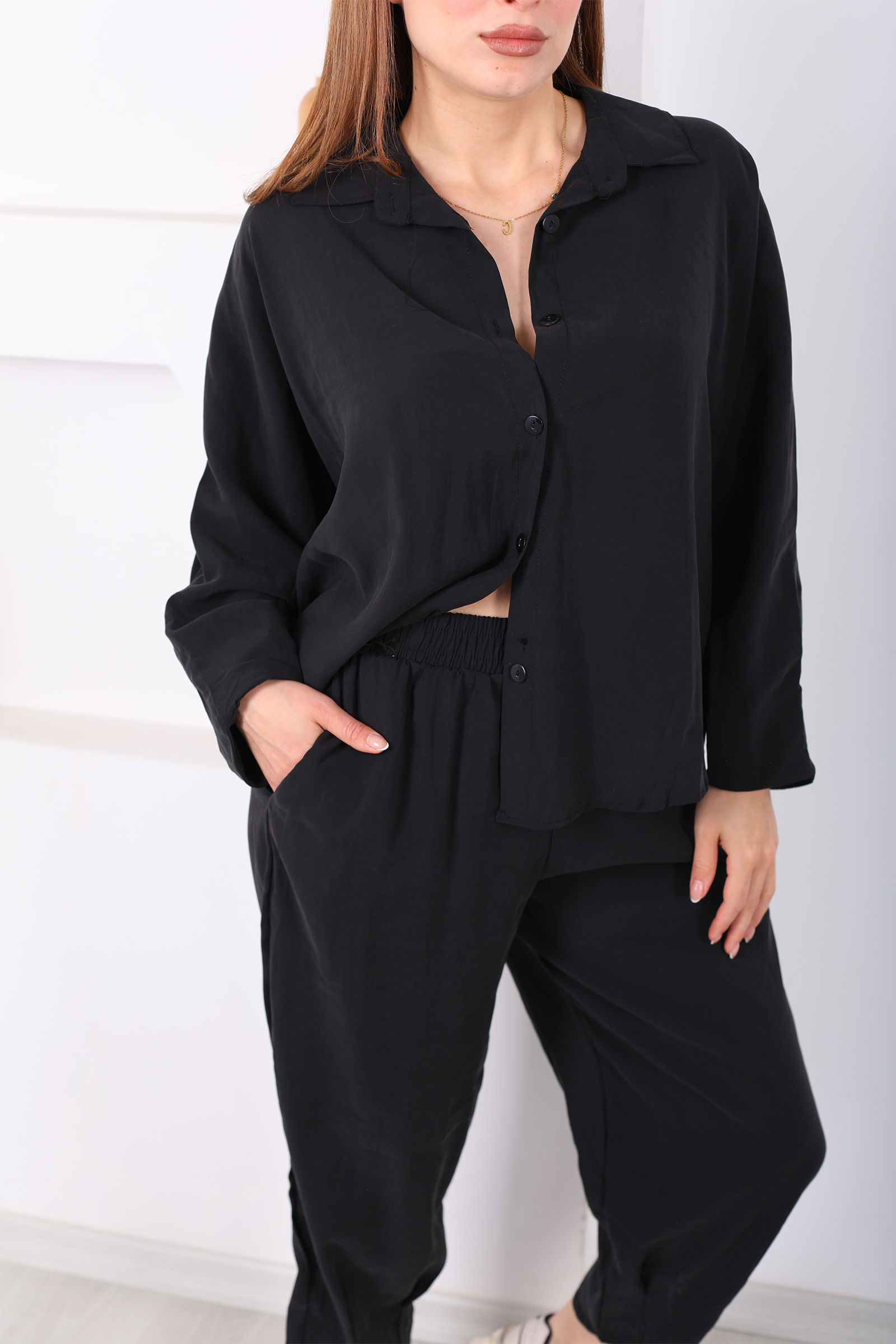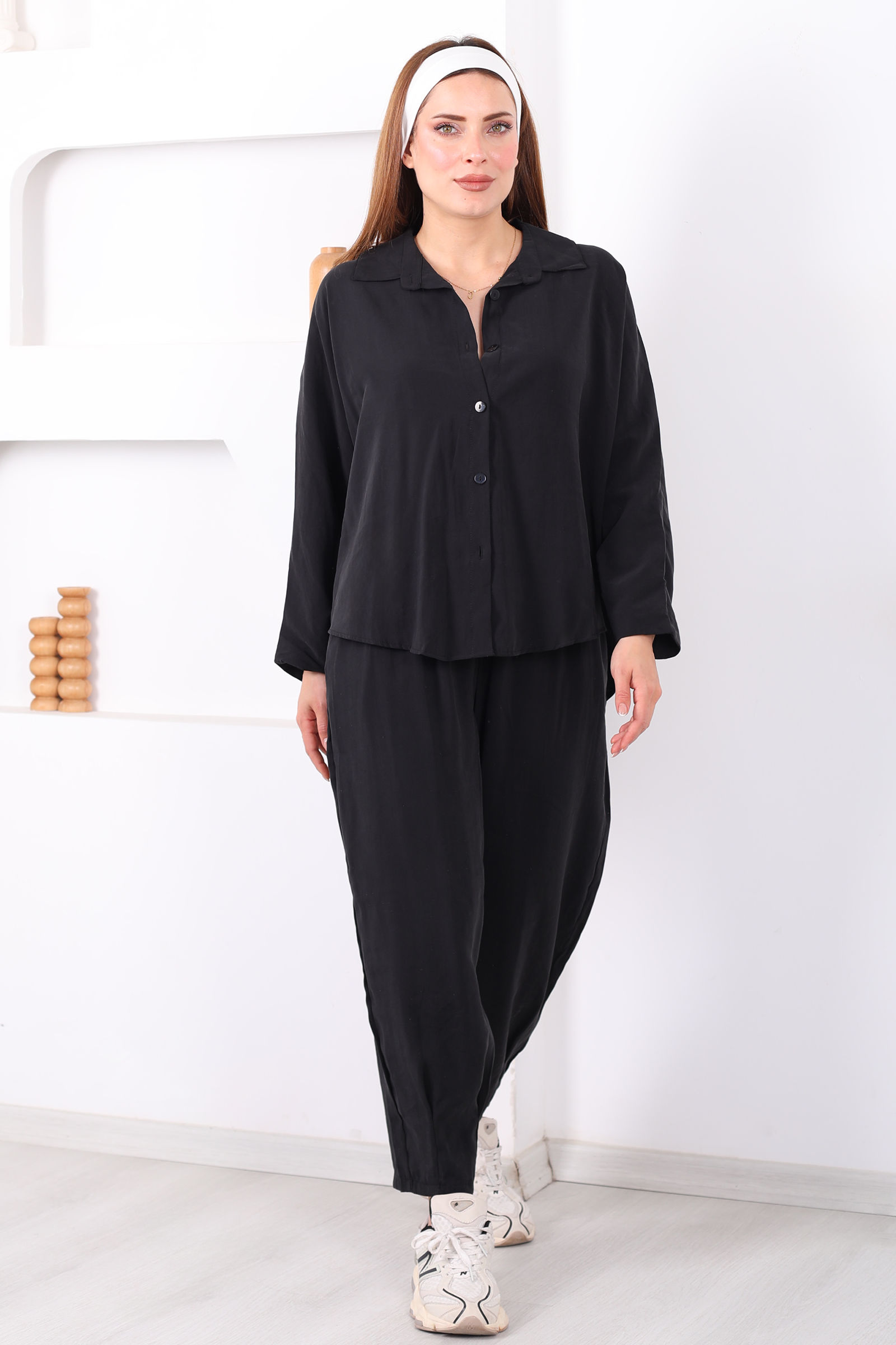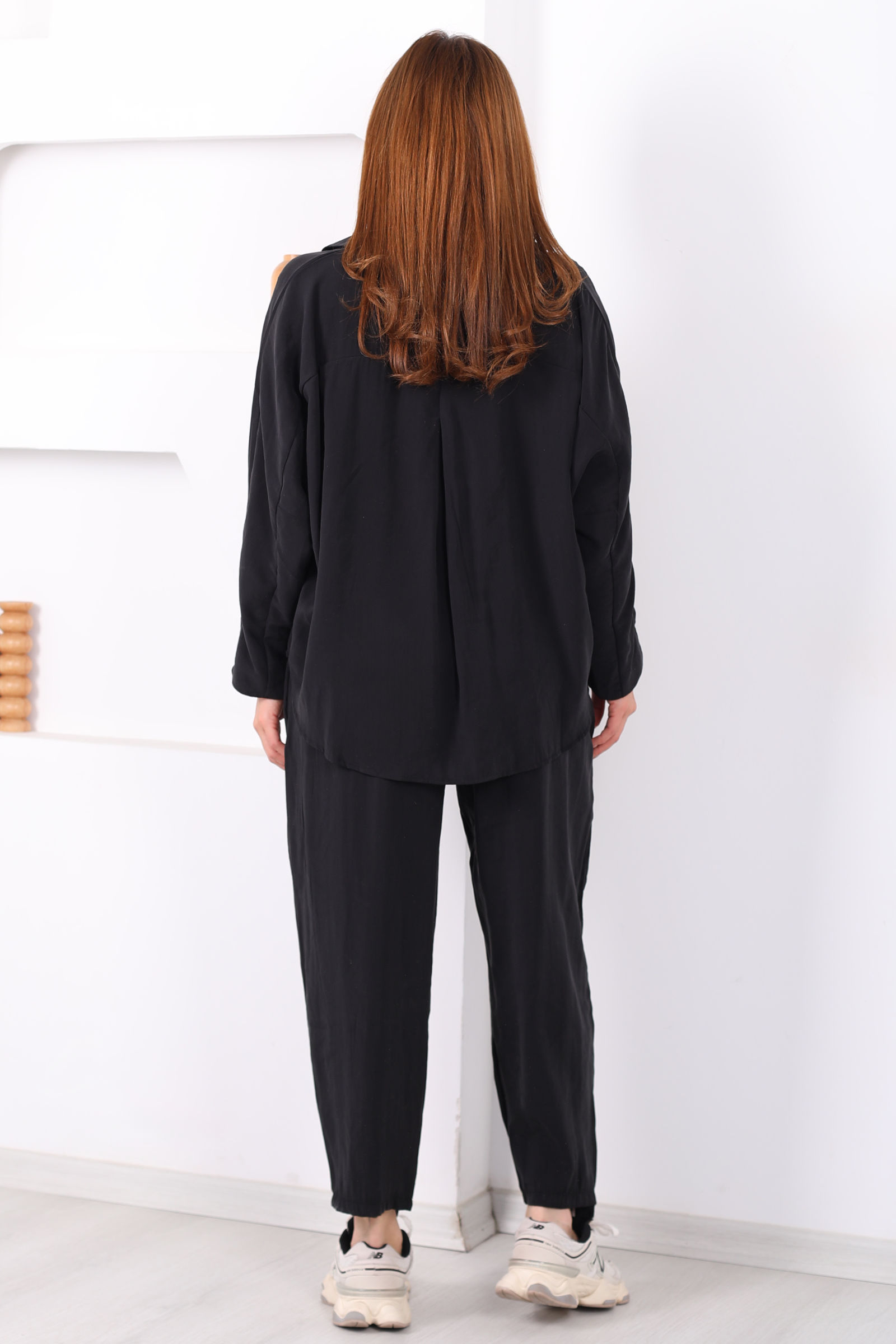 Yarasa Kol Gömlek Cepli Siyah Kadın Şalvar Takım