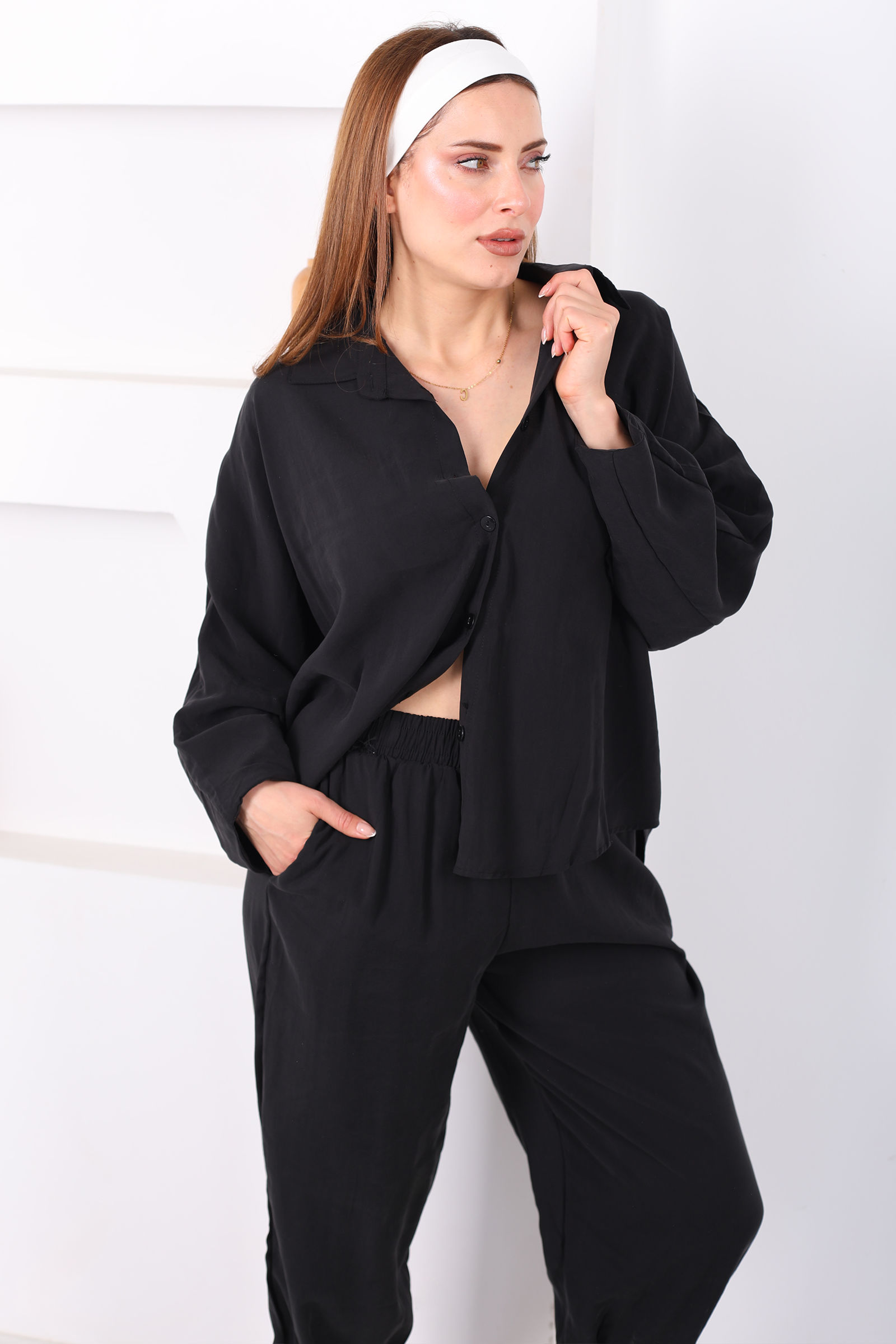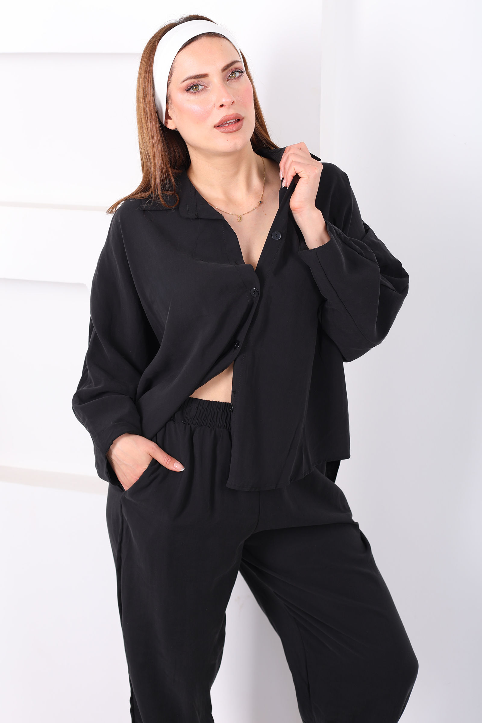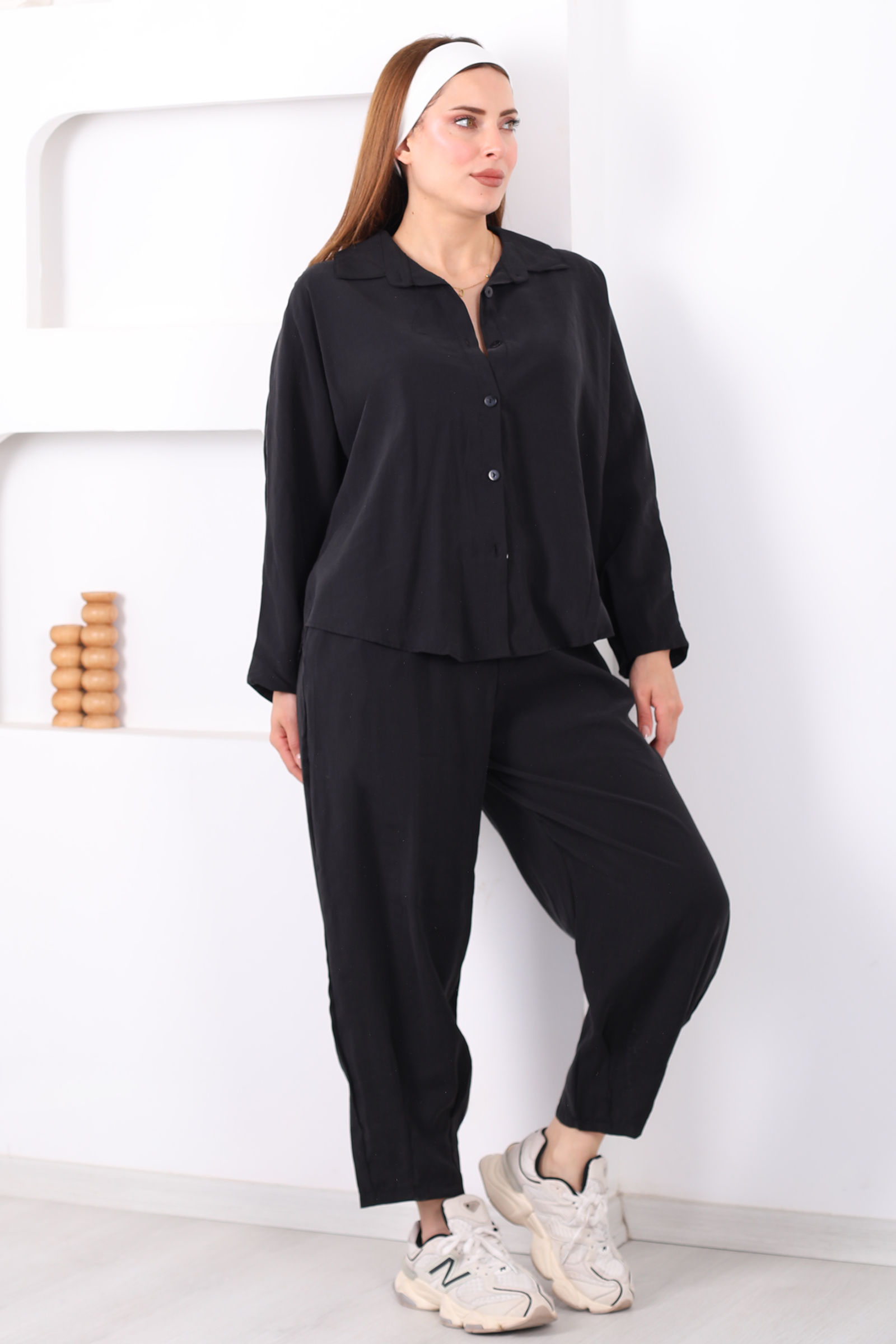Yarasa Kol Gömlek Cepli Siyah Kadın Şalvar Takım