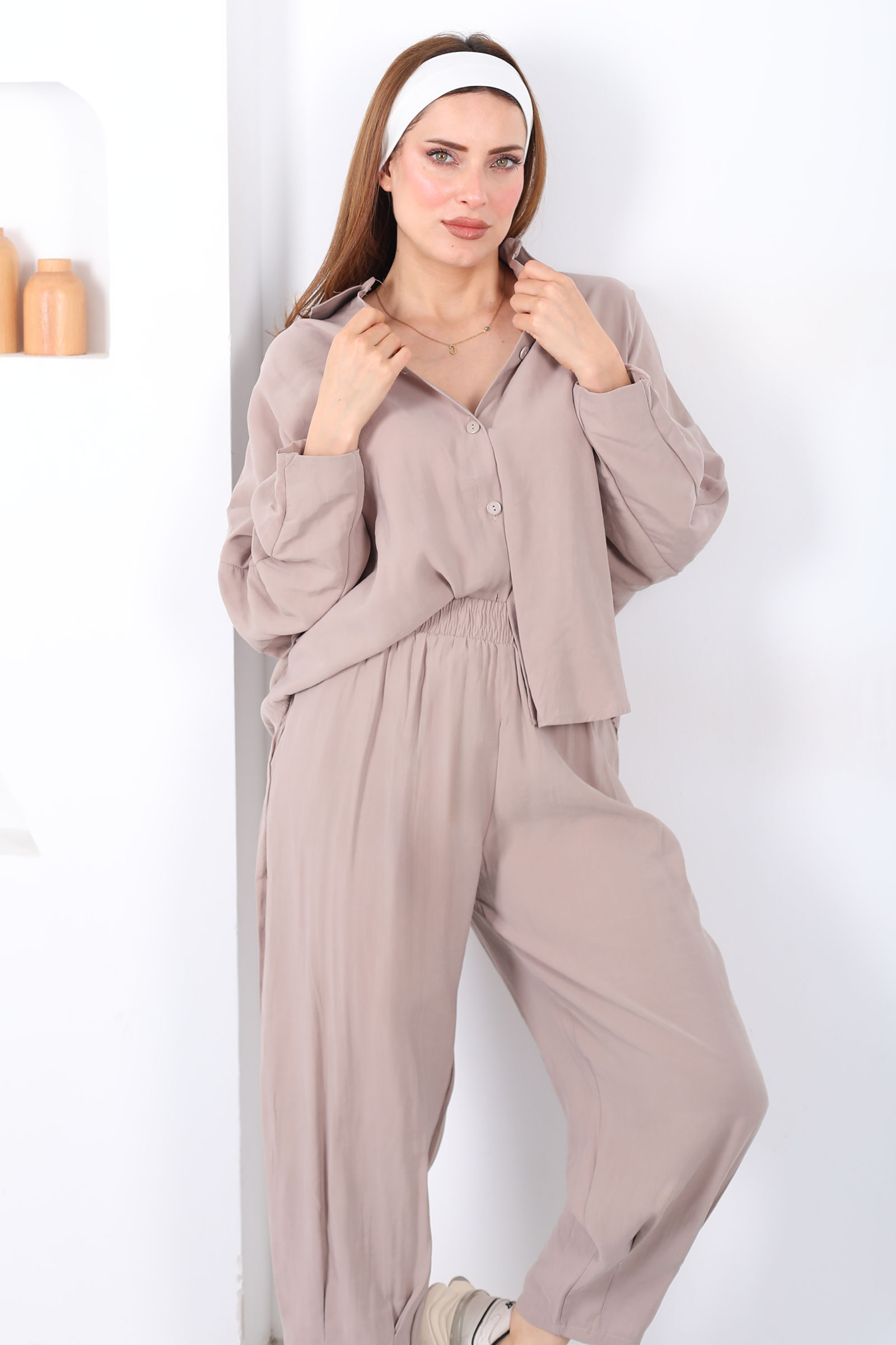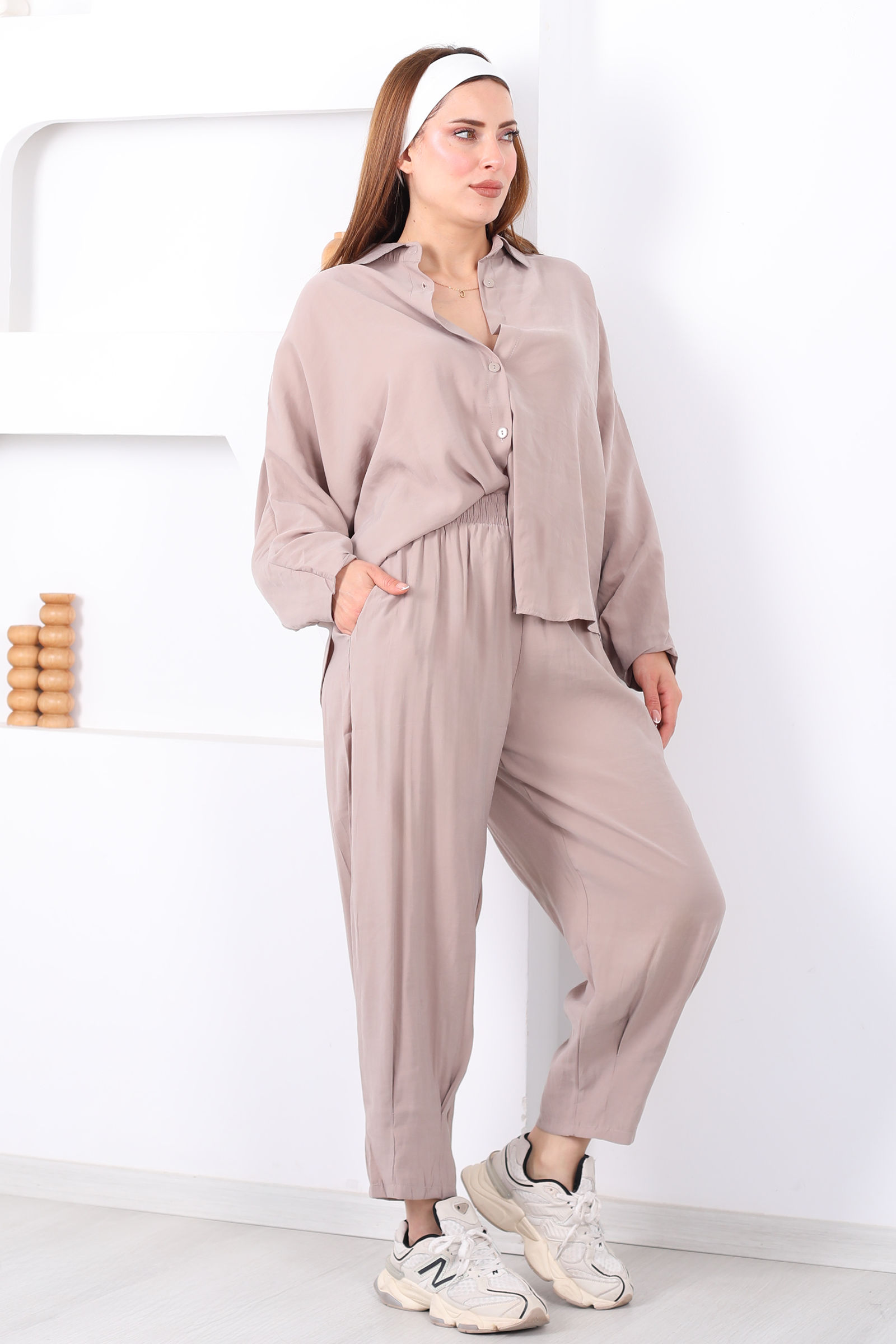 Yarasa Kol Gömlek Cepli Taş Rengi Kadın Şalvar Takım