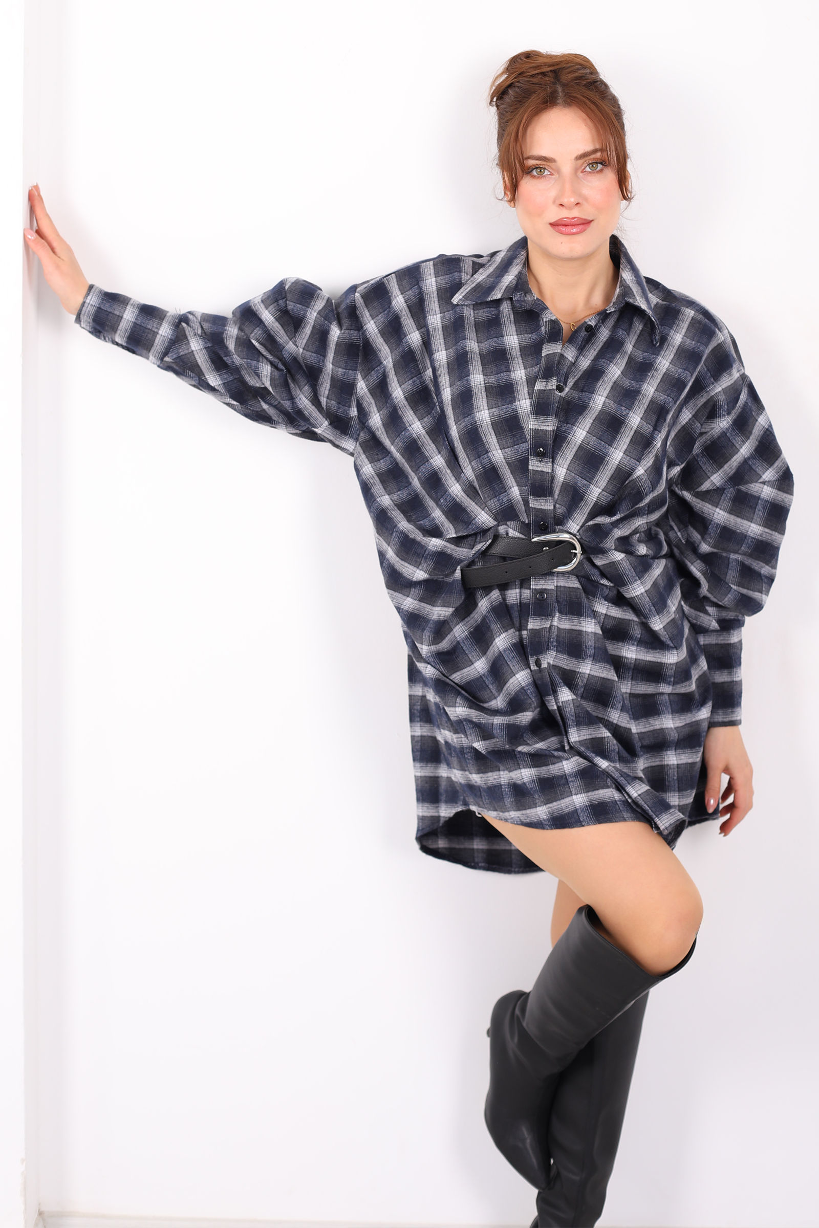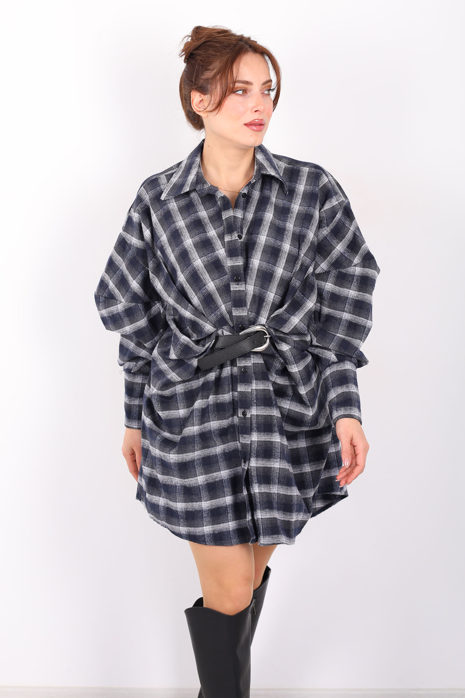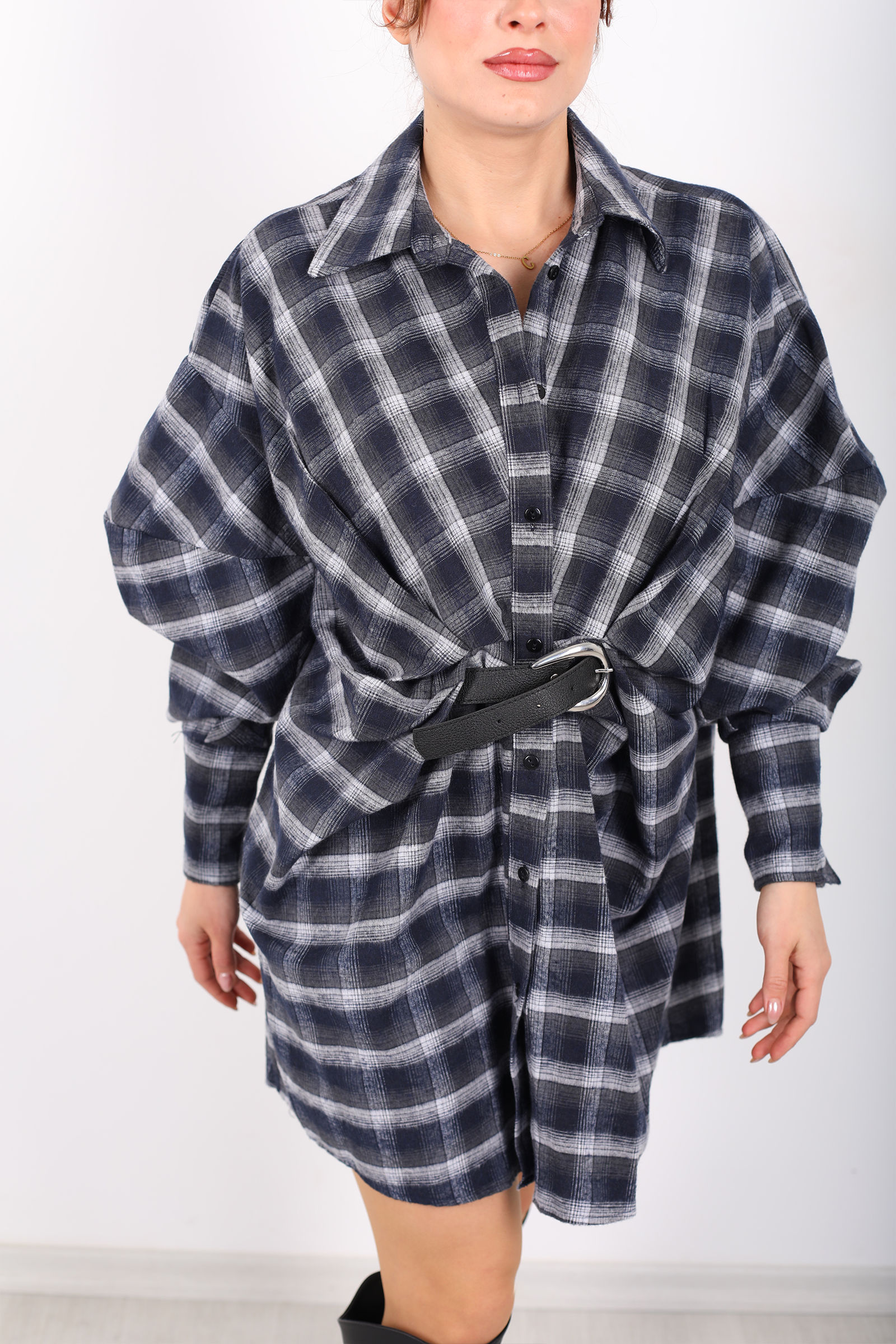 Antrasit ekose gömlek elbise, rahat yarasa kol kesimi ve belindeki kemer detayıyla hem günlük hem özel anlarda stilinize modern bir dokunuş katar. Klasik gömlek formunu elbise siluetiyle buluşturan tasarım, sezon trendi ekose deseniyle dikkat çeker; yumuşak kumaşı gün boyu konfor sağlar. Bel kemeri sayesinde bel hattını belirginleştirir ve salaş kesimi feminenlik ile rahatlığı dengeler. Jean ceket veya deri bot gibi parçalarla casual kombinler yaratabilir, topuklu ayakkabılarla daha şık bir görünüm elde edebilirsiniz. Bu elbise, minimalist detaylarıyla gardırobunuzun en kullanışlı ve şık parçalarından biri olur.