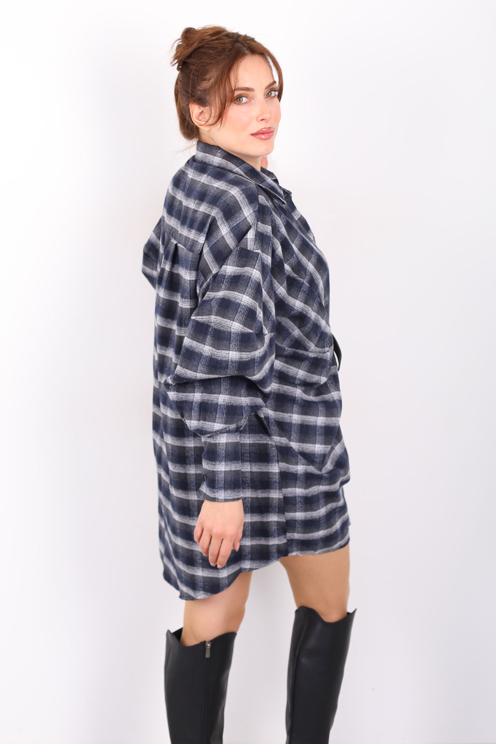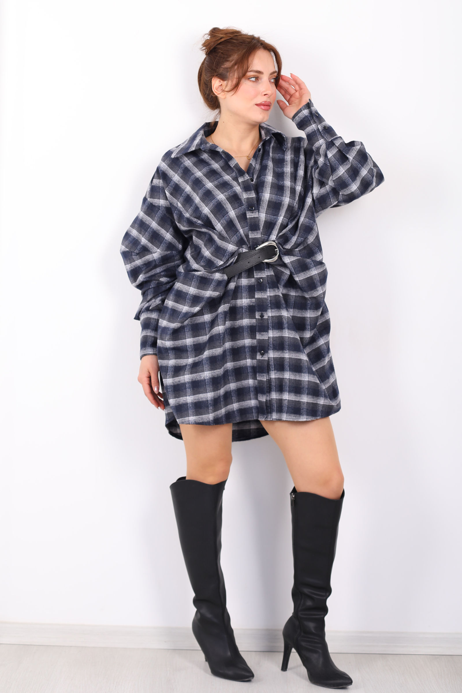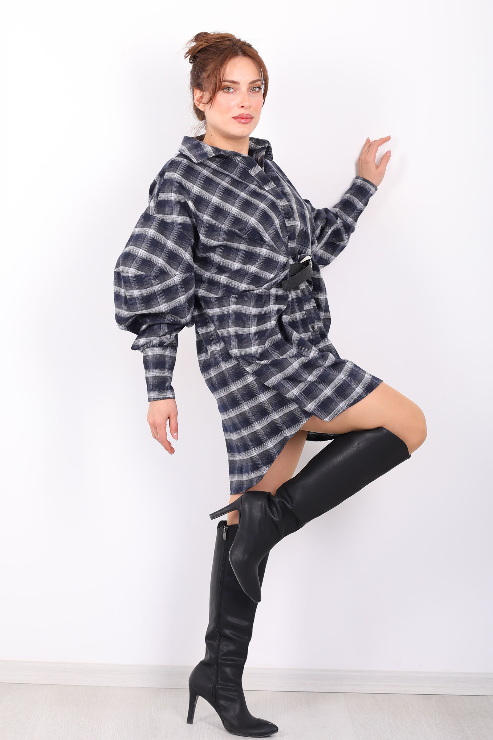 Antrasit ekose gömlek elbise, rahat yarasa kol kesimi ve belindeki kemer detayıyla hem günlük hem özel anlarda stilinize modern bir dokunuş katar. Klasik gömlek formunu elbise siluetiyle buluşturan tasarım, sezon trendi ekose deseniyle dikkat çeker; yumuşak kumaşı gün boyu konfor sağlar. Bel kemeri sayesinde bel hattını belirginleştirir ve salaş kesimi feminenlik ile rahatlığı dengeler. Jean ceket veya deri bot gibi parçalarla casual kombinler yaratabilir, topuklu ayakkabılarla daha şık bir görünüm elde edebilirsiniz. Bu elbise, minimalist detaylarıyla gardırobunuzun en kullanışlı ve şık parçalarından biri olur.