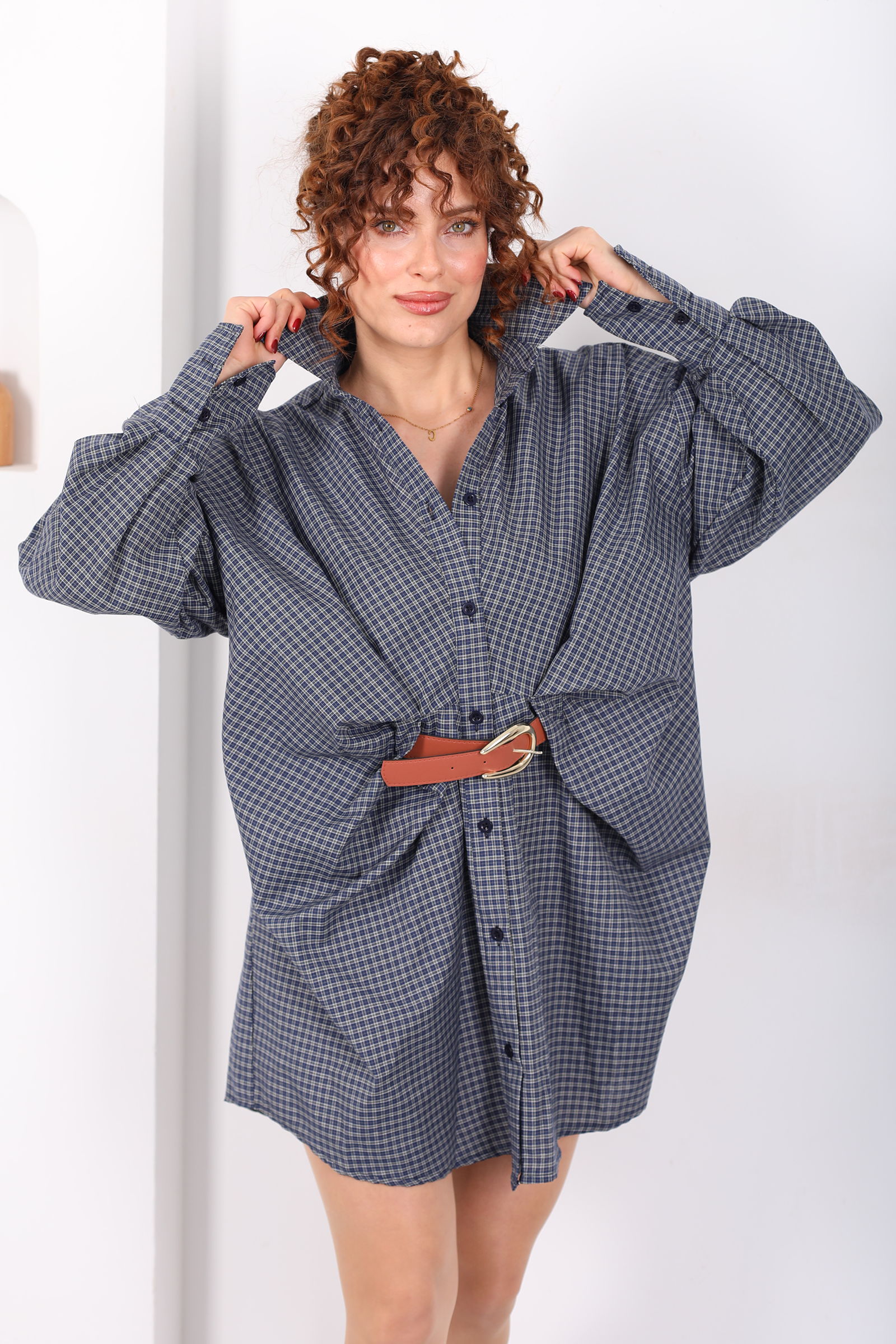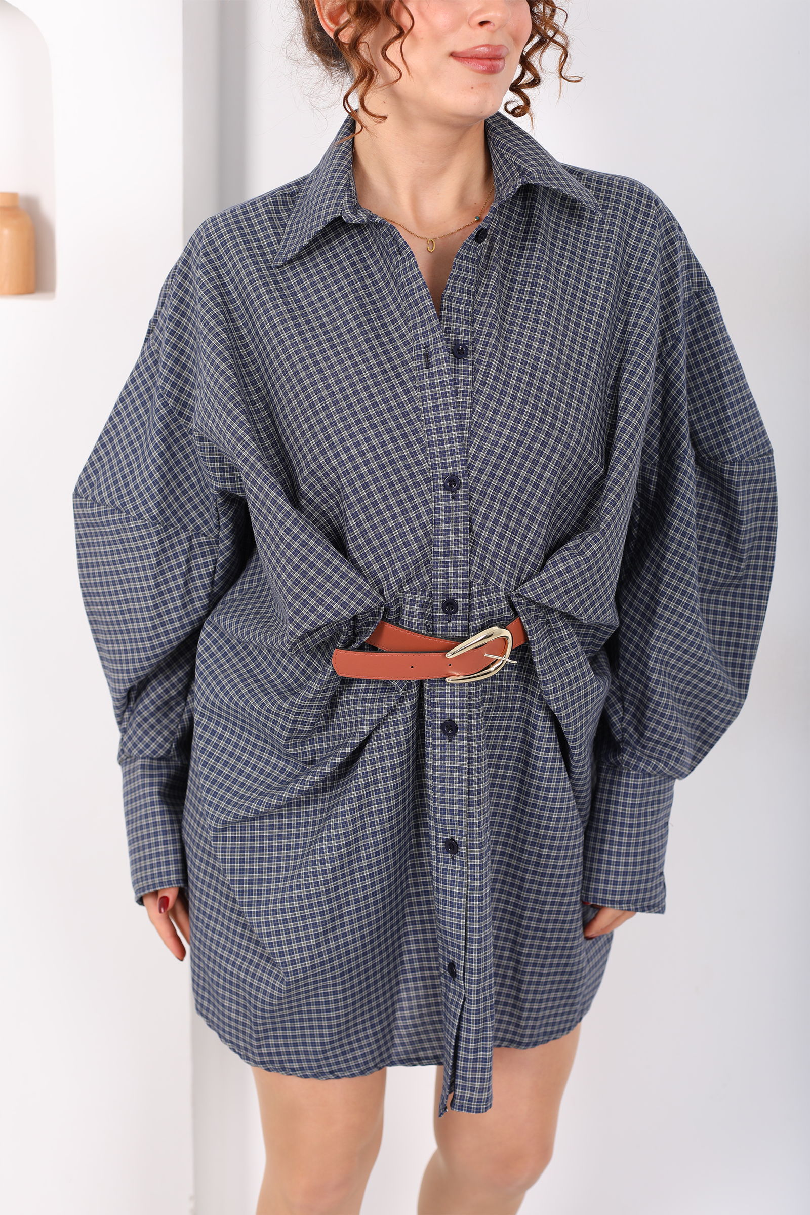 Yarasa Kol Kemerli Pötikare Desenli Kadın Antrasit Gömlek Elbise