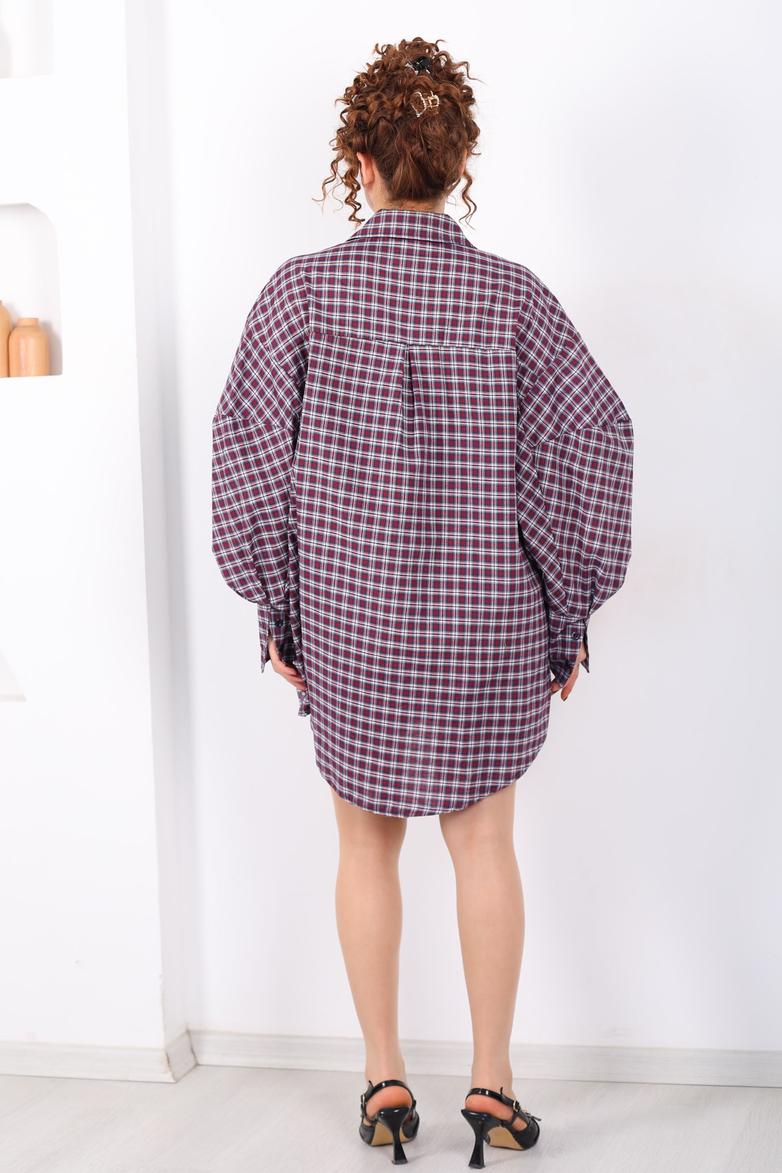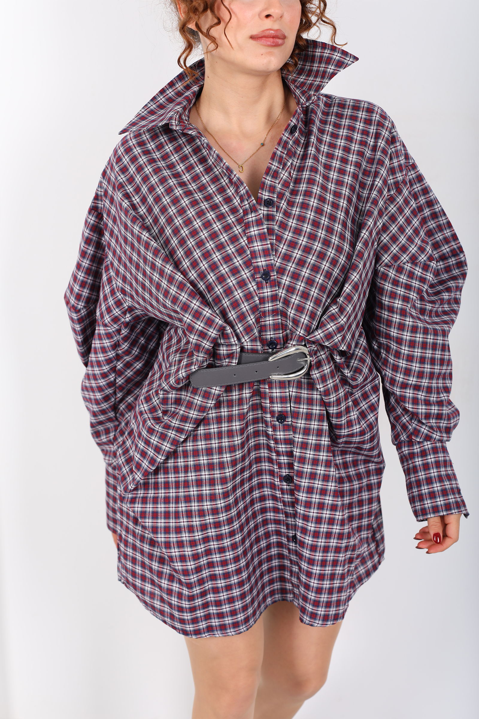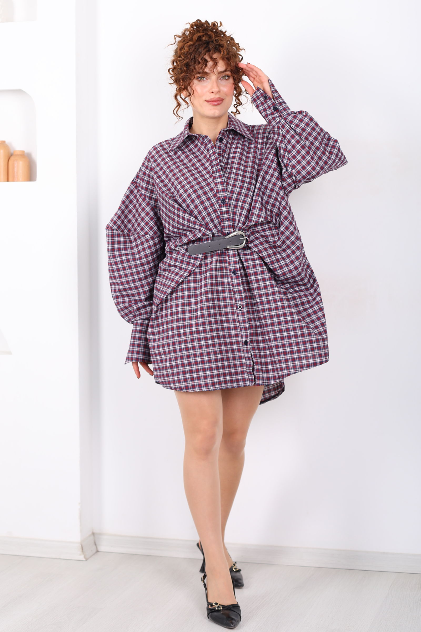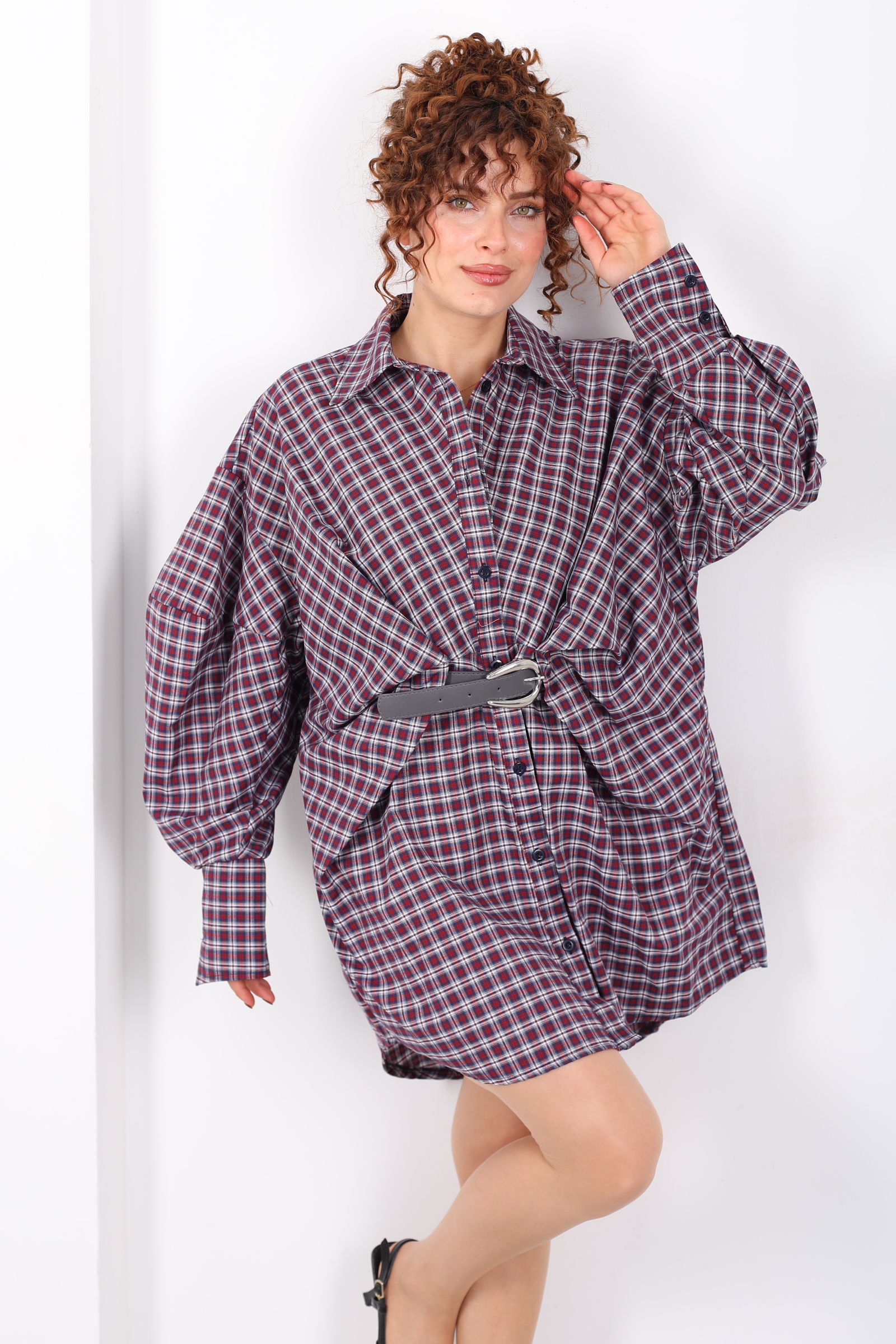 Yarasa Kol Kemerli Kadın Bordo Ekose Gömlek Elbise