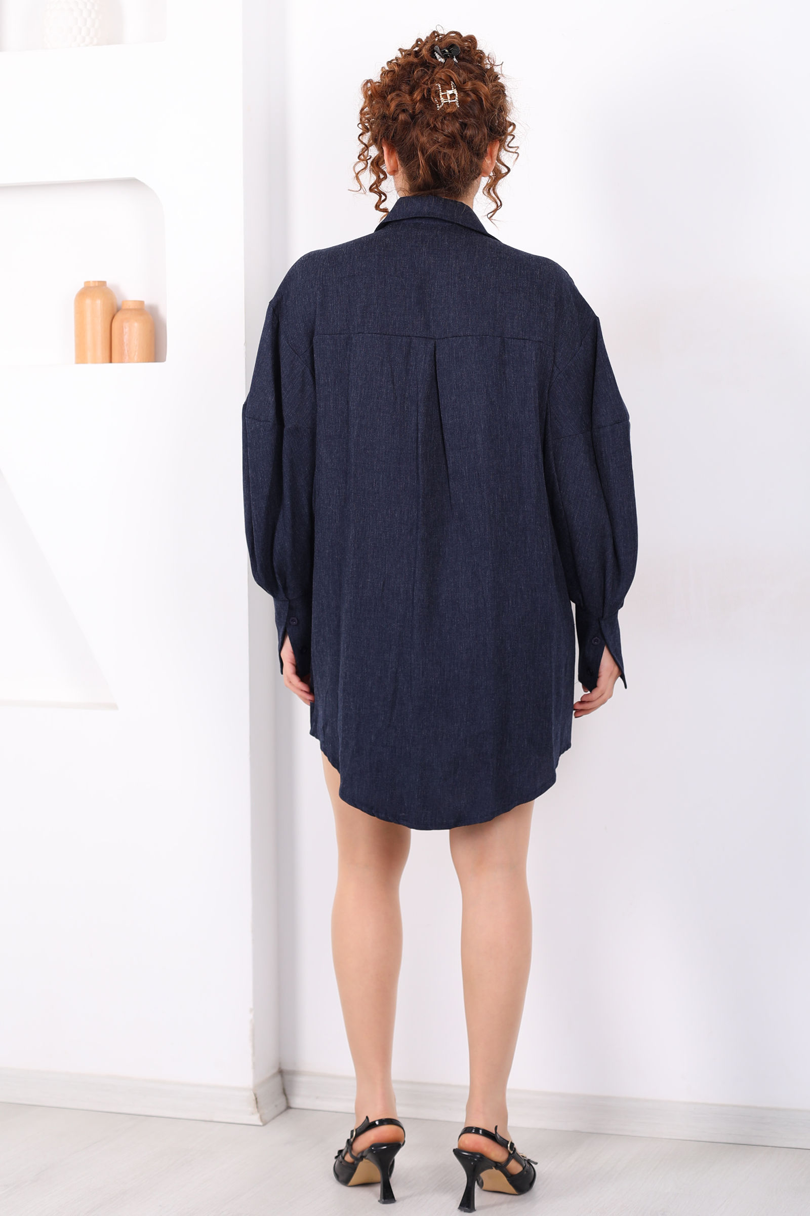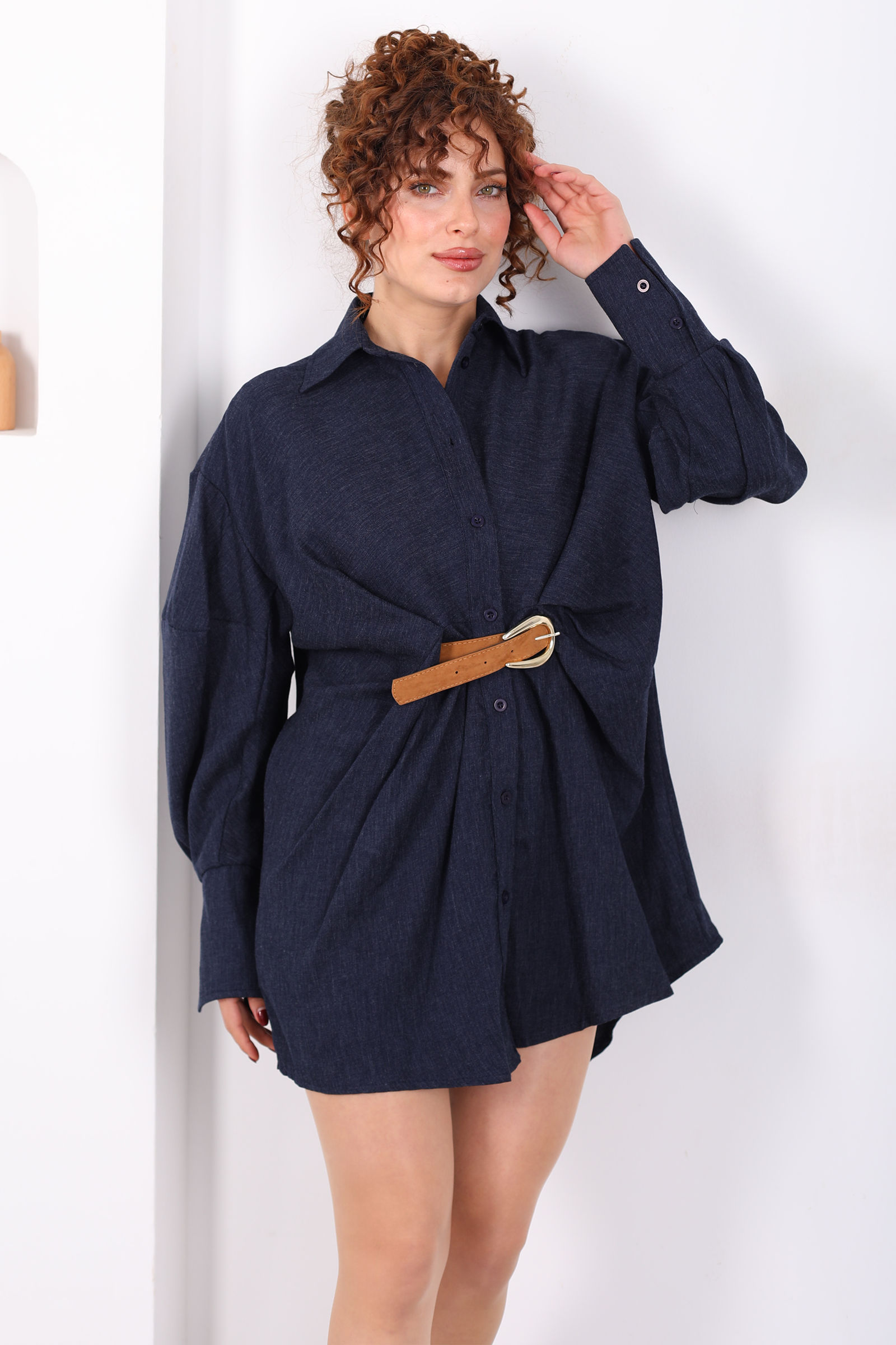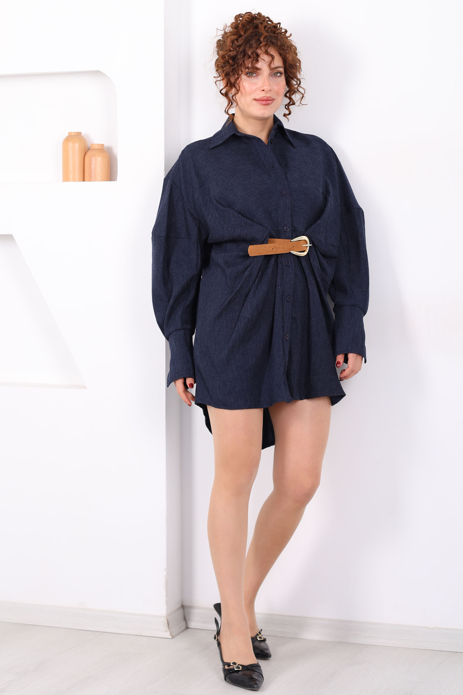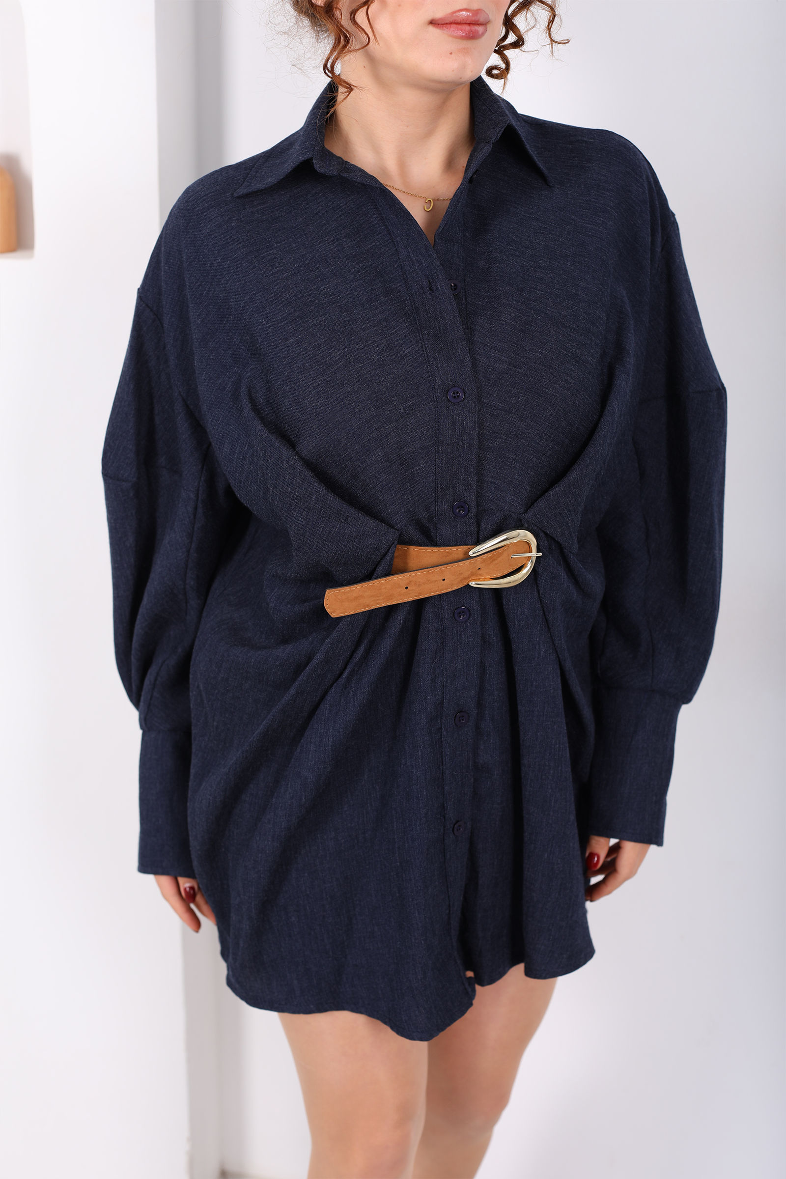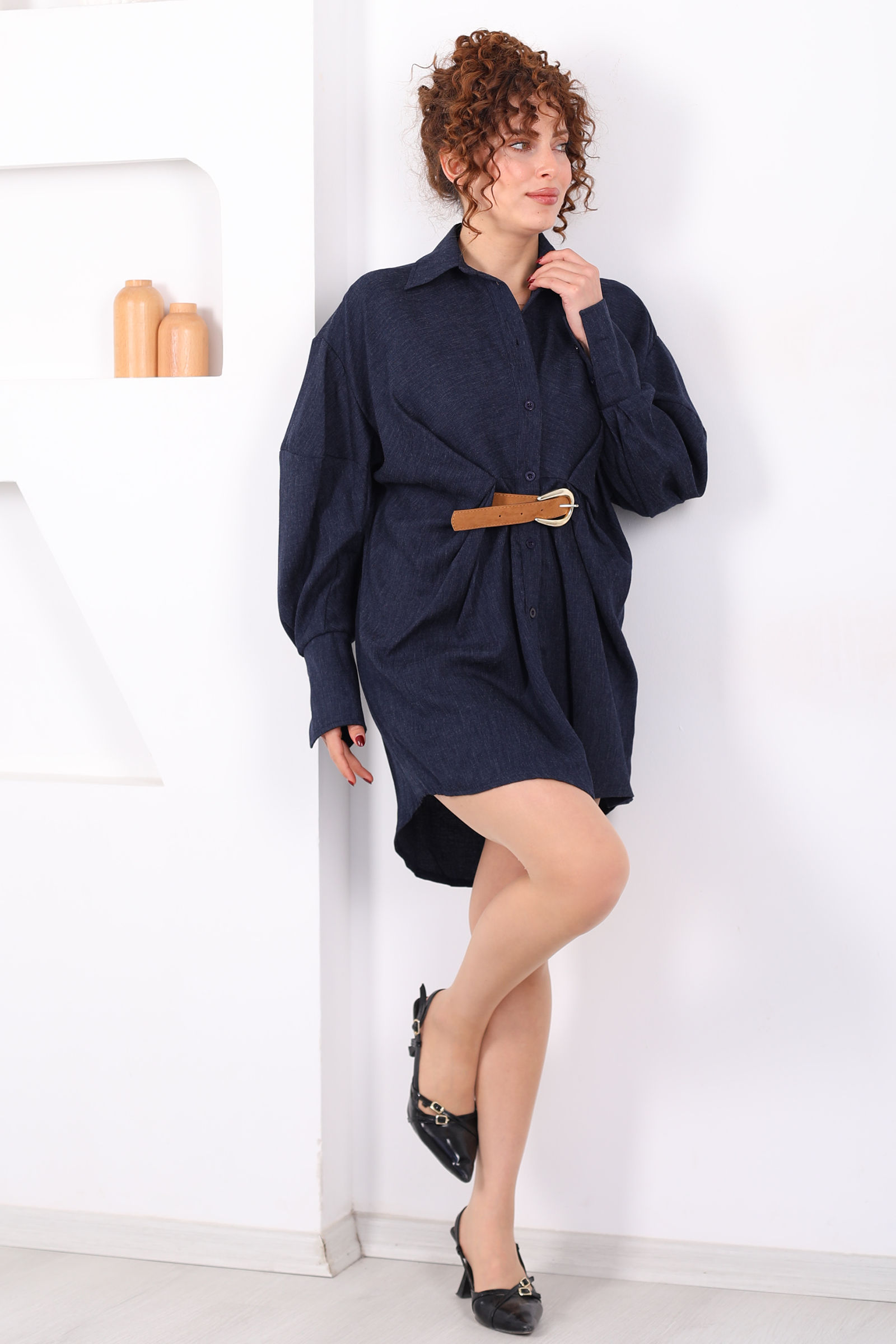 Yarasa Kol Kemerli Kot Görünümlü Kadın Lacivert Gömlek Elbise