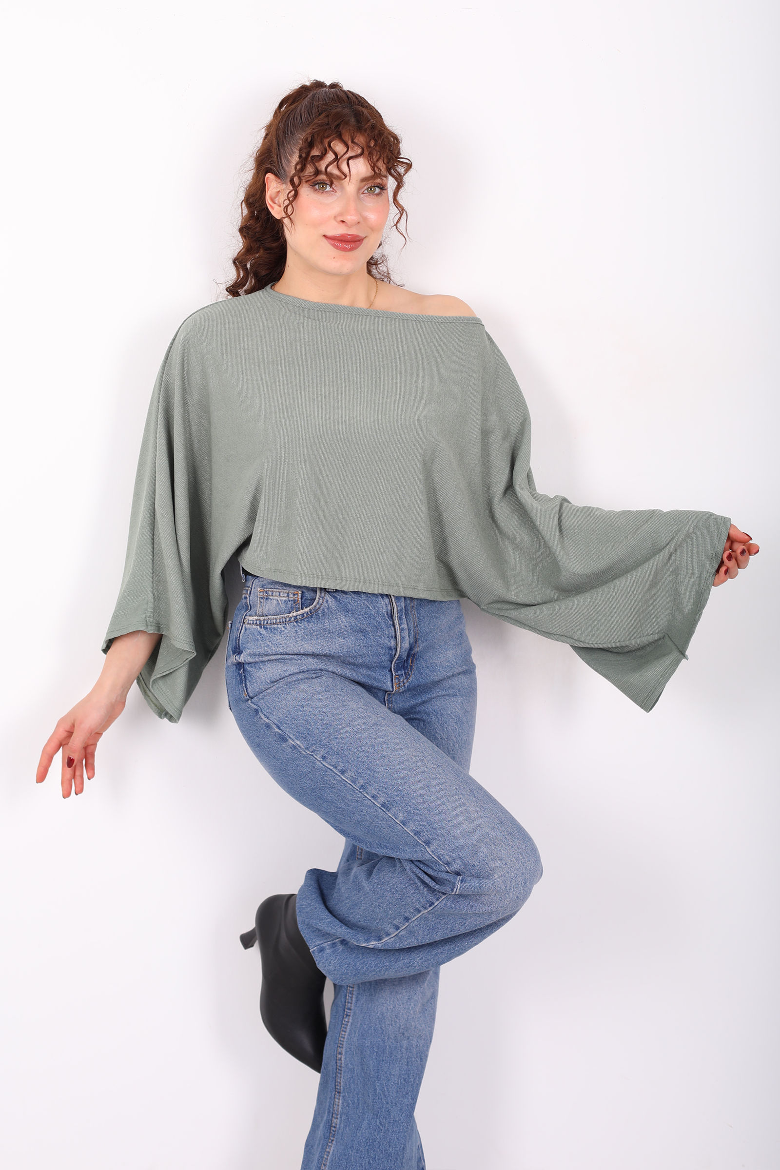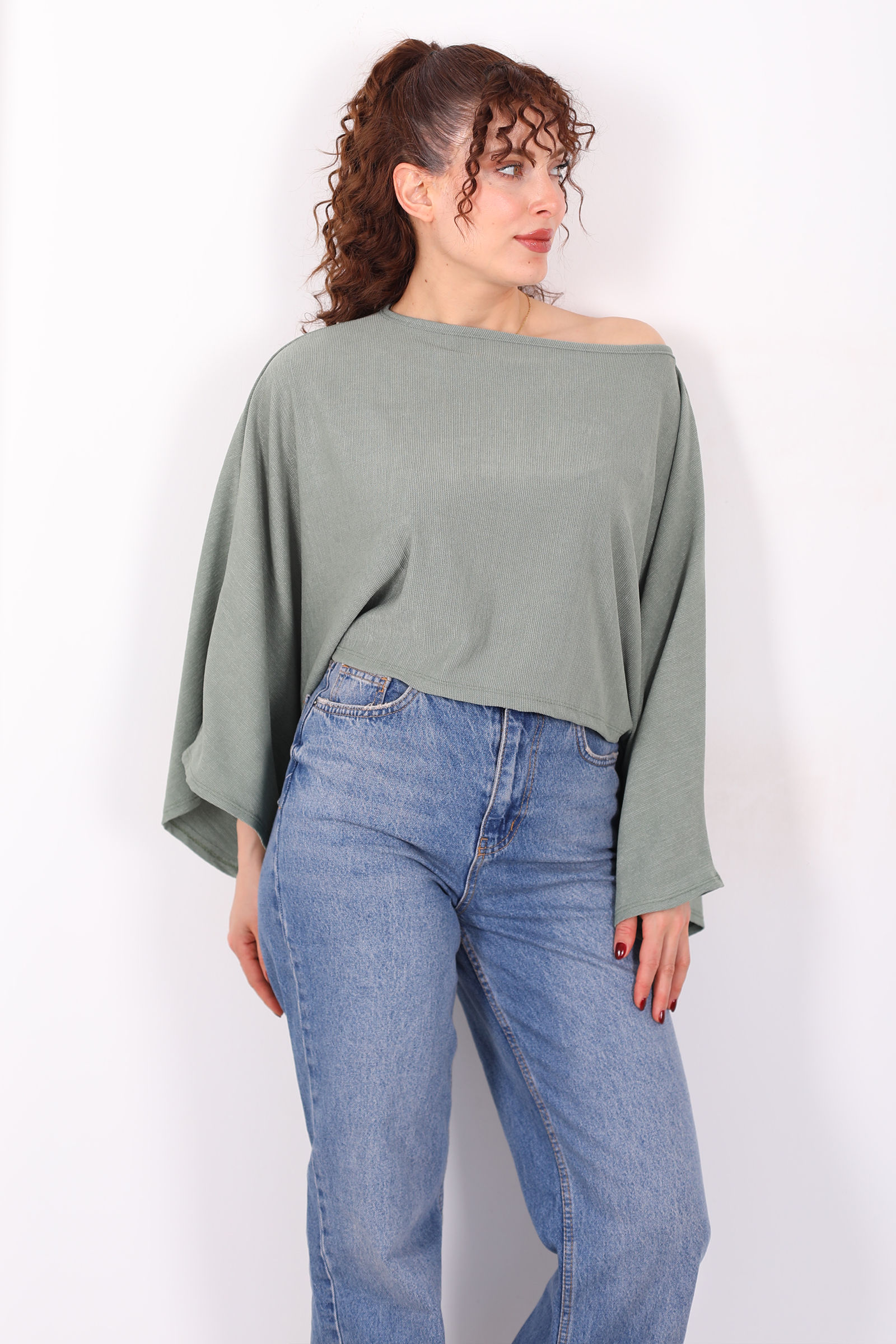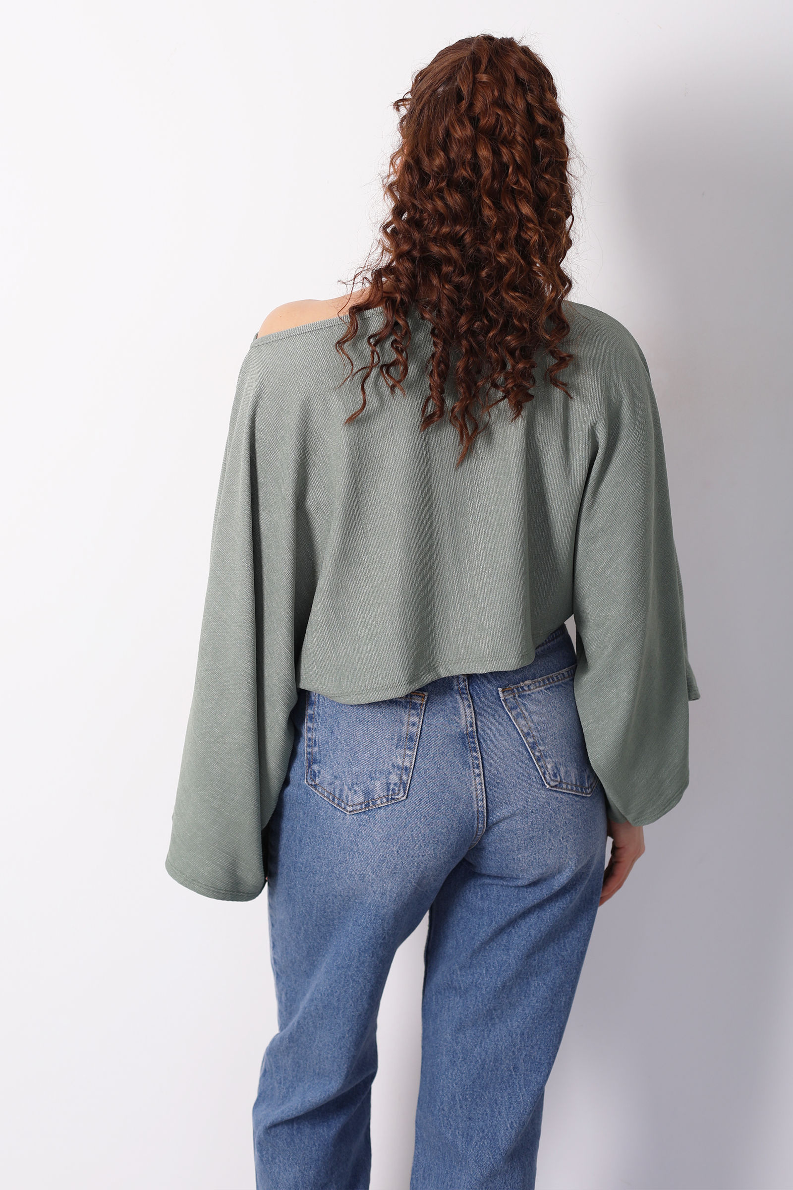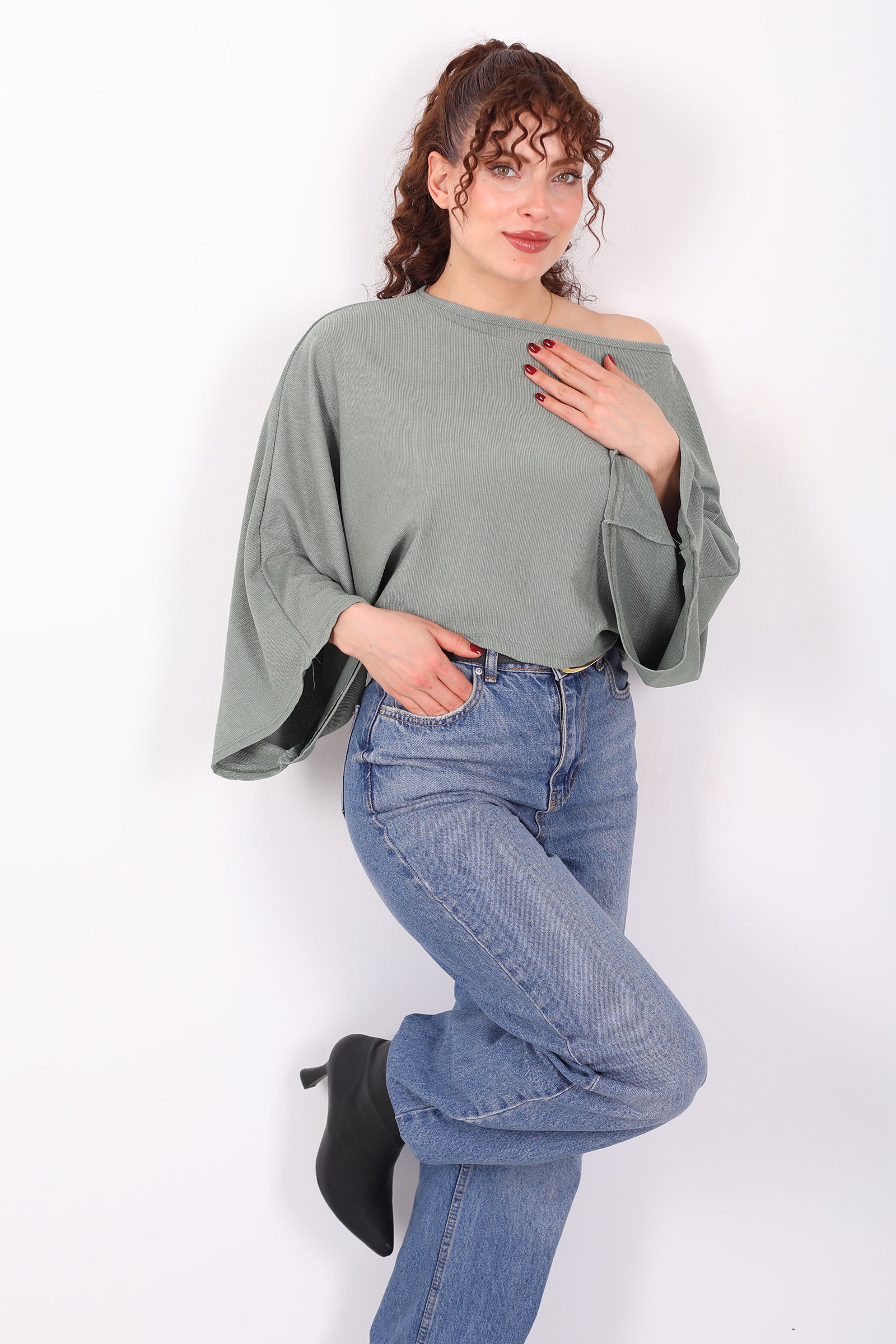 Omuz Büzgülü Kayık Yaka Ekru Kadın Bluz