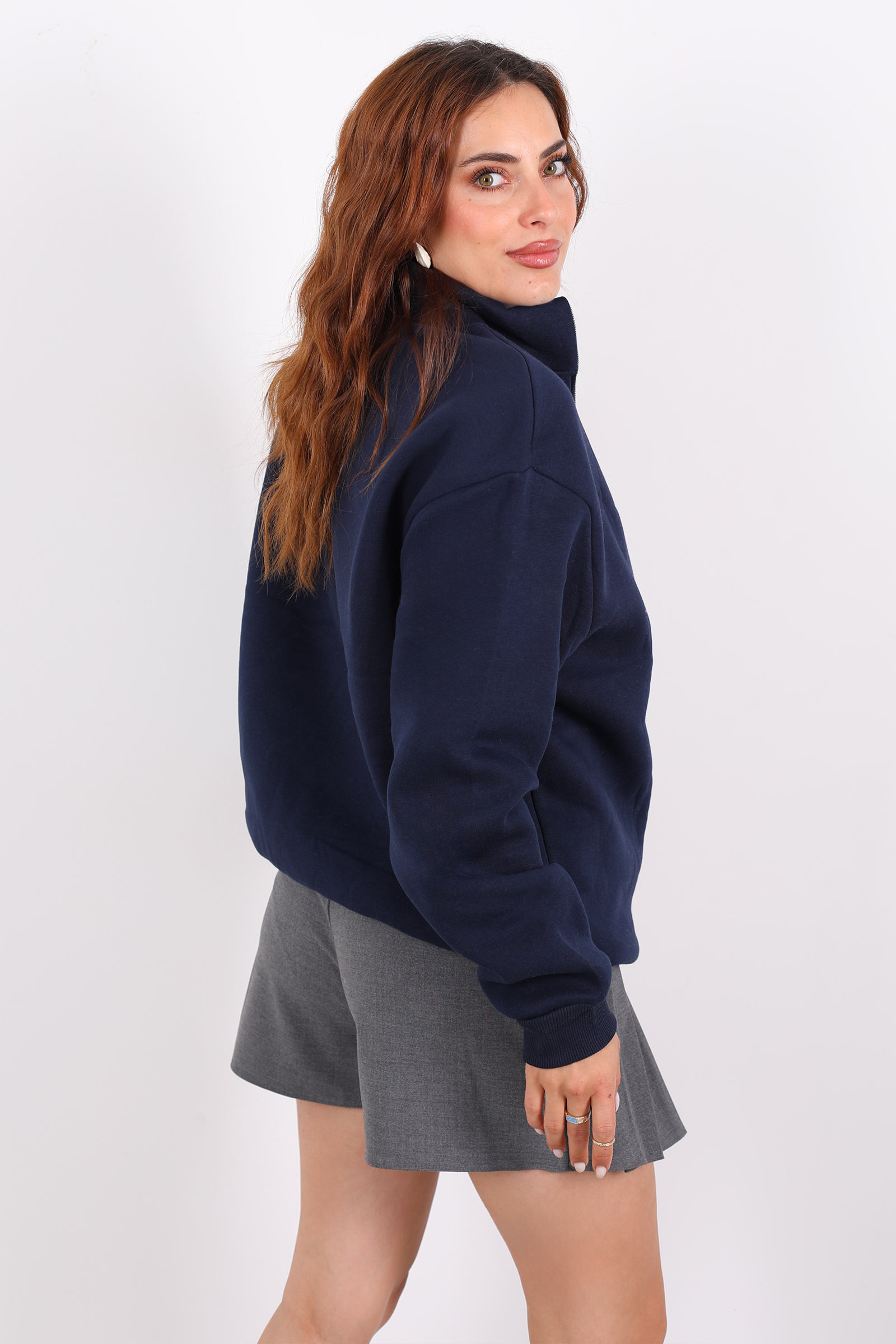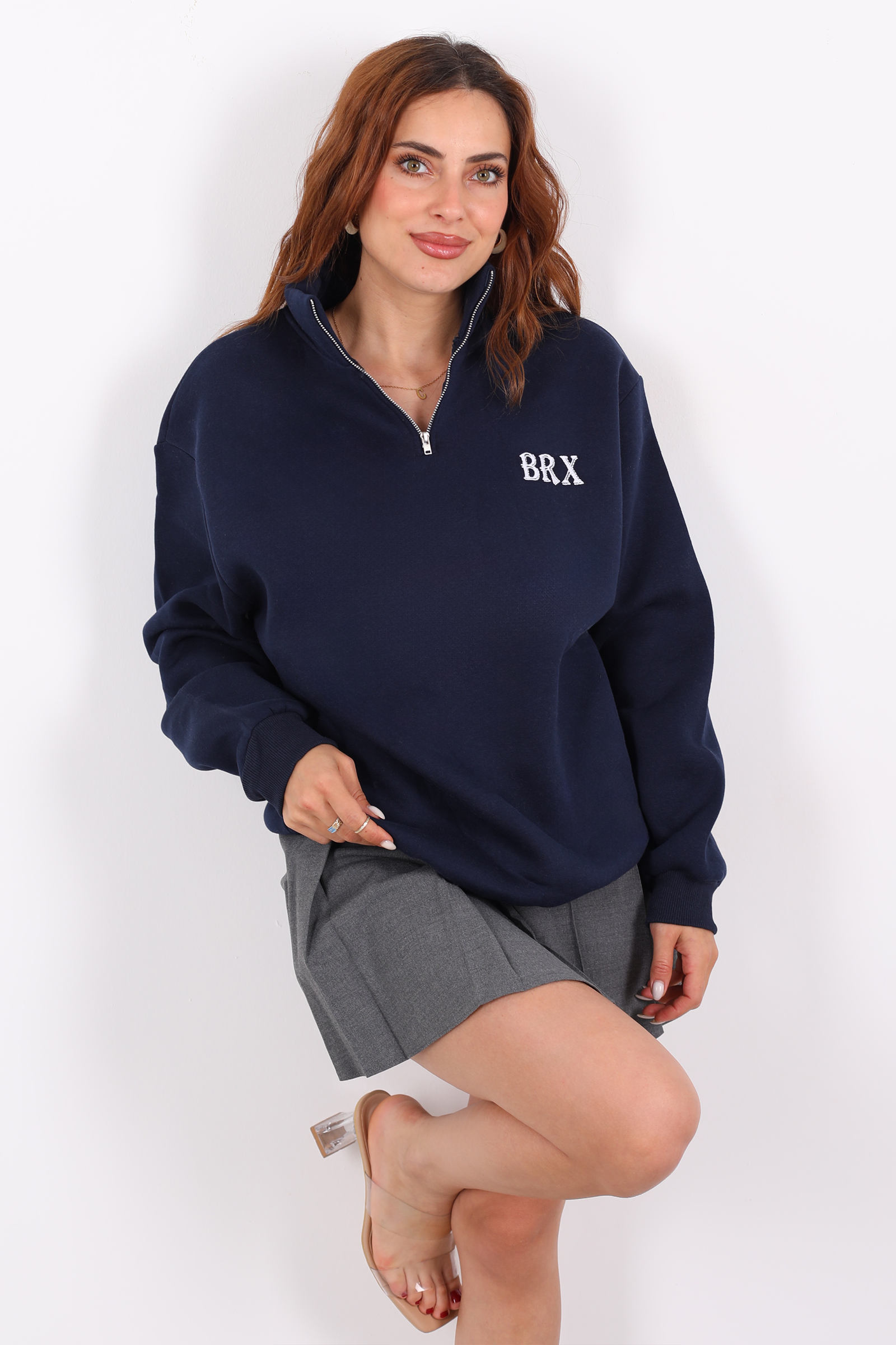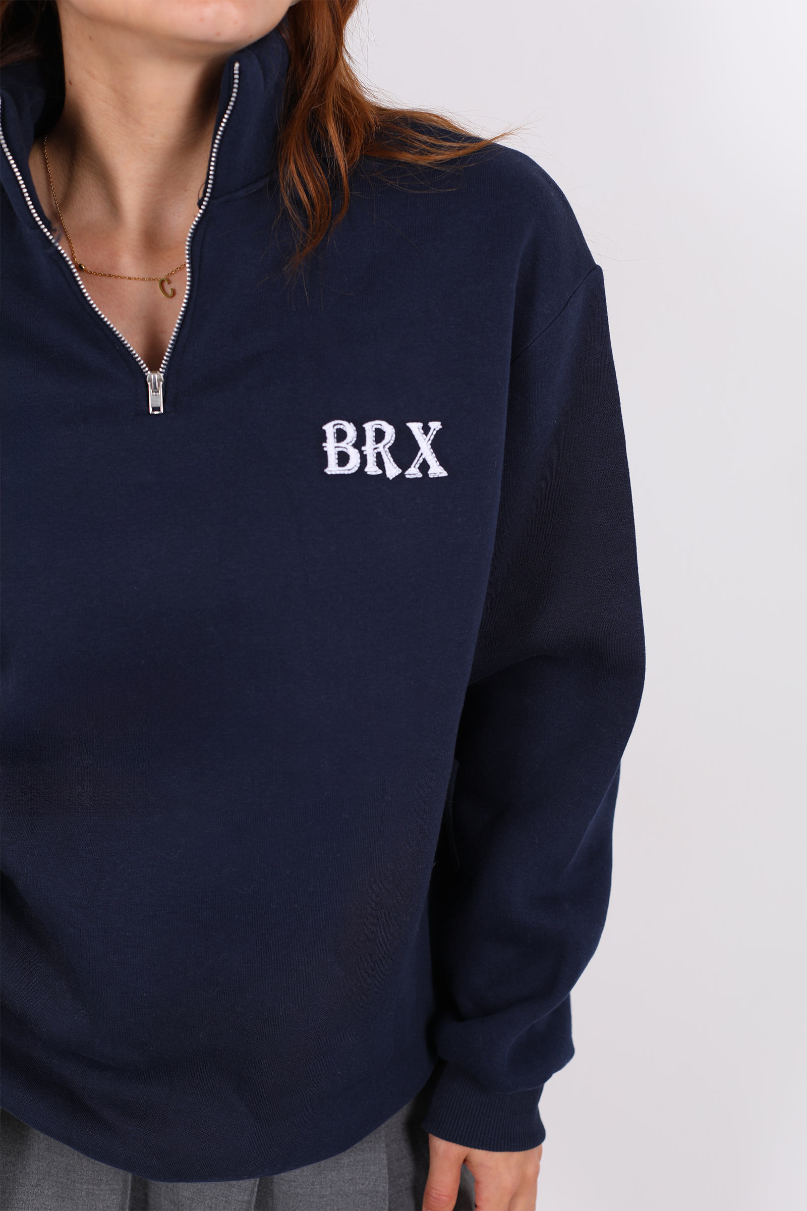 Lacivertin derinliğini ve BRX baskısının modern çizgisini bir araya getiren bu yarım fermuarlı kadın sweat, stilinize sofistike bir hava katıyor. %70 pamuk ve %30 polyester karışımı kumaşıyla hem sıcak tutar hem de yumuşak bir dokunuş sunar. Oversize kalıbı sayesinde rahat hareket imkanı sağlar.