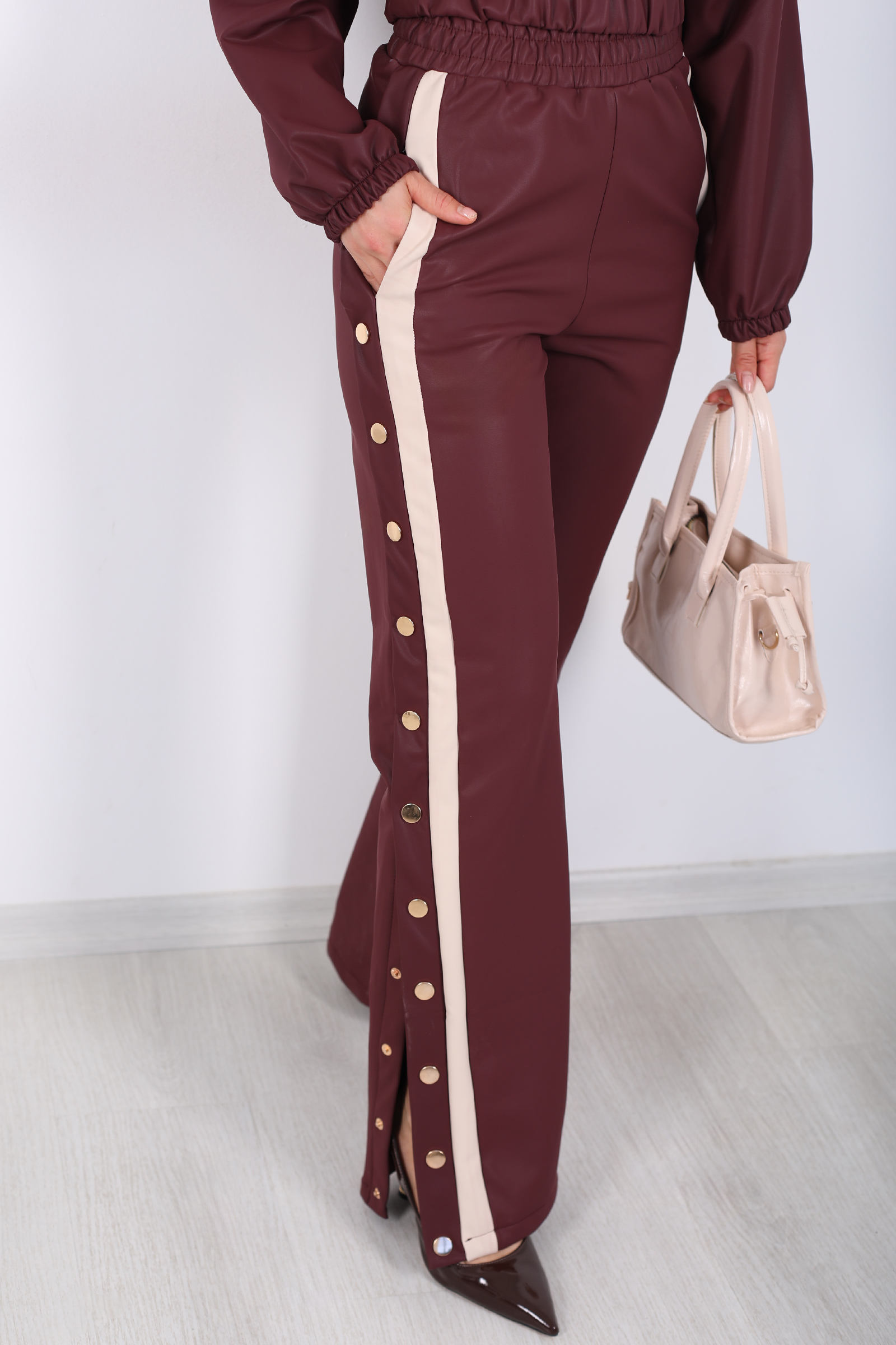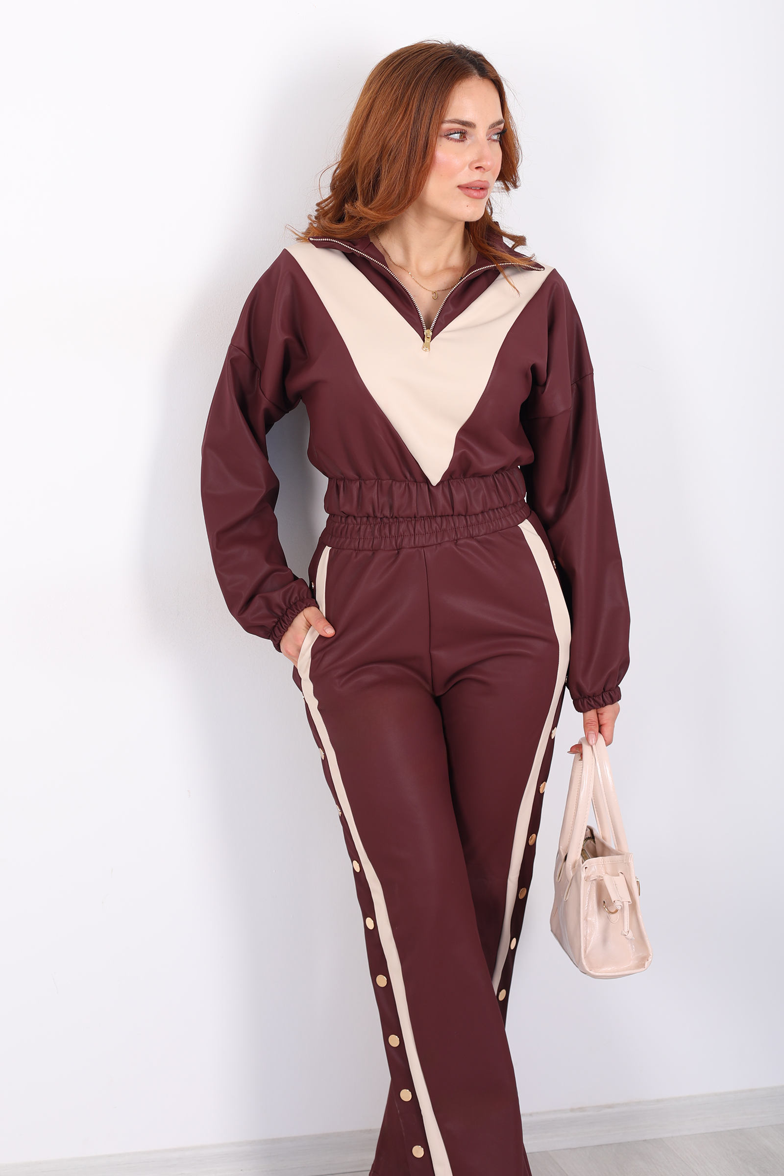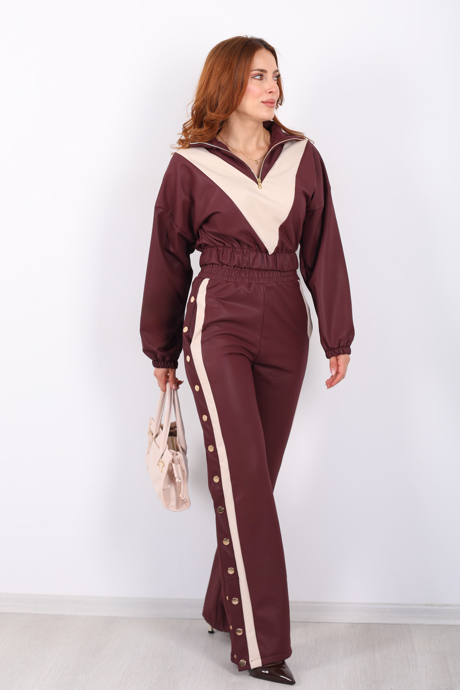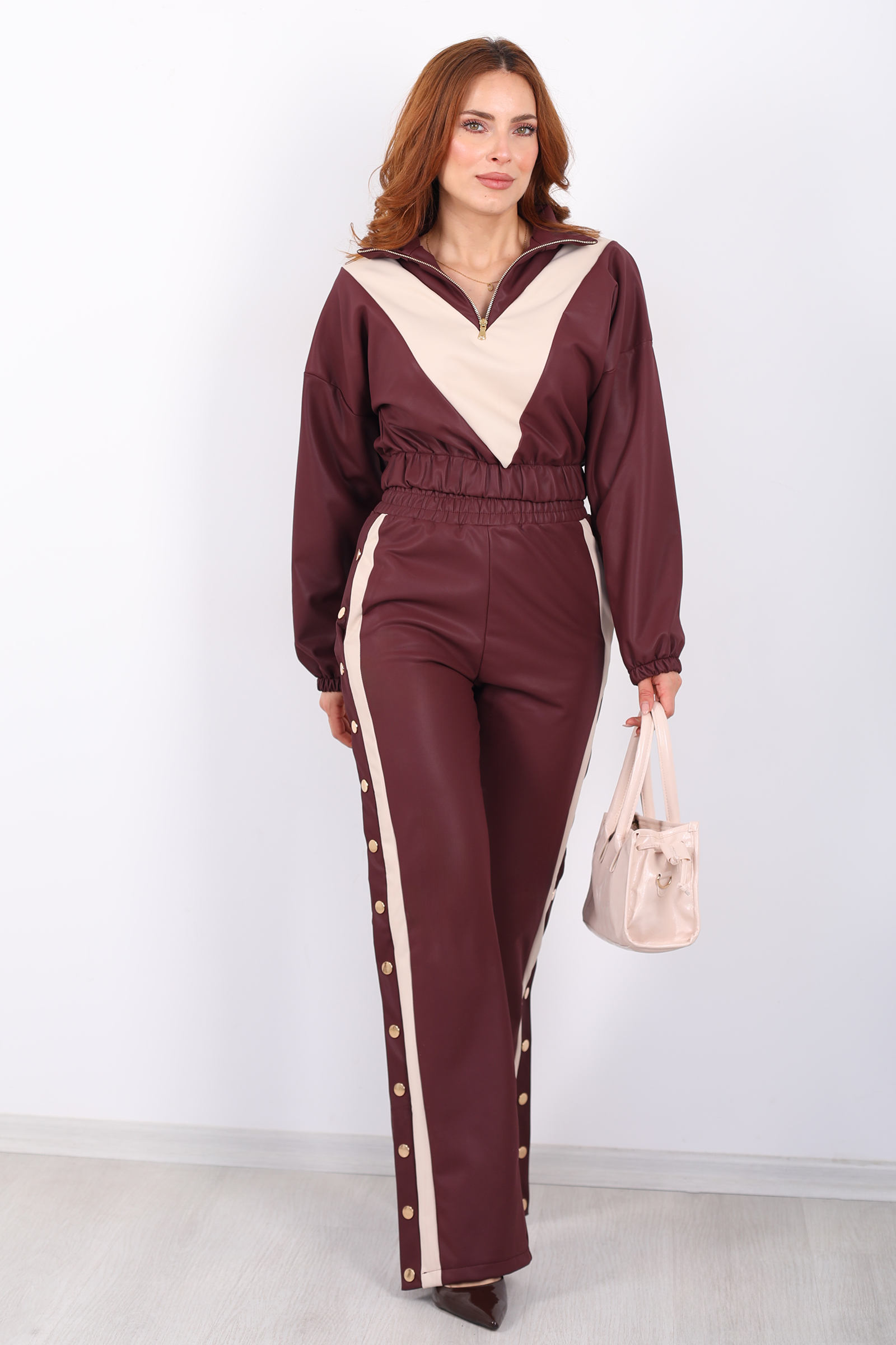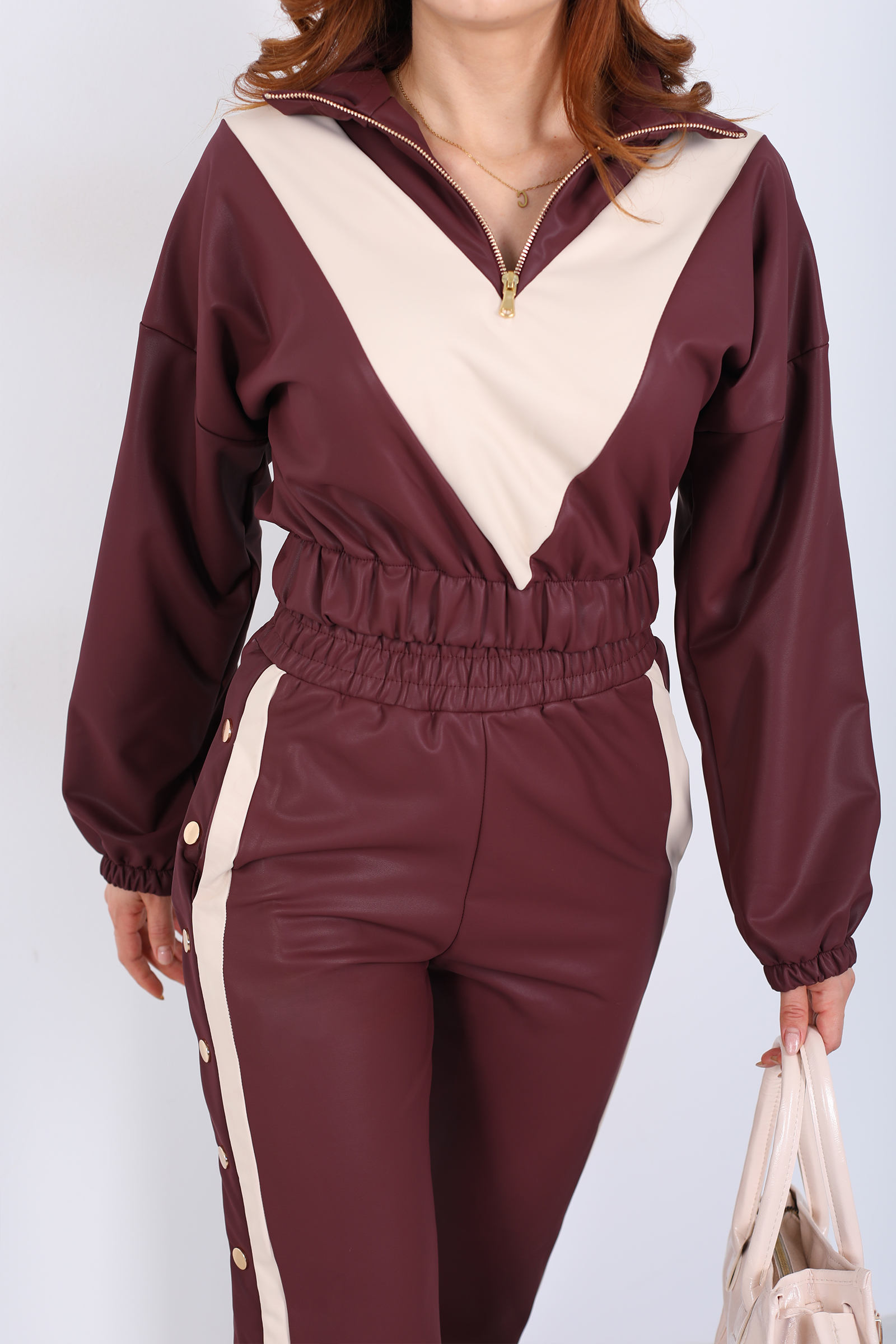 Yarım Fermuarlı Şerit Detaylı Bordo Kadın Deri Çıtçıtlı Takım