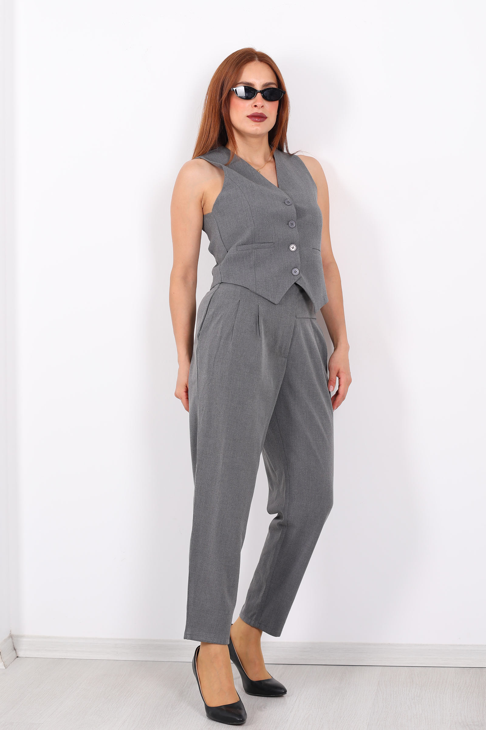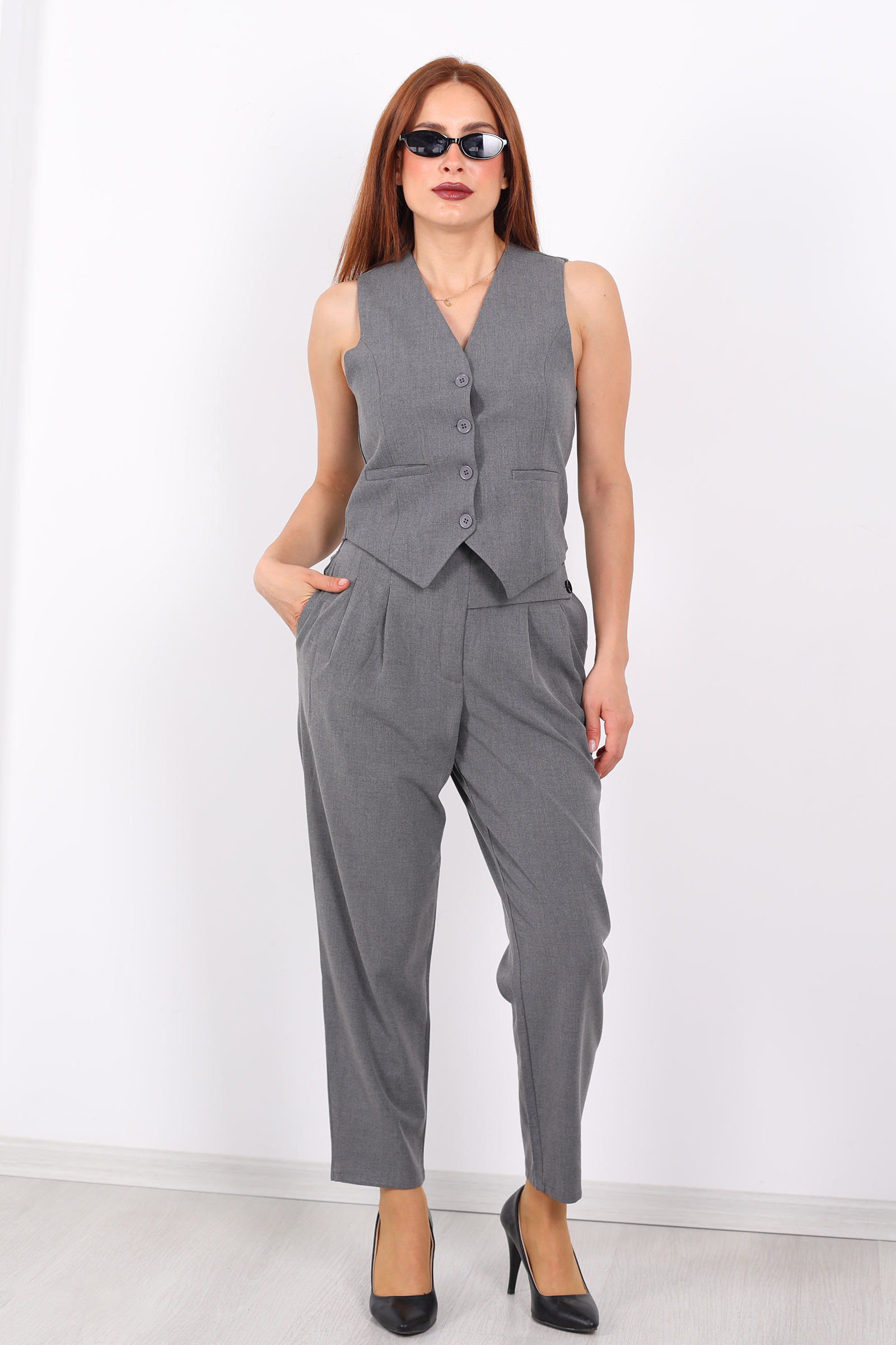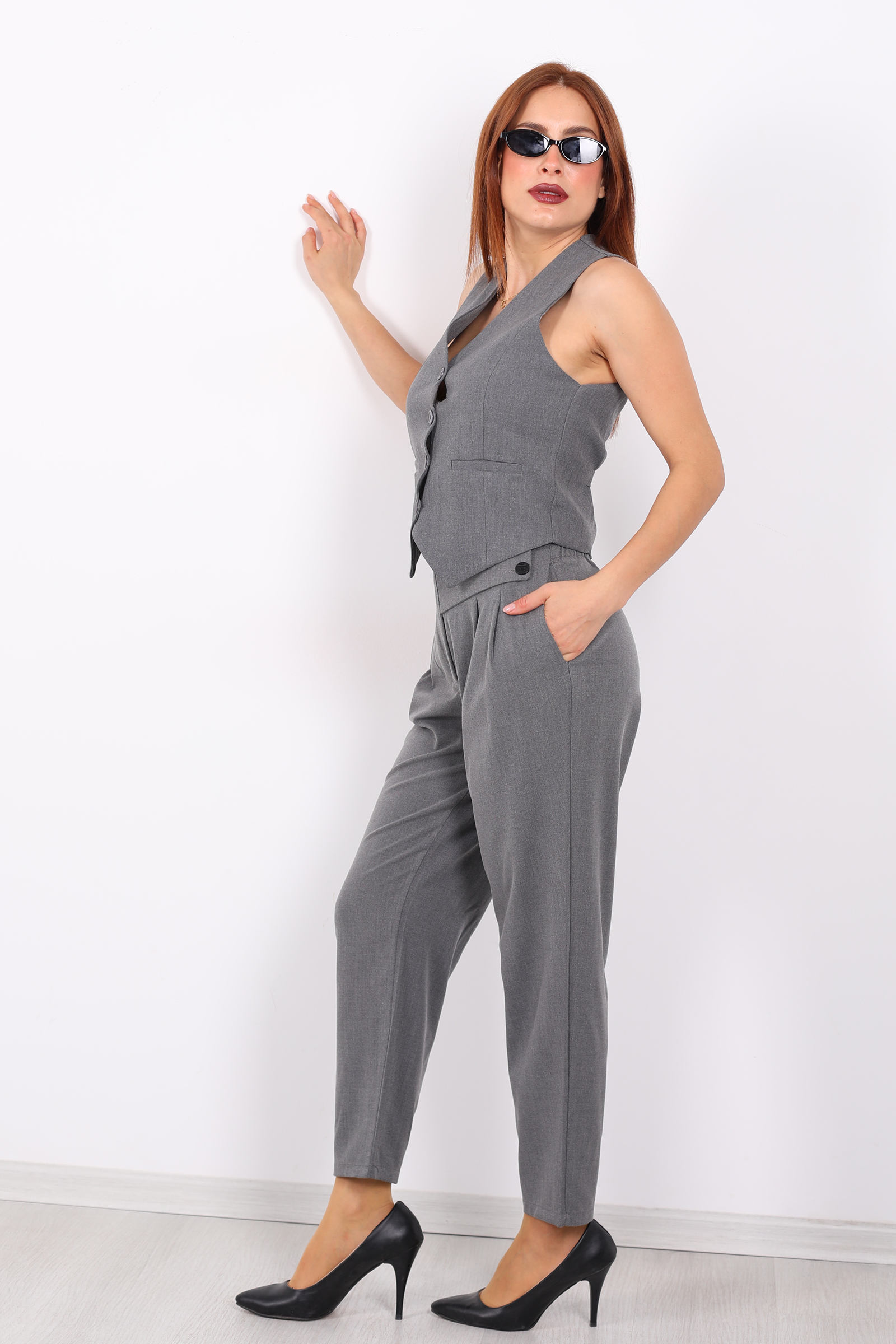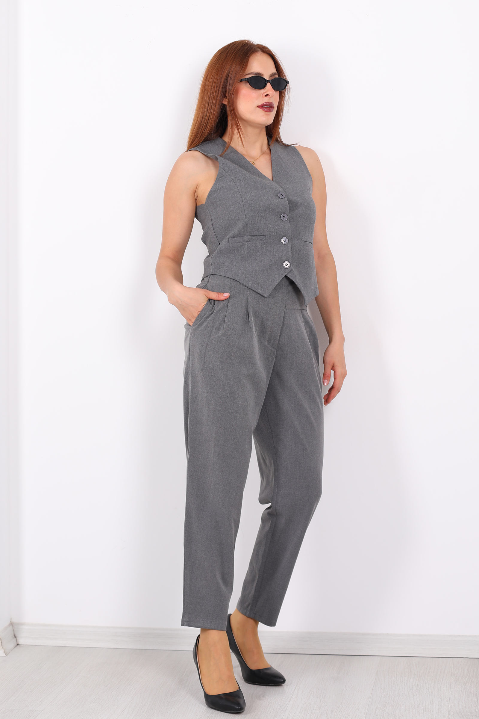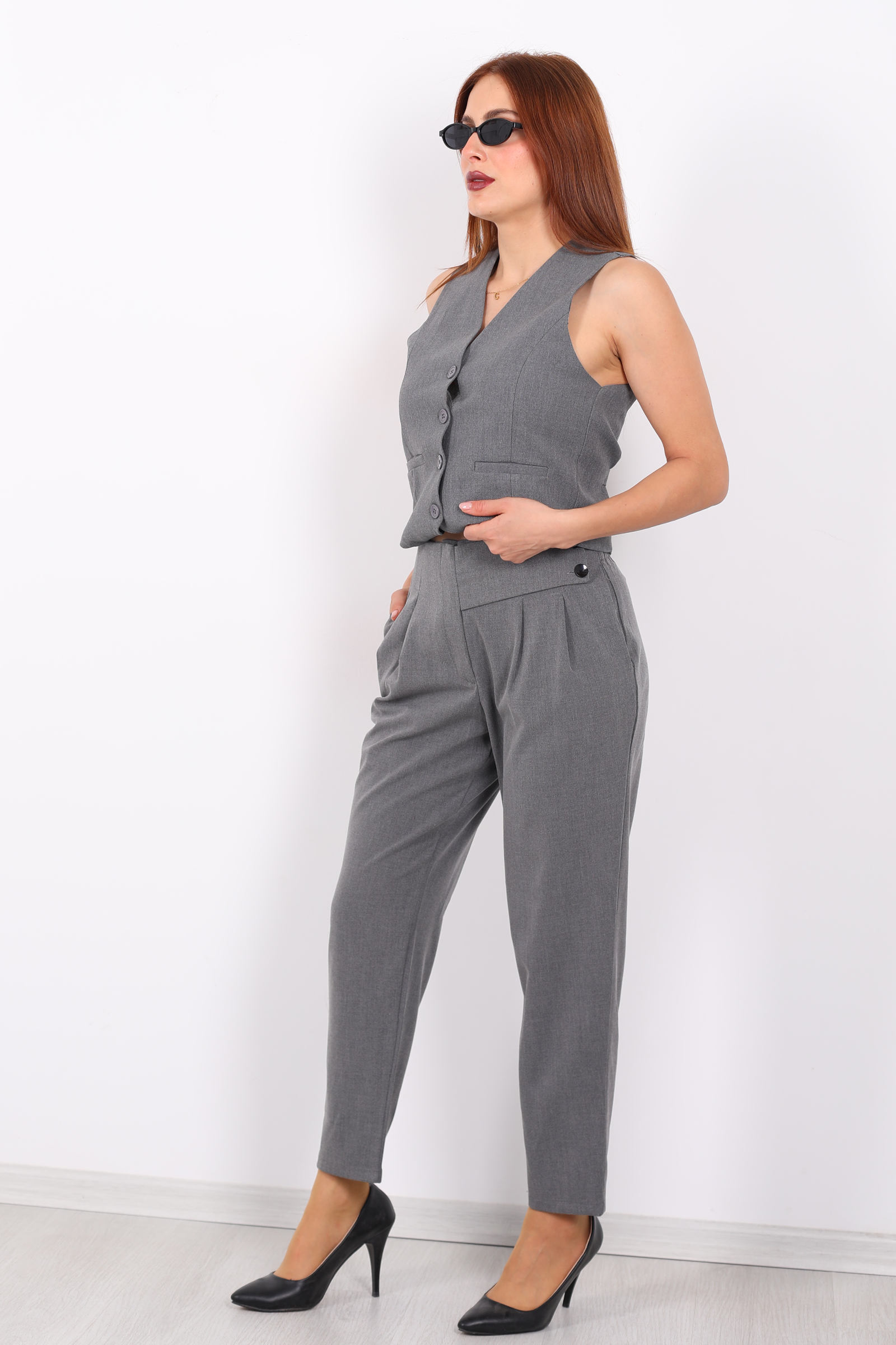 Bu antrasit renkli havuç pantolon; zarafeti, modern kesimi ve fonksiyonel detaylarıyla gardırobunuzun yıldız parçası olmaya aday. Pantolonun koyu gri-antrasit tonu, siyahın ciddiyeti ile gri tonlarının yumuşaklığını dengeler nötr ama karakterli bir renk seçimi.Kalıp olarak havuç stili uygulanmıştır: basenden paçaya doğru hafif daralan bir yapı sayesinde hem hacimli hem de dengeli bir siluet yaratılır. Bu kesim, klasik pantolonların resmi hissini korurken günlük konfor ve özgürlük de sunar.