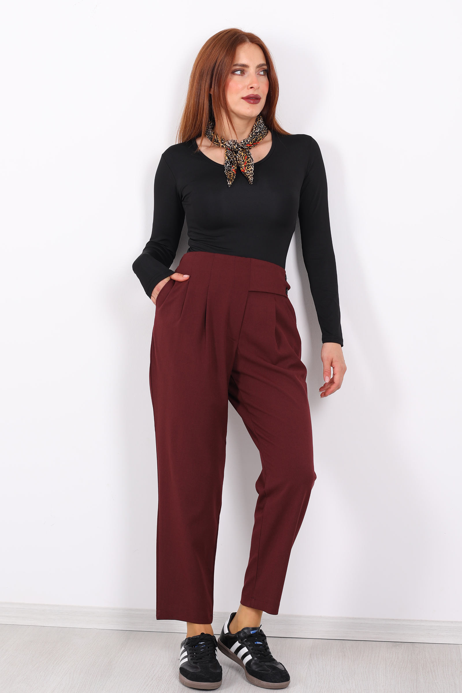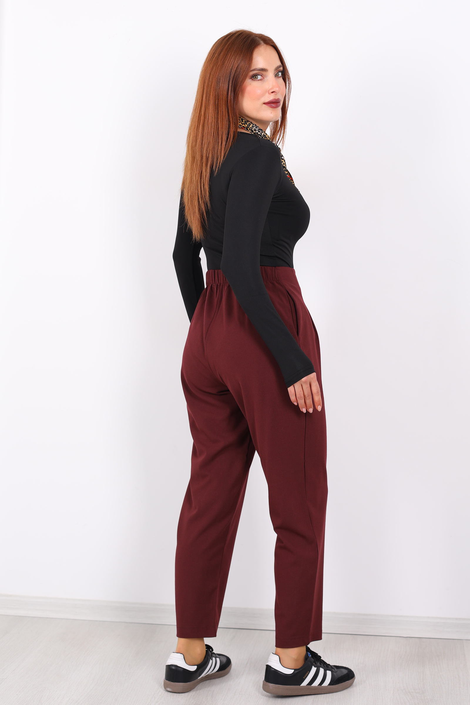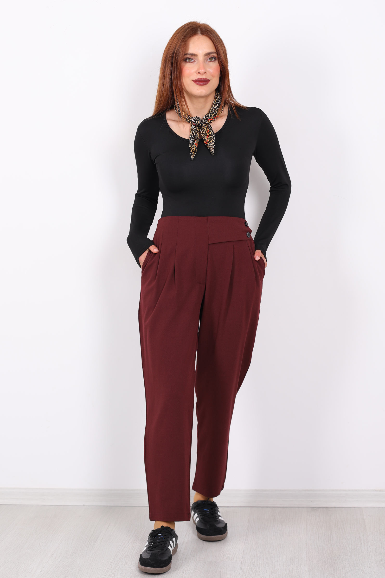 Bordo havuç pantolon, zarif çizgilerle modern bir duruş yakalayan şık bir parça. Kumaşında kullanılan karışım, yüksek kaliteli bir polyester-elastan yapıyı andırıyor; bu sayede pantolon hem dayanaklı hem de esneme kabiliyeti yüksek bir his sunuyor. Polyester, dış etkilere karşı dayanıklılığıyla bilinirken, elastan eklemesi hareket özgürlüğünü artırır ve bele oturuşta konfor katar.Belinde yer alan yarım kemer detayı, pantolona hem yapı hem karakter kazandırıyor. Kemerin iki yanında bulunan çift düğme, hem dekoratif hem de fonksiyonel bir dokunuş; bu düğmeler bele hafif bir vurgu yaparak pantolonun siluetini daha dengeli ve feminen bir hale getiriyor.