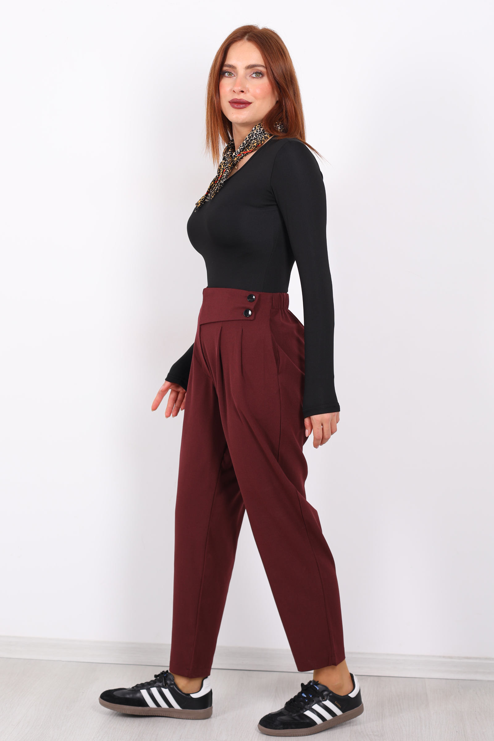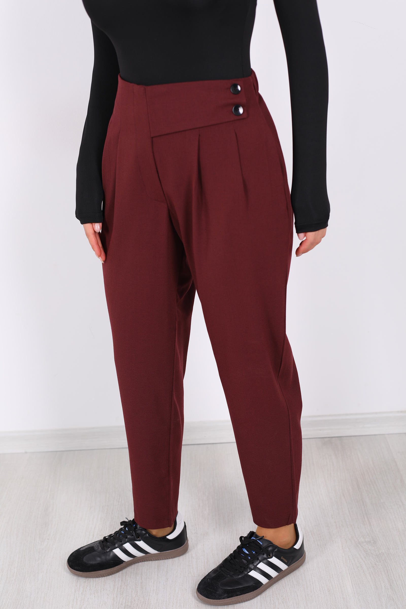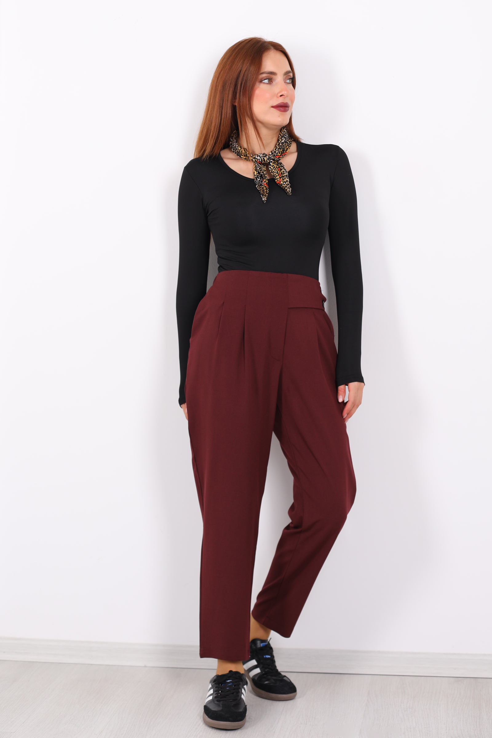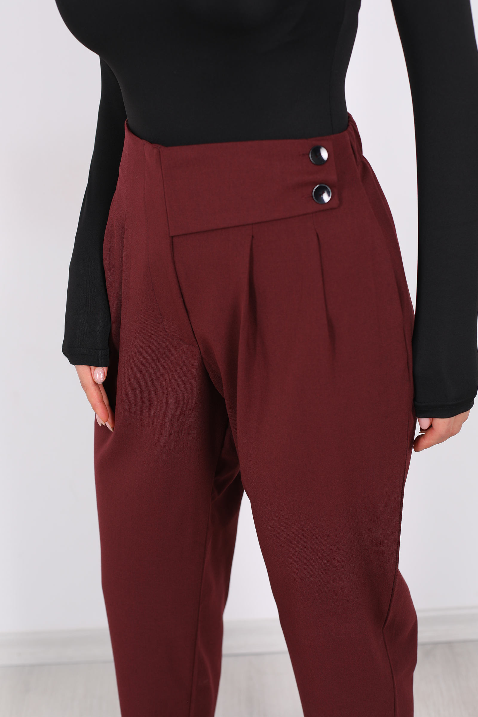 Bordo havuç pantolon, zarif çizgilerle modern bir duruş yakalayan şık bir parça. Kumaşında kullanılan karışım, yüksek kaliteli bir polyester-elastan yapıyı andırıyor; bu sayede pantolon hem dayanaklı hem de esneme kabiliyeti yüksek bir his sunuyor. Polyester, dış etkilere karşı dayanıklılığıyla bilinirken, elastan eklemesi hareket özgürlüğünü artırır ve bele oturuşta konfor katar.Belinde yer alan yarım kemer detayı, pantolona hem yapı hem karakter kazandırıyor. Kemerin iki yanında bulunan çift düğme, hem dekoratif hem de fonksiyonel bir dokunuş; bu düğmeler bele hafif bir vurgu yaparak pantolonun siluetini daha dengeli ve feminen bir hale getiriyor.