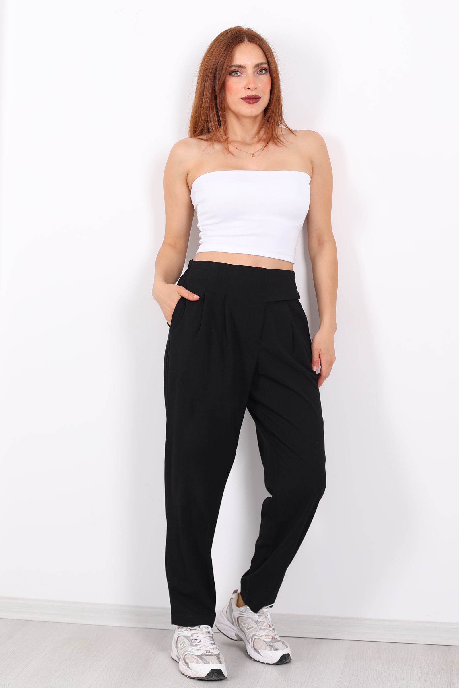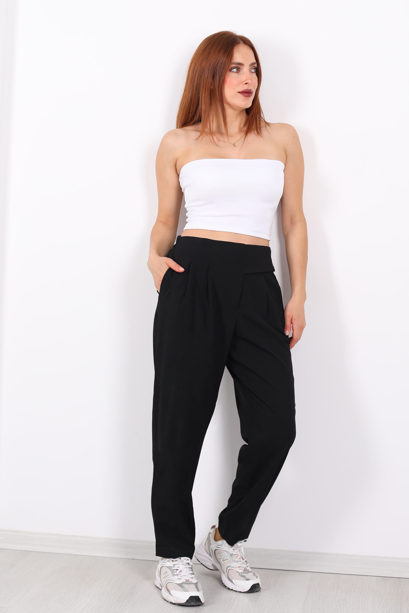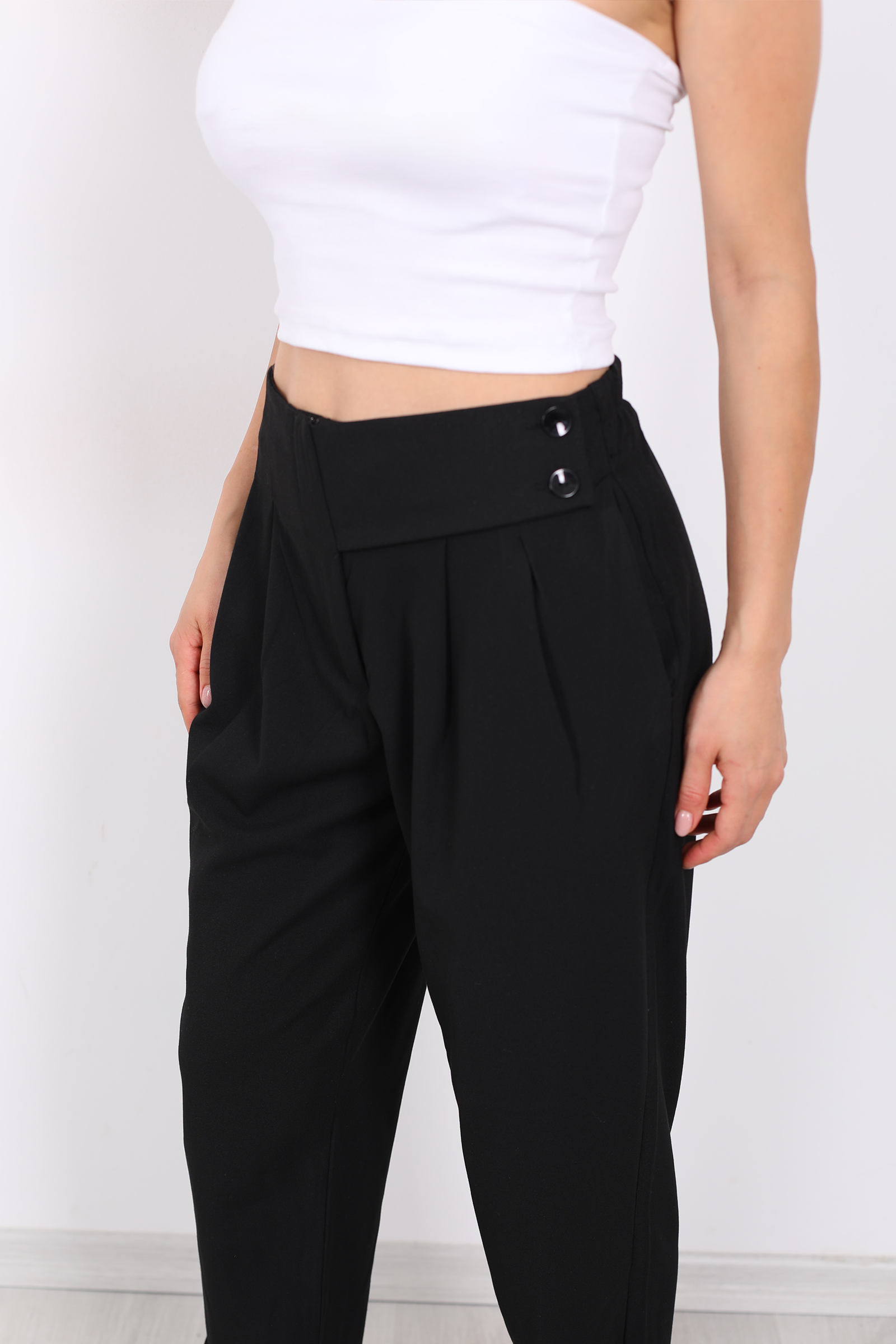Siyahın her zamanki zarafetiyle birleşen bu havuç pantolon, minimal detaylarla güçlü bir duruş sunuyor. Bel kısmındaki yarım kemer formu, çift düğme tasarımıyla tamamlanarak pantolona modern ve dengeli bir yapı katar. Bu düğmeler, görsel olarak sade olmasını engellemeden bele hafif bir vurgu yapıyor.Havuç kesimi sayesinde pantolon, kalçadan paçaya doğru hafifçe daralır; bu, klasik pantolonların resmi dokusunu korurken hareket rahatlığı sağlar.