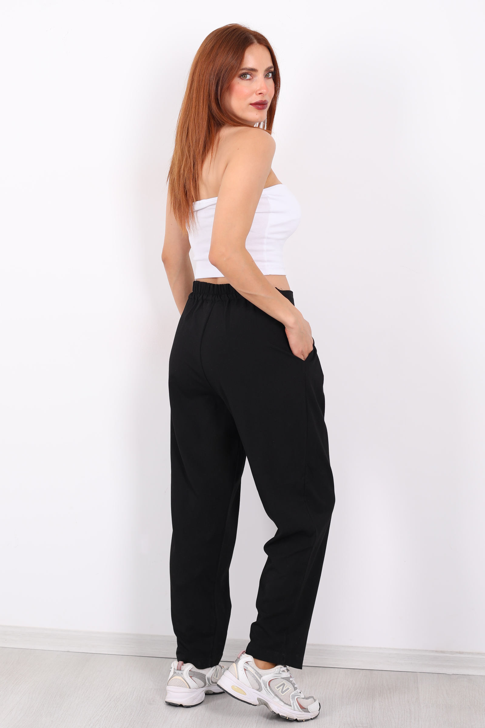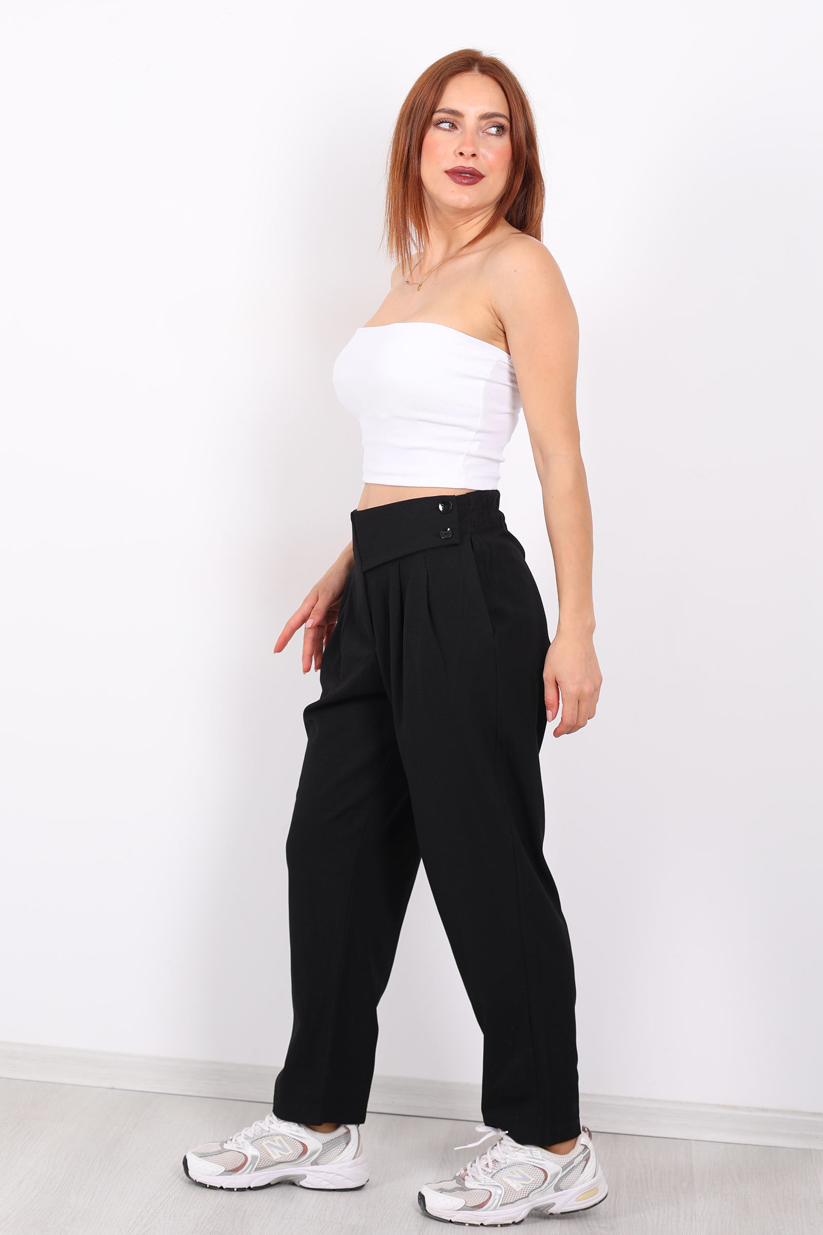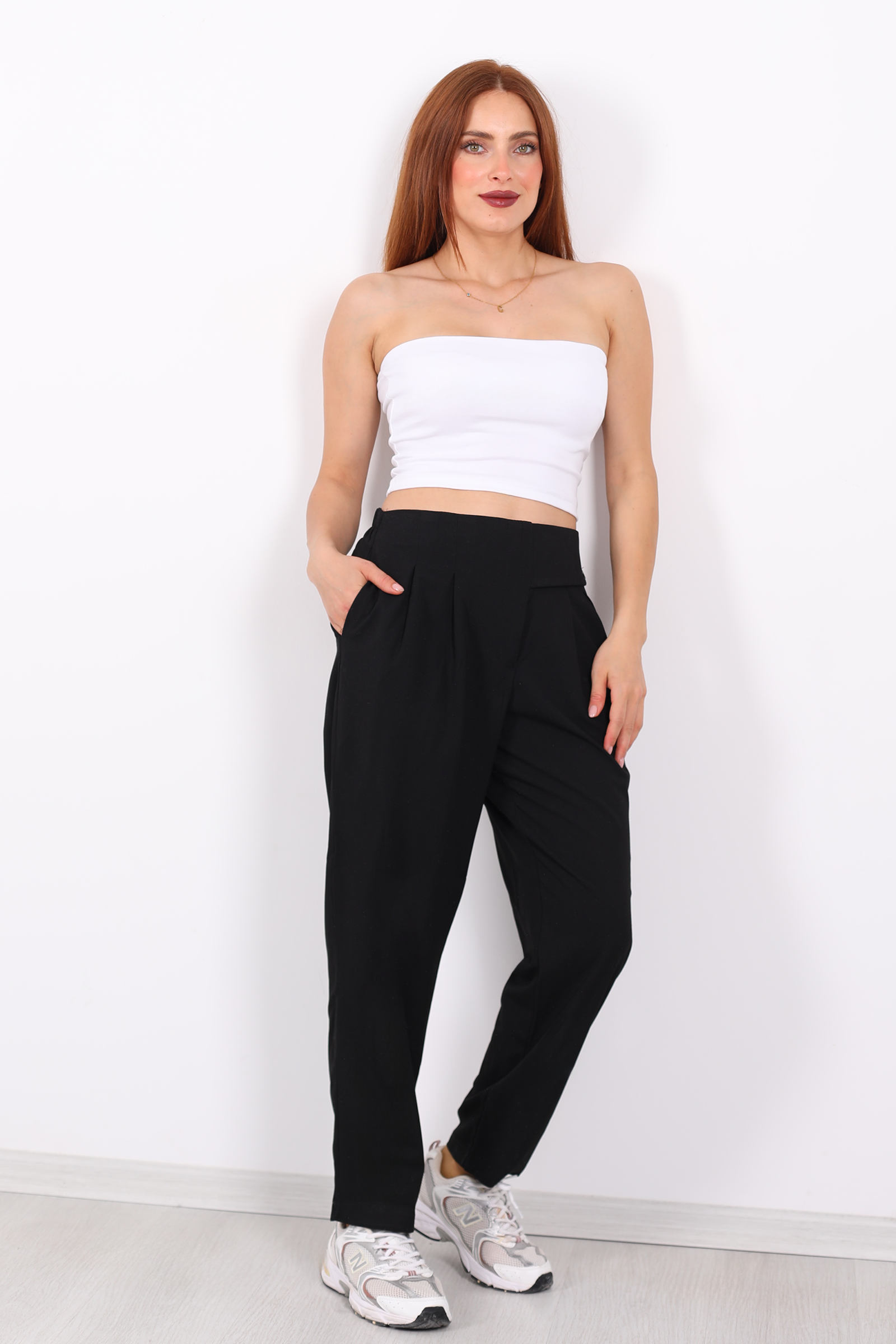 Siyahın her zamanki zarafetiyle birleşen bu havuç pantolon, minimal detaylarla güçlü bir duruş sunuyor. Bel kısmındaki yarım kemer formu, çift düğme tasarımıyla tamamlanarak pantolona modern ve dengeli bir yapı katar. Bu düğmeler, görsel olarak sade olmasını engellemeden bele hafif bir vurgu yapıyor.Havuç kesimi sayesinde pantolon, kalçadan paçaya doğru hafifçe daralır; bu, klasik pantolonların resmi dokusunu korurken hareket rahatlığı sağlar.