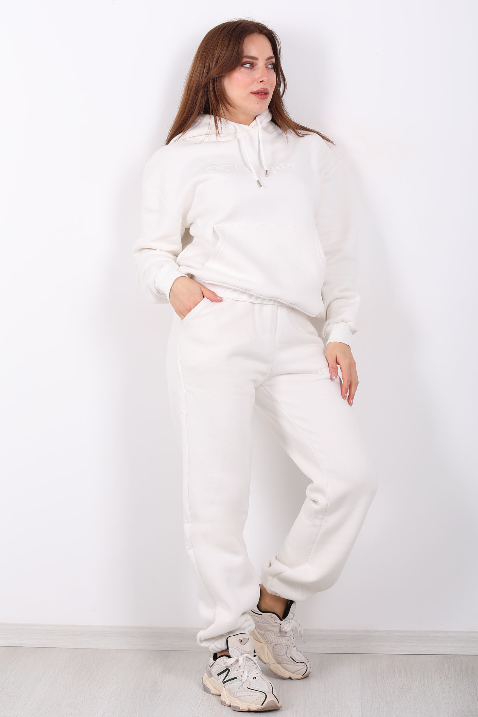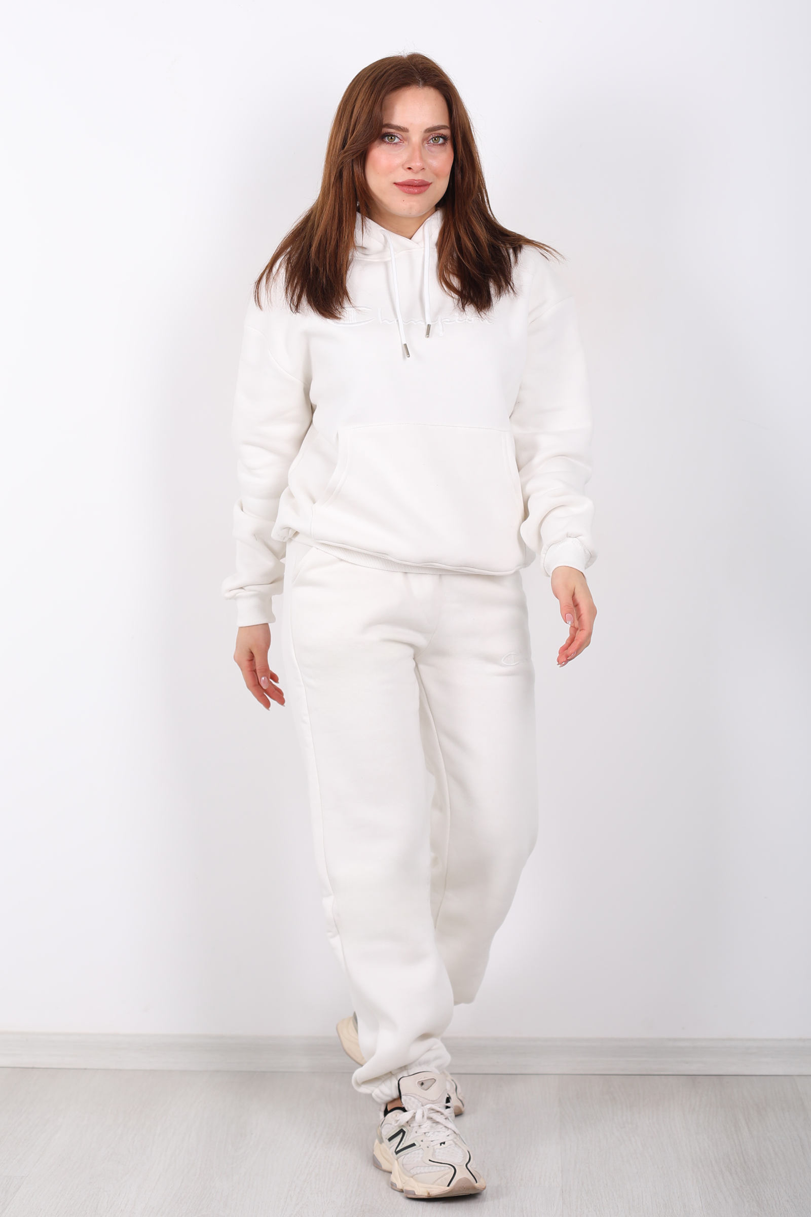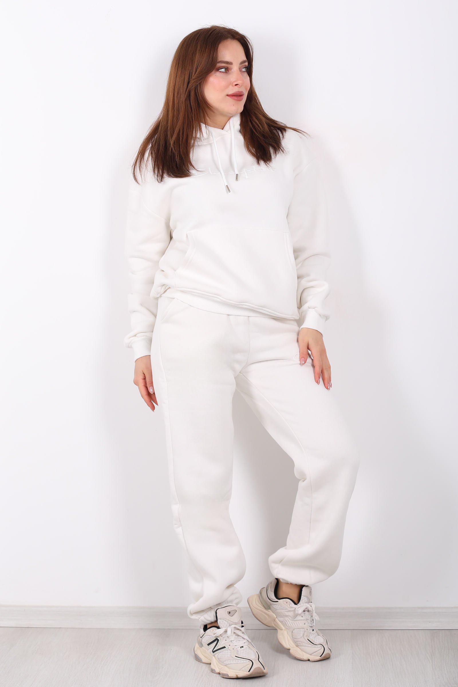 Beyazın zarifliğiyle tasarlanmış bu eşofman takımı, günlük stilinize şıklık katıyor. Yazı nakış detayları ve kanguru cepleriyle modern bir dokunuş eklerken, üç iplik kumaşıyla soğuk günlerde sıcak tutuyor.Beyaz veya açık renk sneaker’larla kombinleyerek enerjik bir görünüm elde edebilirsin.Beyaz yazı nakışlı kanguru cepli üç iplik kadın eşofman takımı sıcak şardonlu kumaşı ve modern tasarımıyla stilinde konforu yakala!