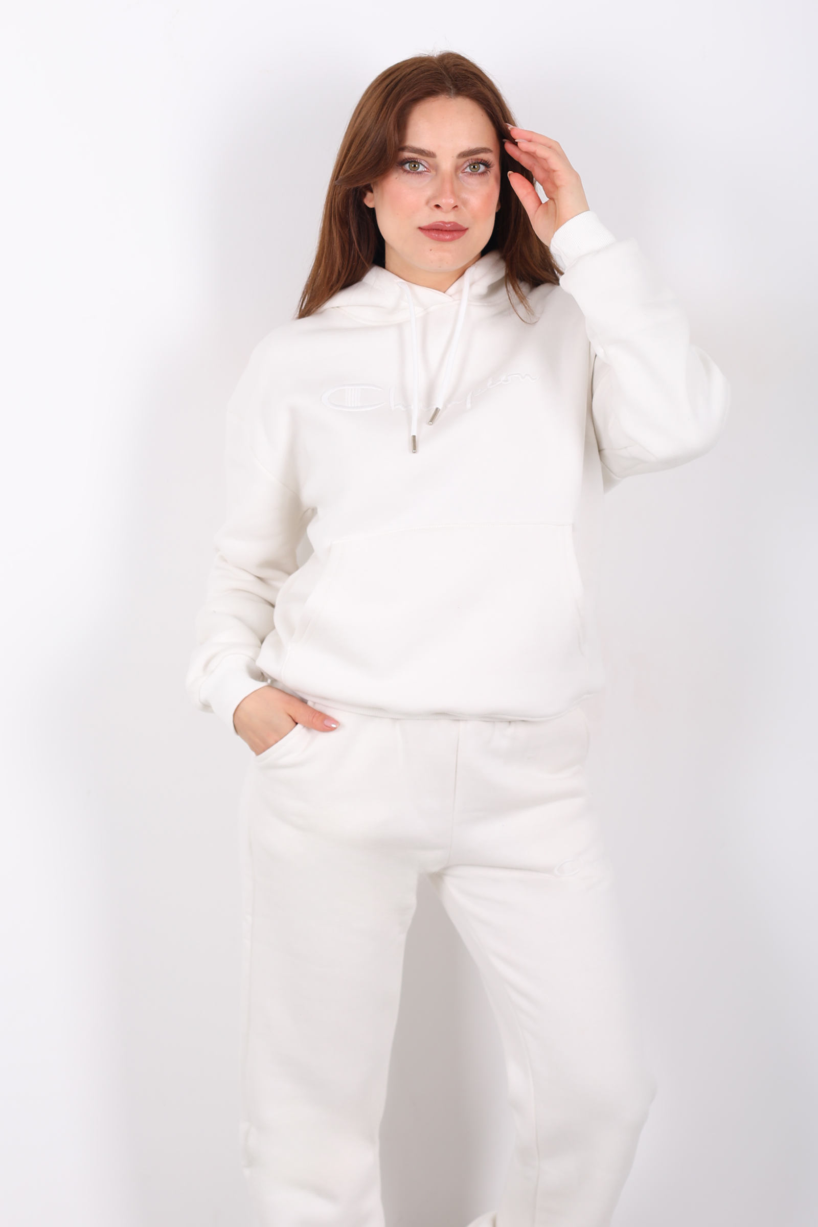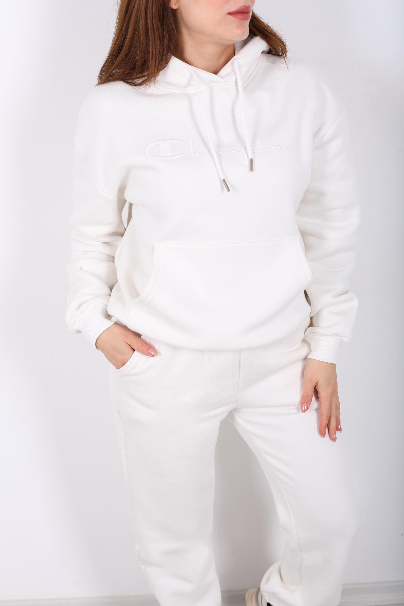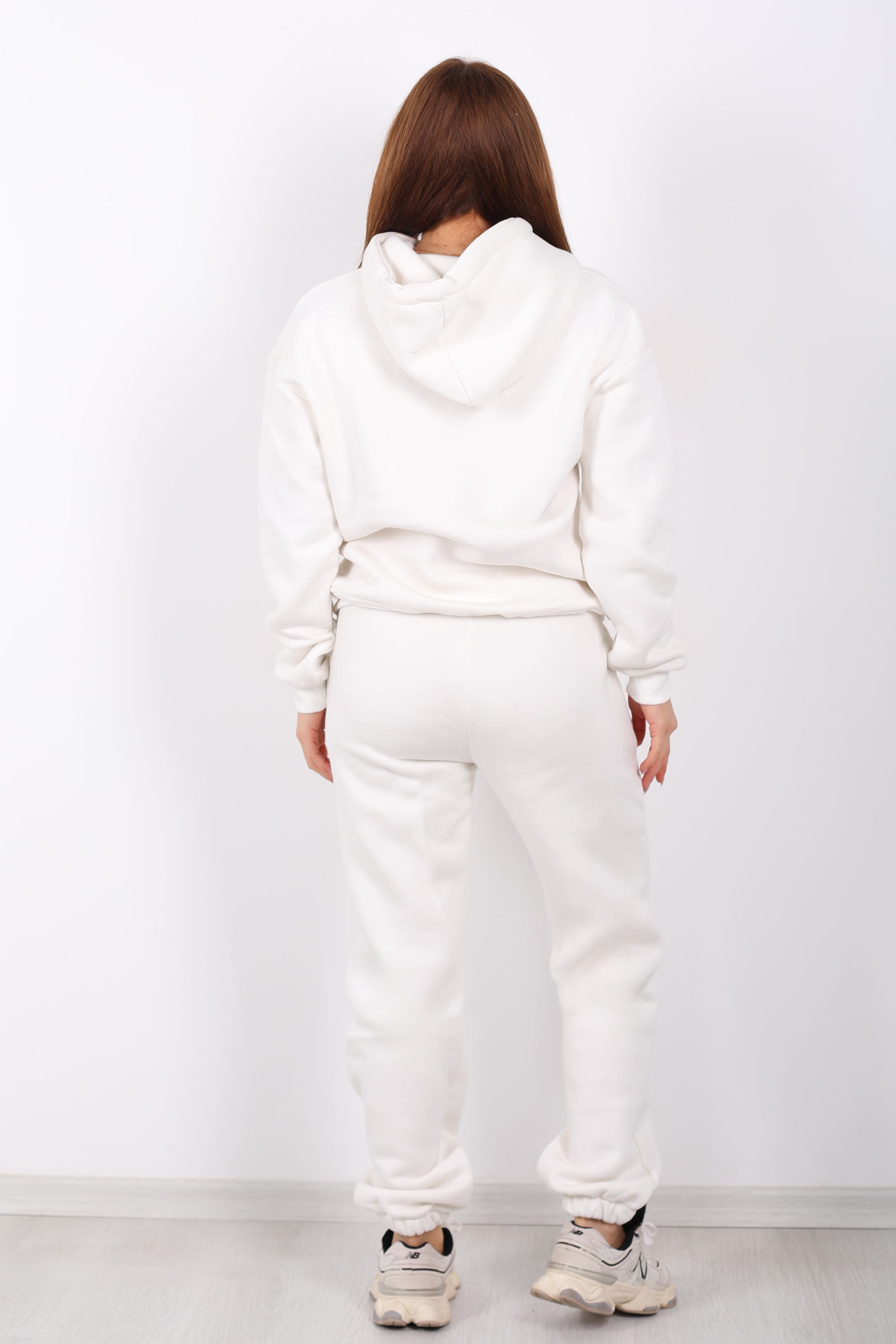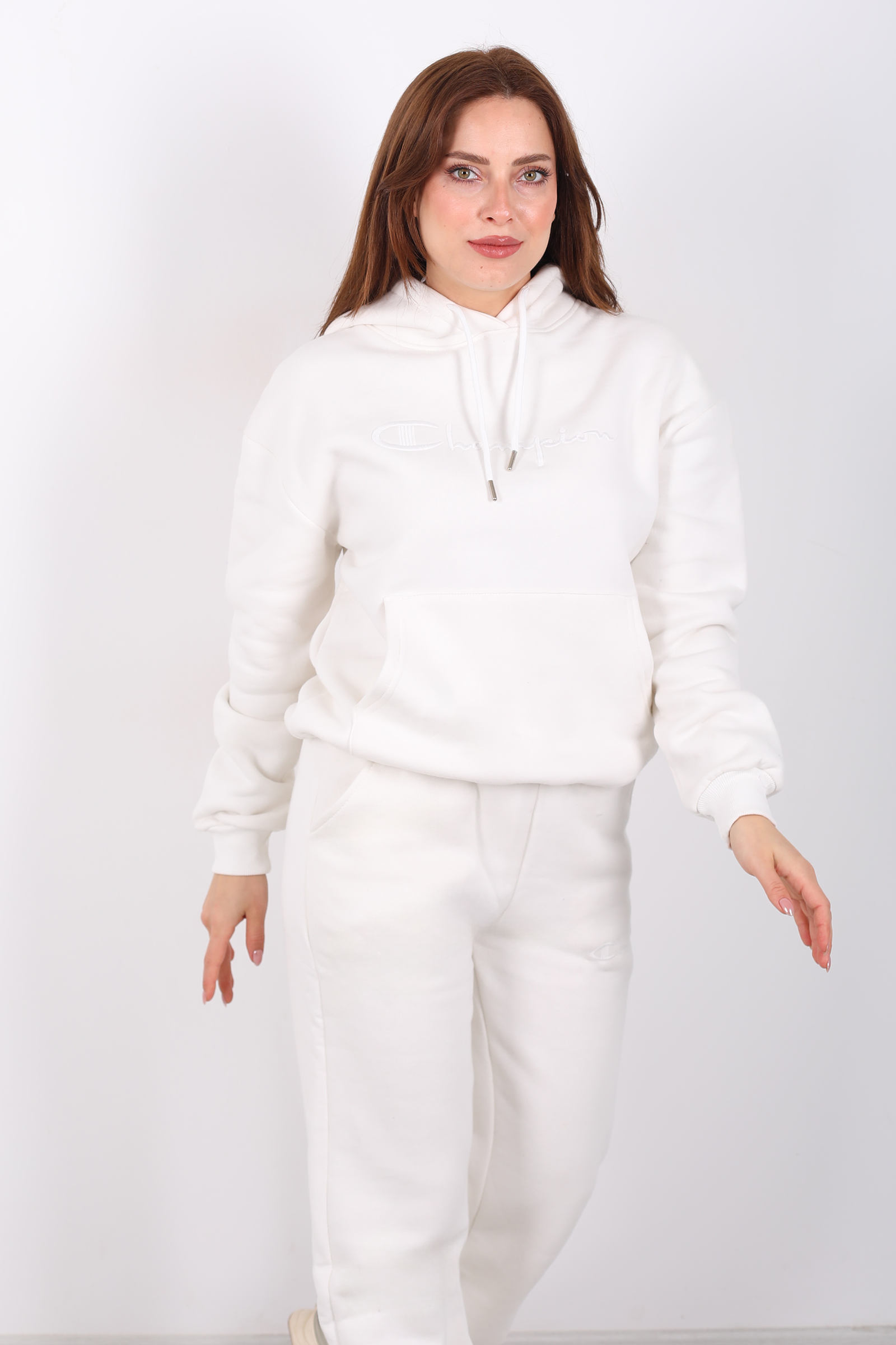 Beyazın zarifliğiyle tasarlanmış bu eşofman takımı, günlük stilinize şıklık katıyor. Yazı nakış detayları ve kanguru cepleriyle modern bir dokunuş eklerken, üç iplik kumaşıyla soğuk günlerde sıcak tutuyor.Beyaz veya açık renk sneaker’larla kombinleyerek enerjik bir görünüm elde edebilirsin.Beyaz yazı nakışlı kanguru cepli üç iplik kadın eşofman takımı sıcak şardonlu kumaşı ve modern tasarımıyla stilinde konforu yakala!