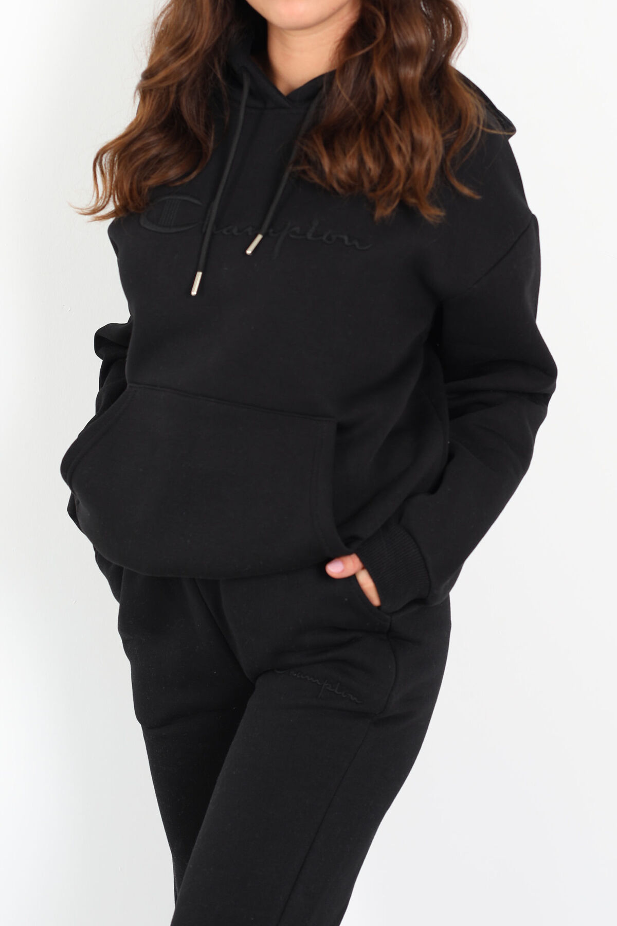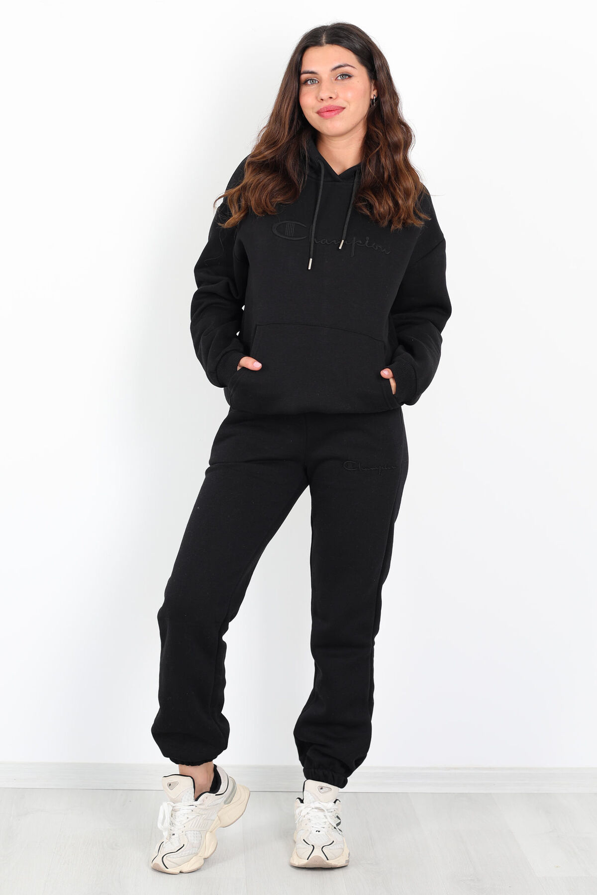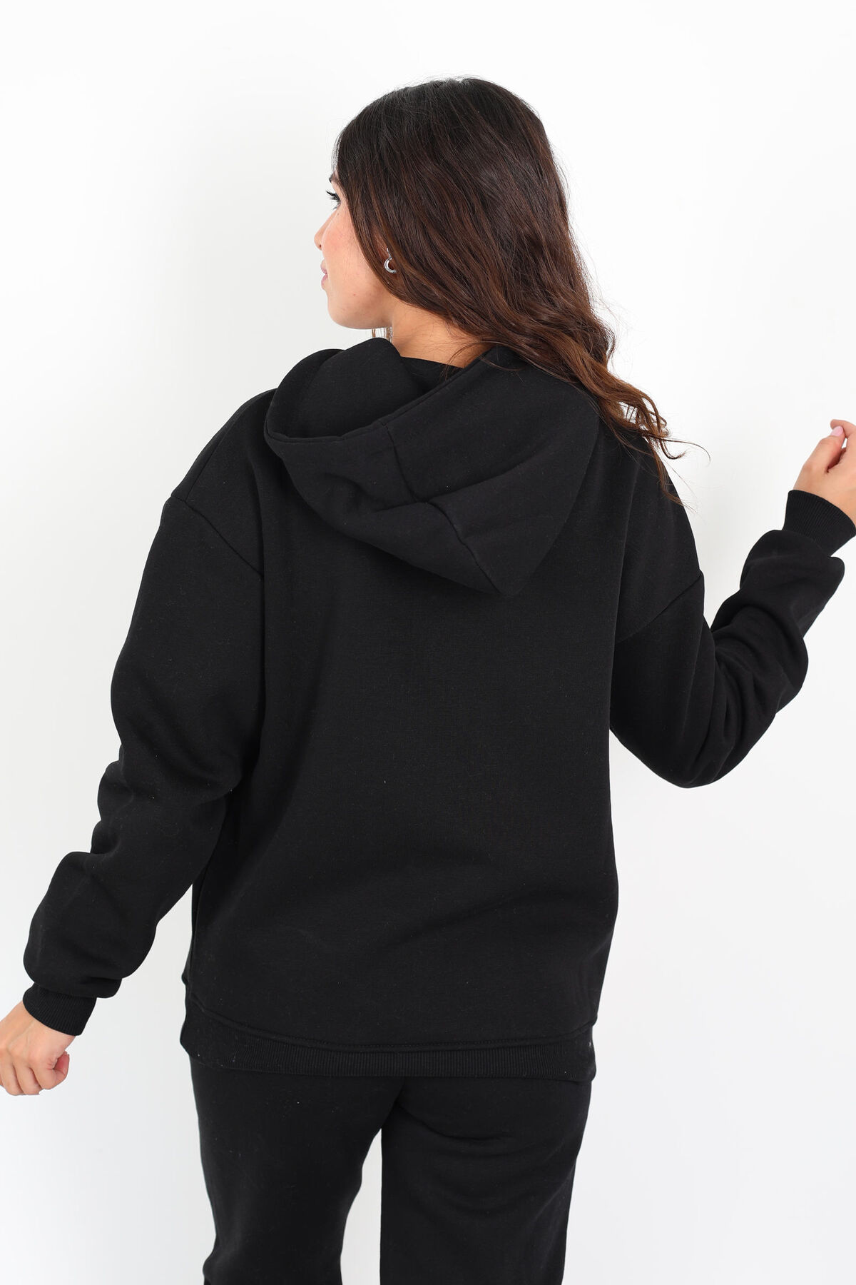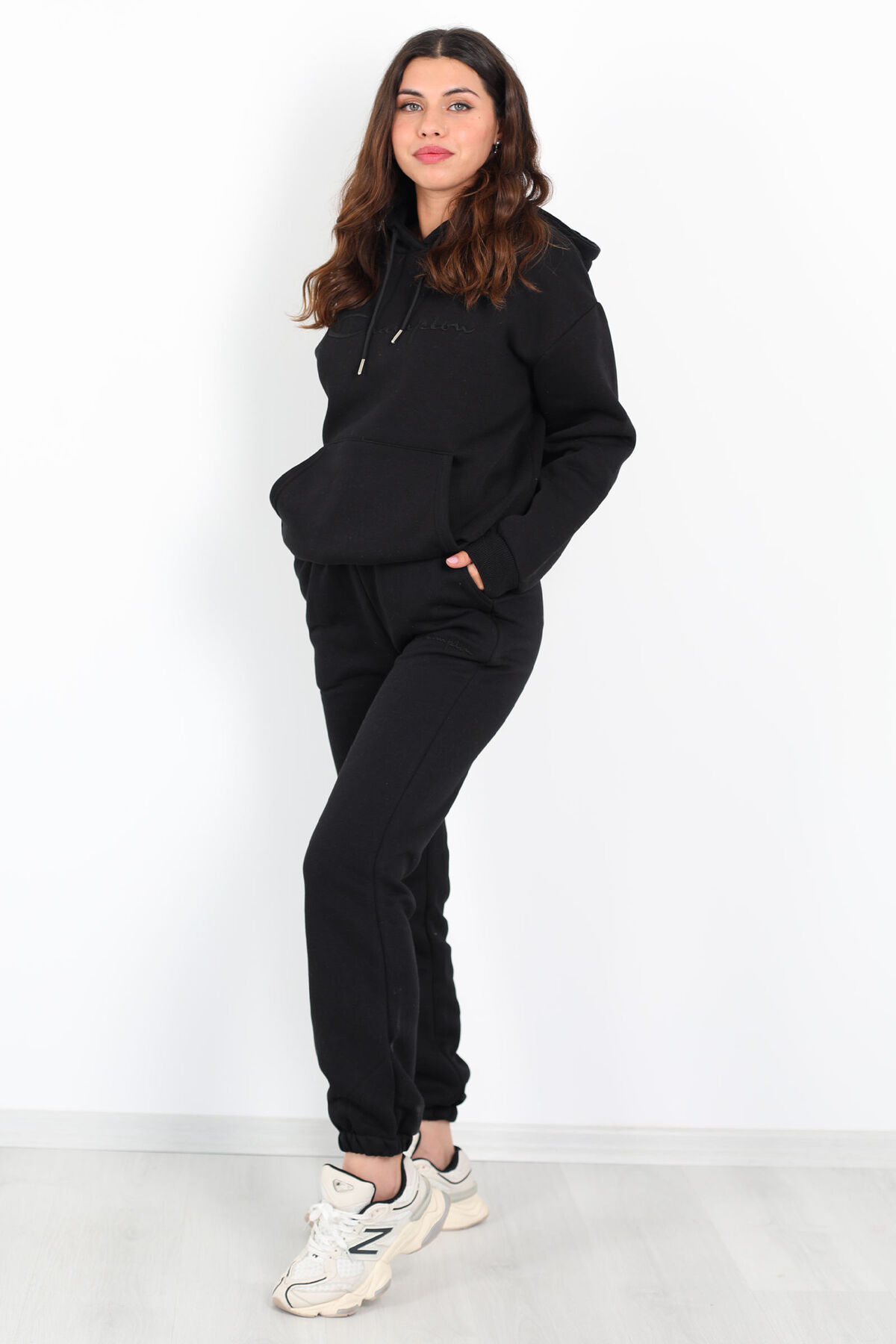 Siyahın zarif ve modern tonlarıyla tasarlanmış bu eşofman takımı, yazı nakış detayları ve kanguru cepli tasarımıyla hem şıklığı hem de rahatlığı bir arada sunuyor. Üç iplik kumaşı ve içi şardonlu yapısıyla soğuk havalarda bile sıcak tutar, yumuşaklık hissi verir. Vücuda oturan normal kalıbı ve uzun paçalı altı ile günlük kombinlerinizin vazgeçilmezi olmaya aday.