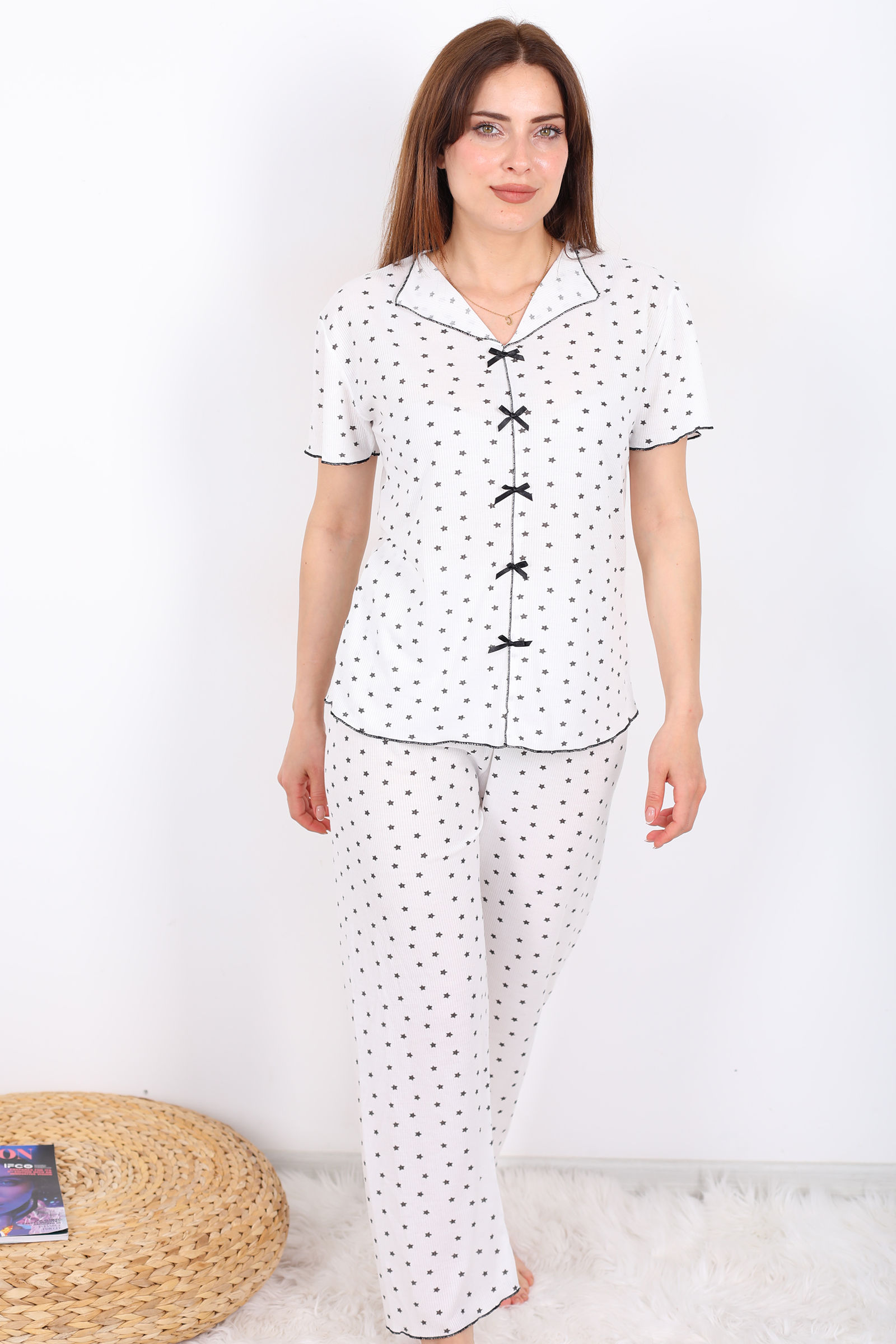 Yıldız Desenli Fiyonklu Beyaz Kadın Pijama Takımı