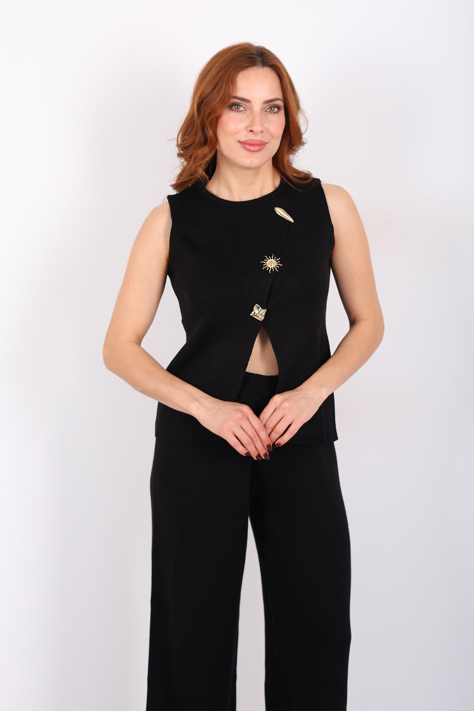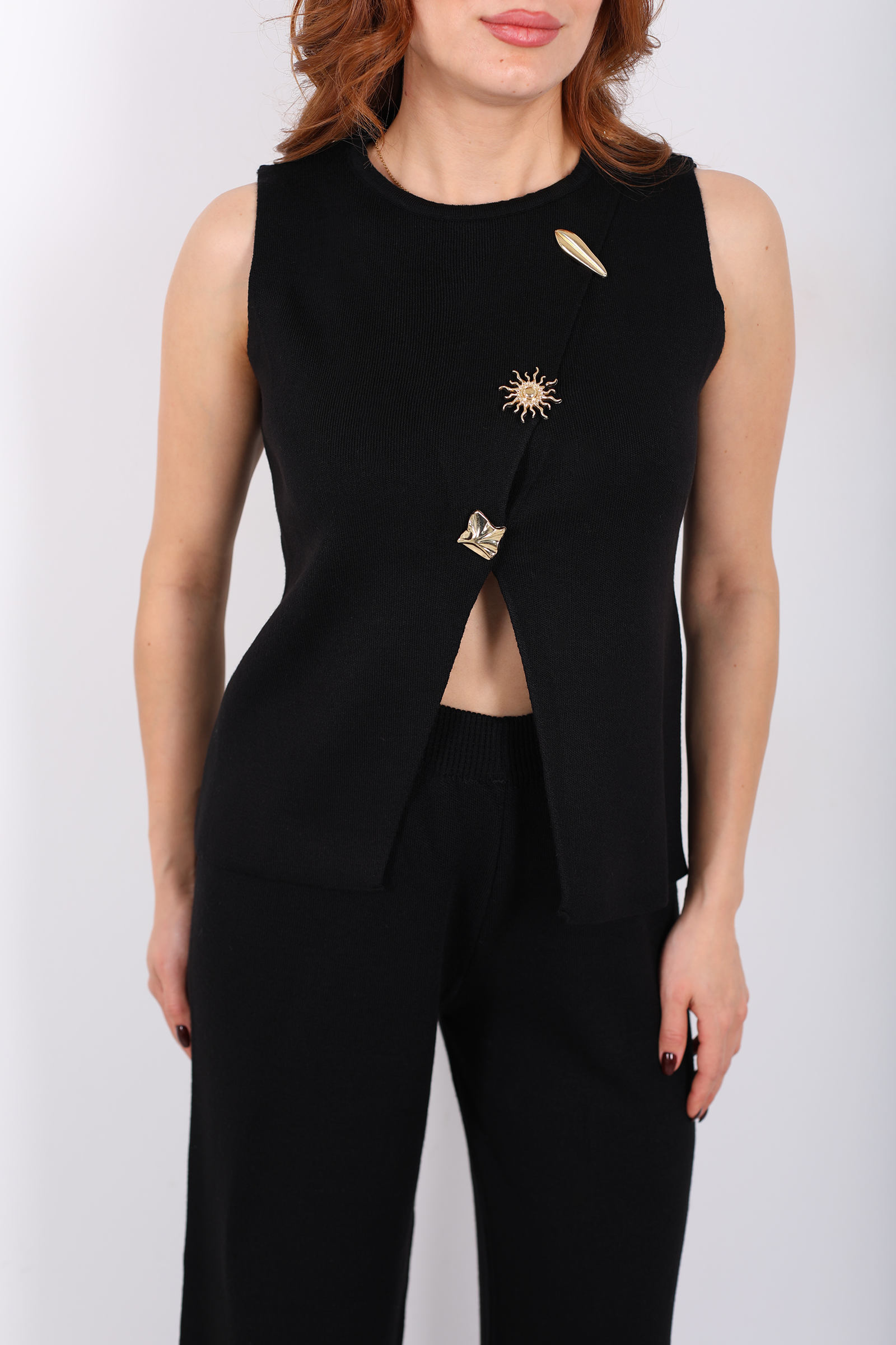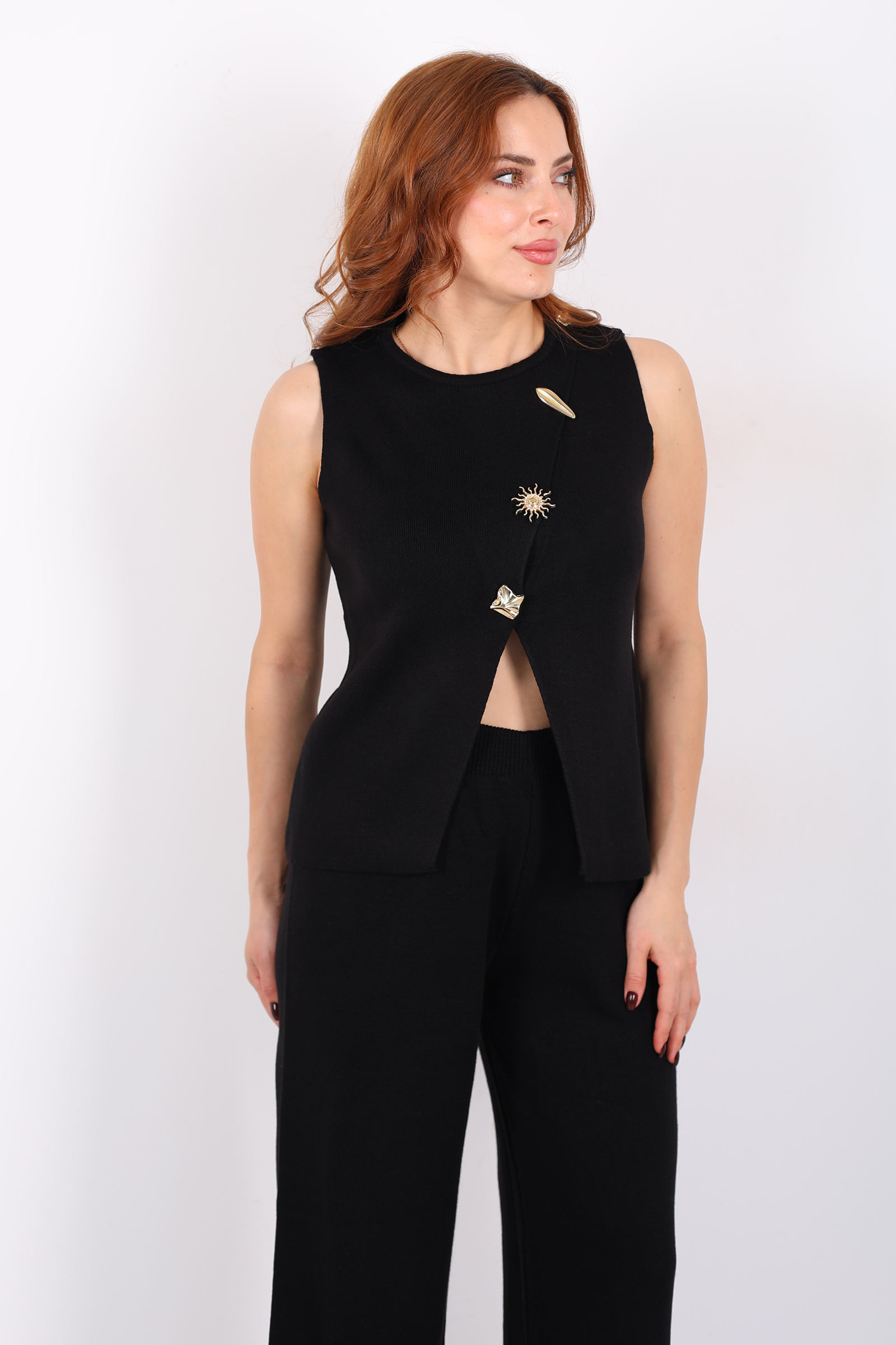 Yırtmaç Detaylı Aksesuarlı Kolsuz Kadın Siyah Triko Takım