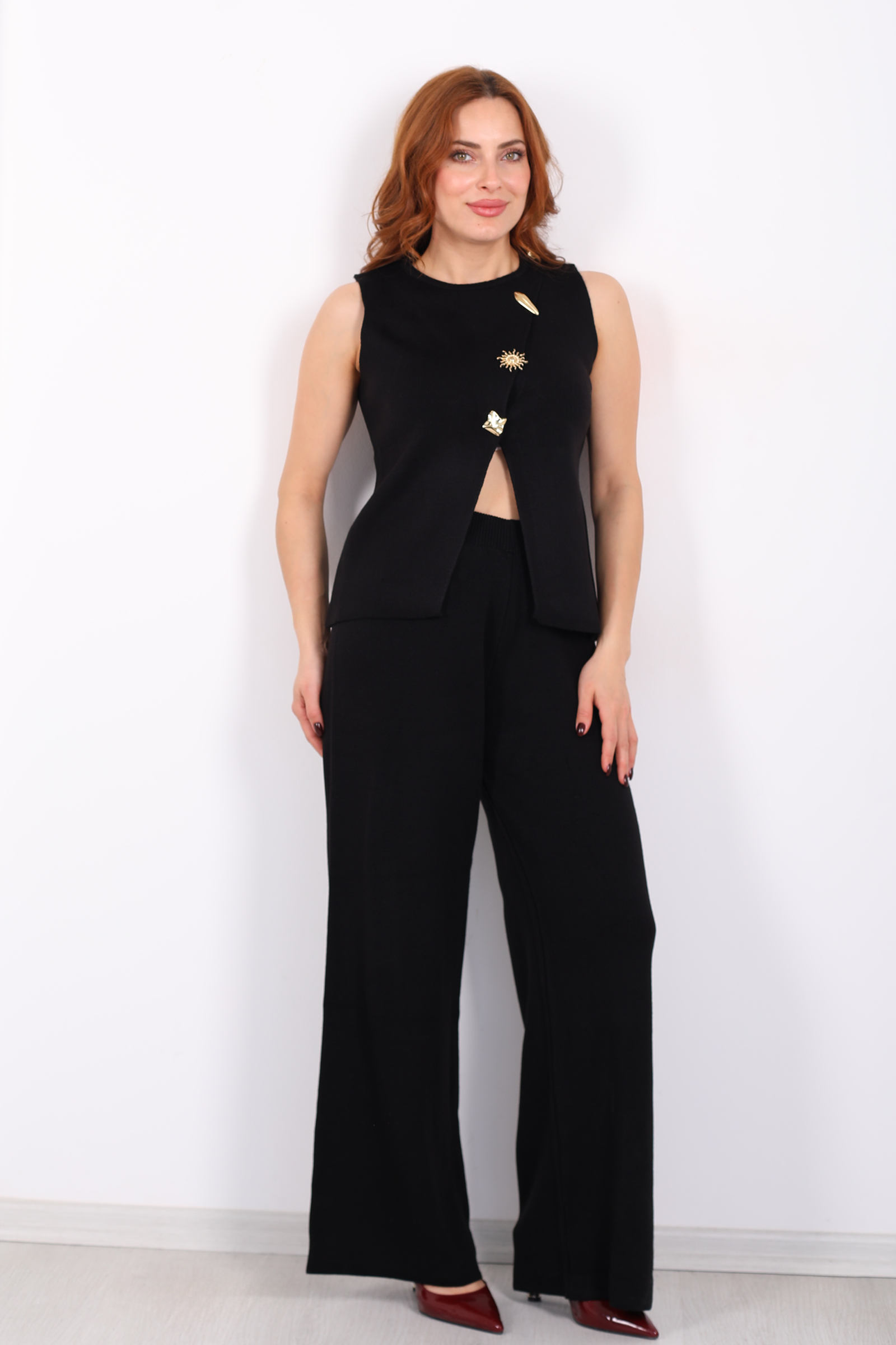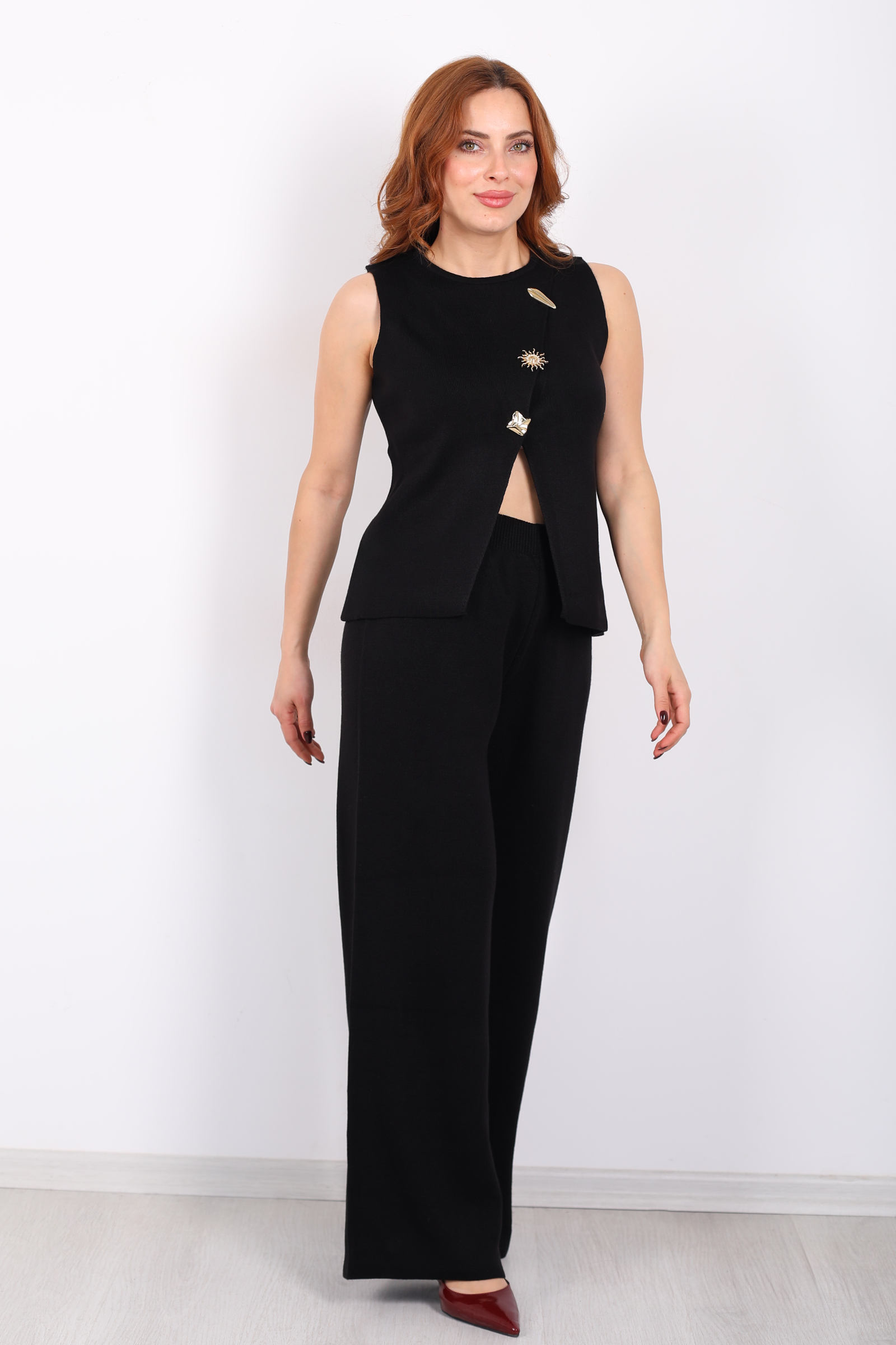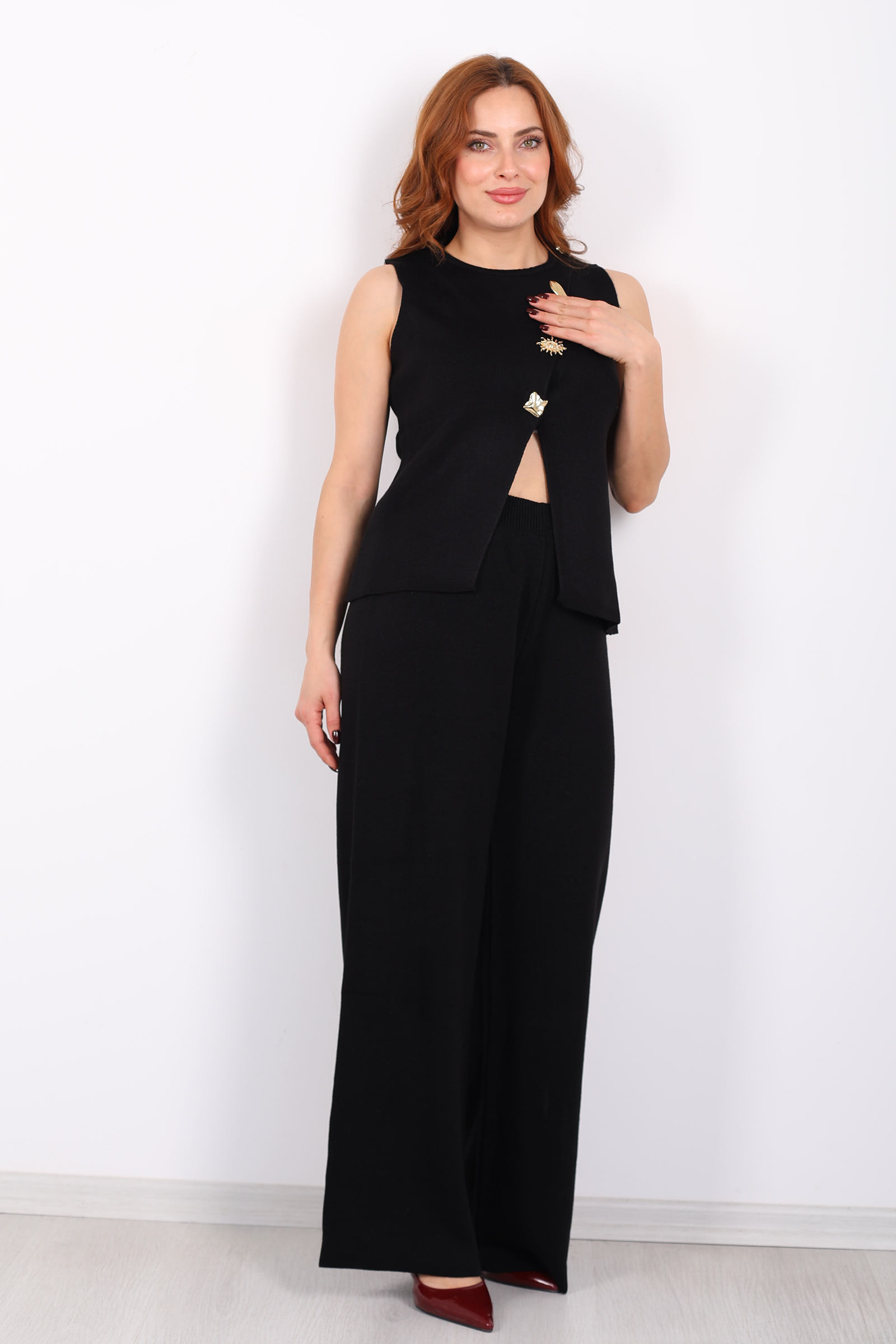 Yırtmaç Detaylı Aksesuarlı Kolsuz Kadın Siyah Triko Takım