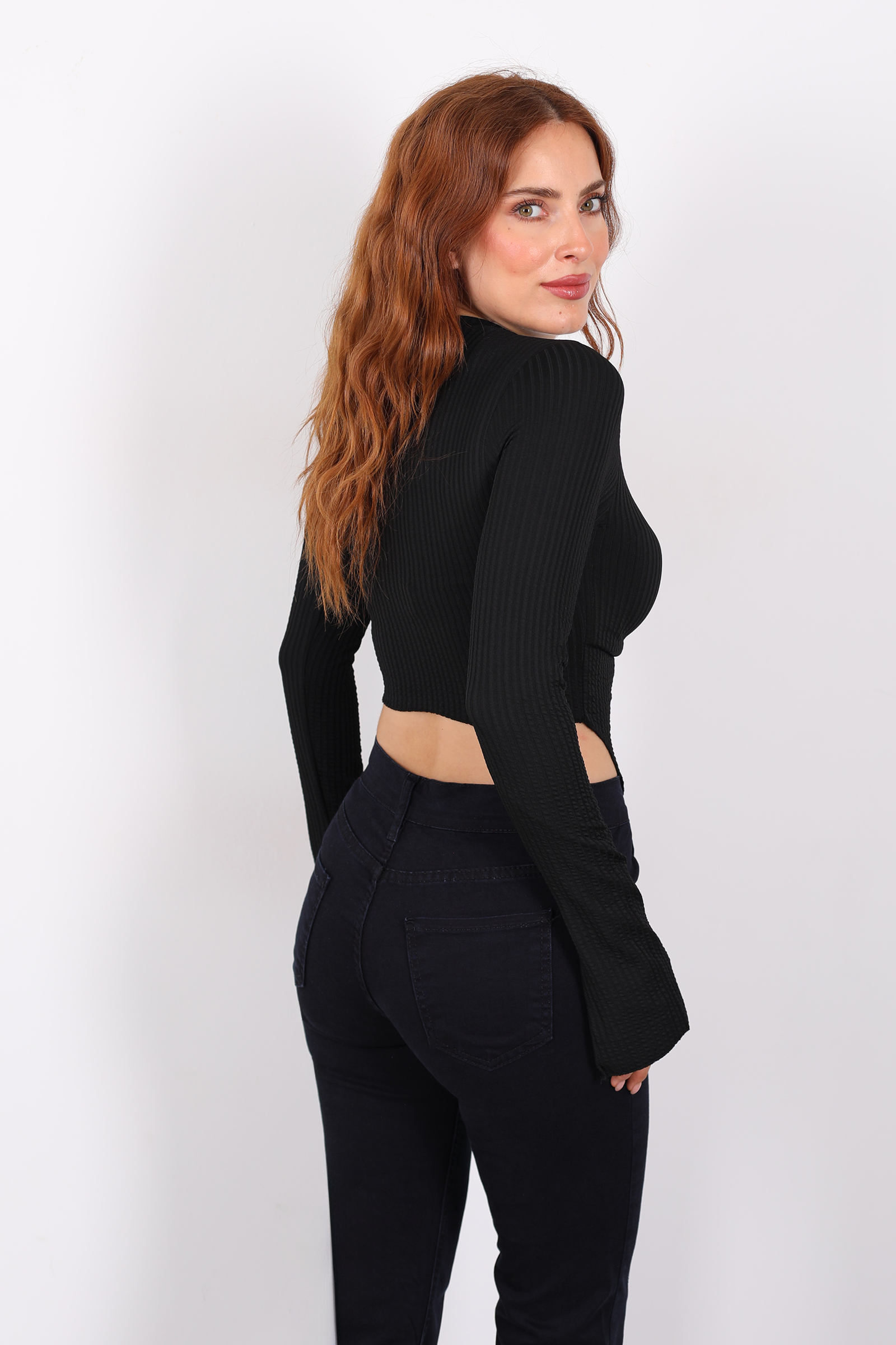 Gece karası siyahın zarafetini hacimli İspanyol kollara ve zarif yırtmaçlara taşıyan bu bluz, tarzına cesur ve romantik bir dokunuş katar. Kolların geniş ve kabarık duruşu, her hareketinde akıcı bir hava yaratır; yırtmaçlar ise bileğe doğru inerek bluzun siluetine hafif bir hareket kazandırır.Kumaşı, hafiflik ve akıcılık dengesi sağlayan bir karışımdan üretilmiş.