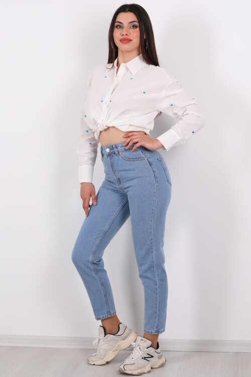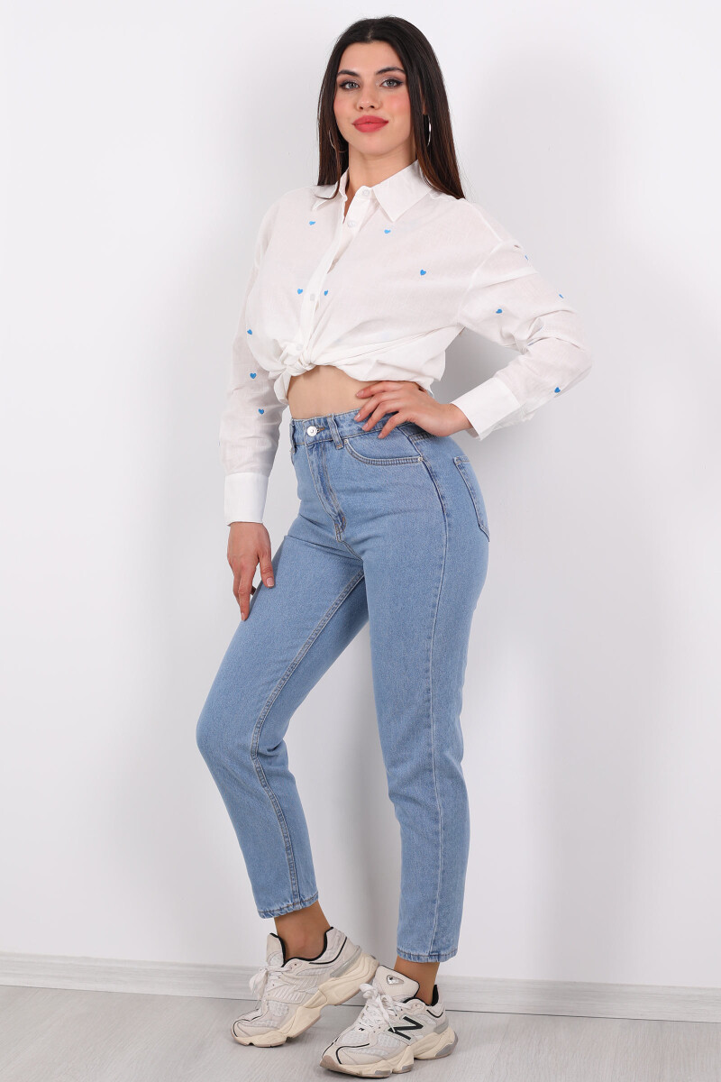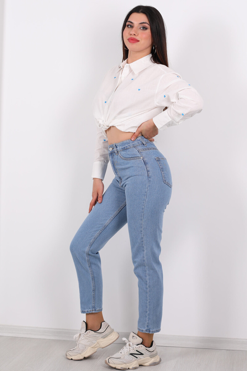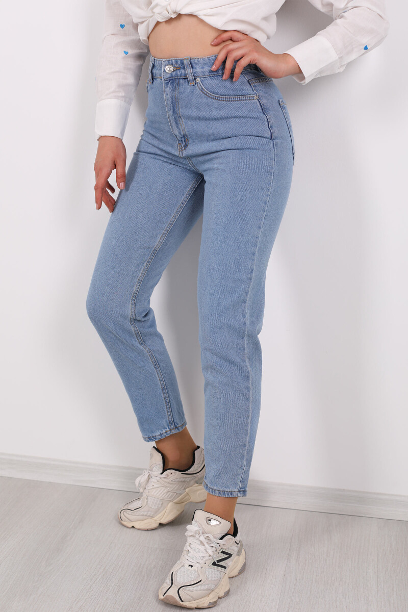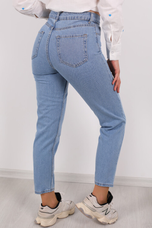 Yazın taptaze enerjisini stilinize taşıyan bu açık mavi mom kesim kot pantolon, hem feminen çizgileri hem de retro esintileri bir arada sunuyor. Yüksek bel detayıyla beli zarifçe kavrayan bu jean, geniş kalça ve paça kesimiyle 90’lar havasını modern dokunuşlarla yorumluyor. %100 denim kot kumaş kullanılarak üretilen bu model, nefes alabilir ve dayanıklı yapısıyla sizi gün boyu konforlu hissettirir. Normal kalıp kesimi sayesinde vücudu sıkmadan doğal bir silüet oluşturur