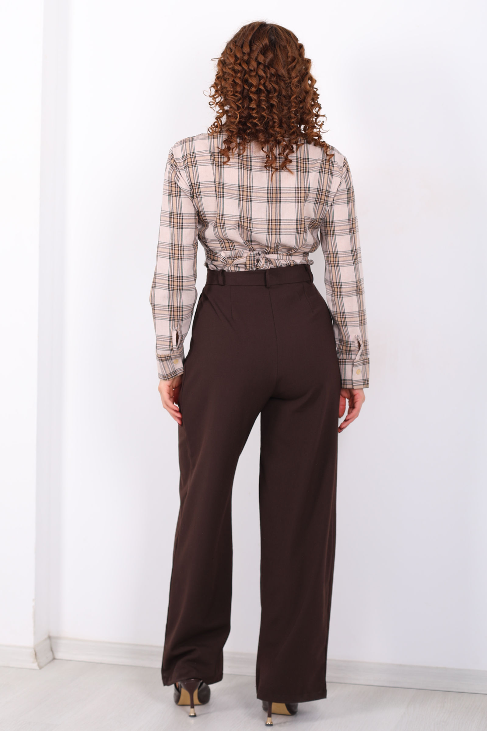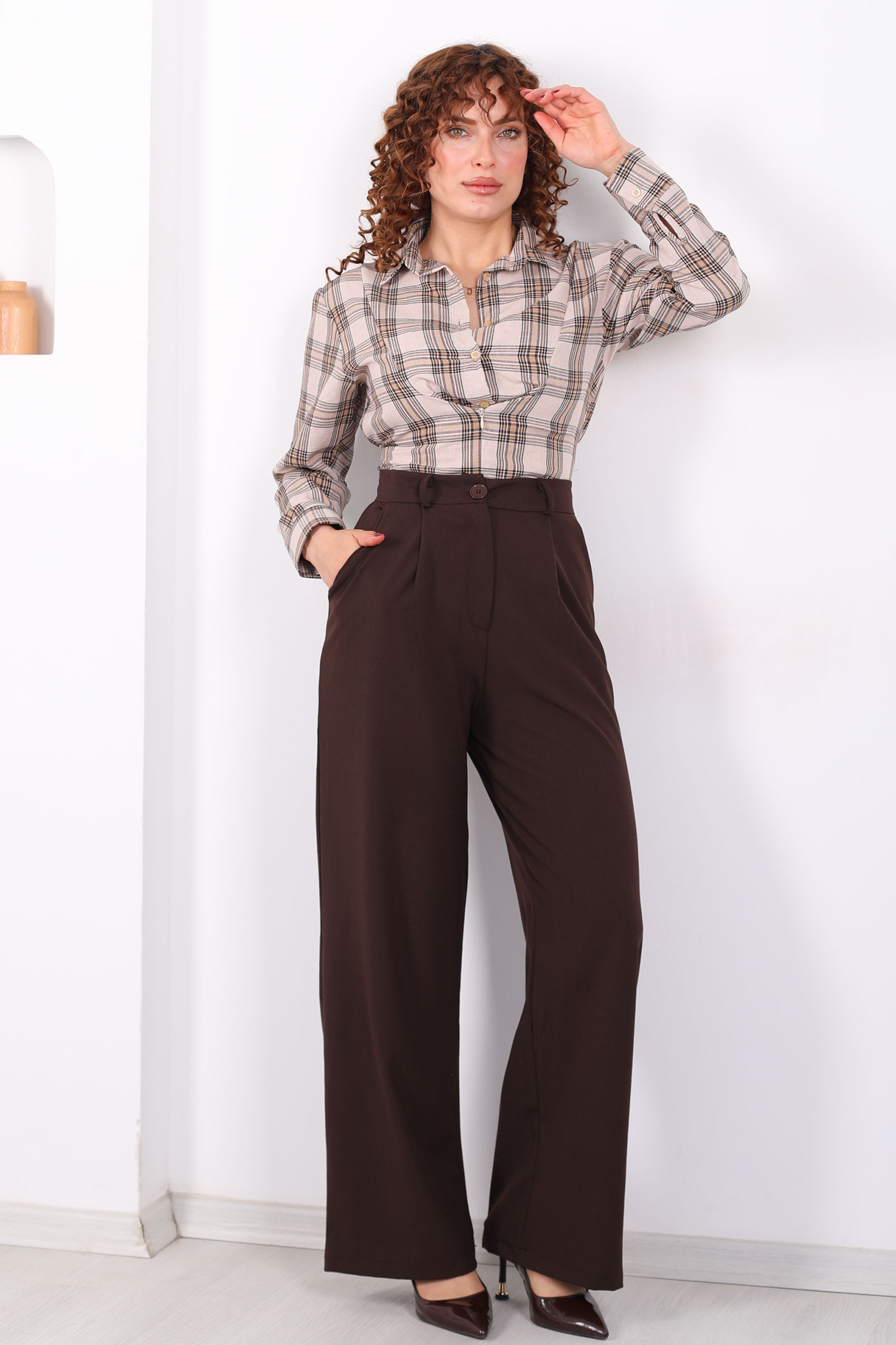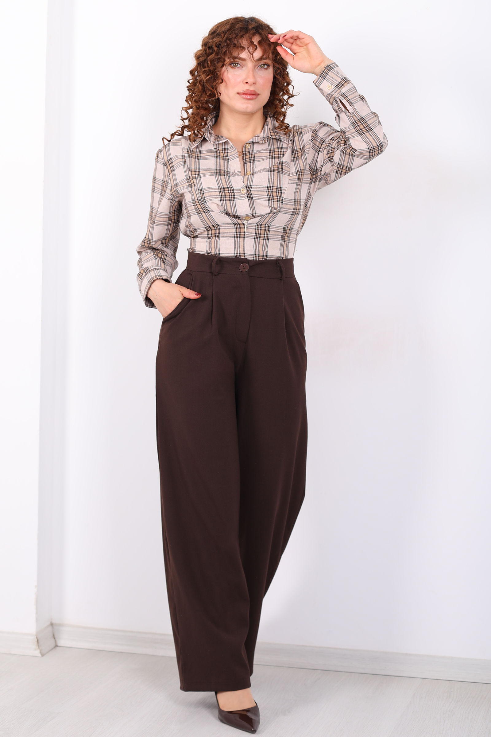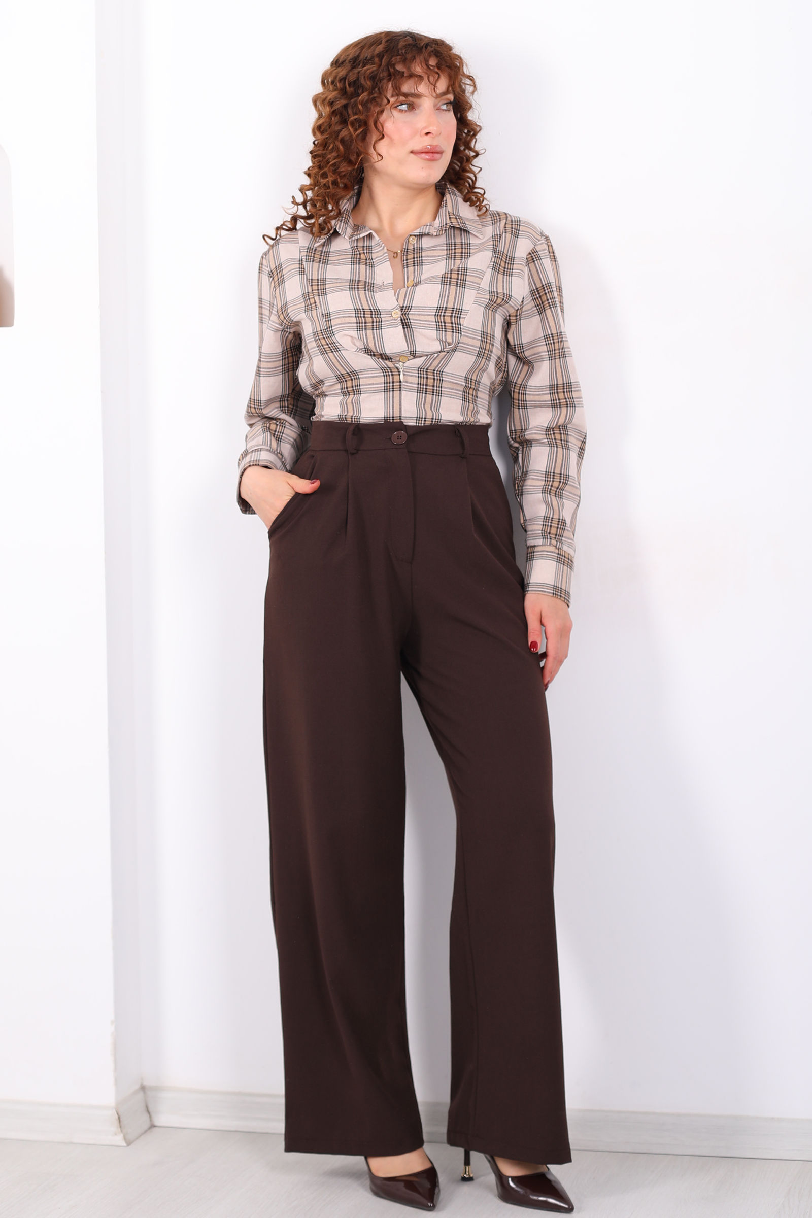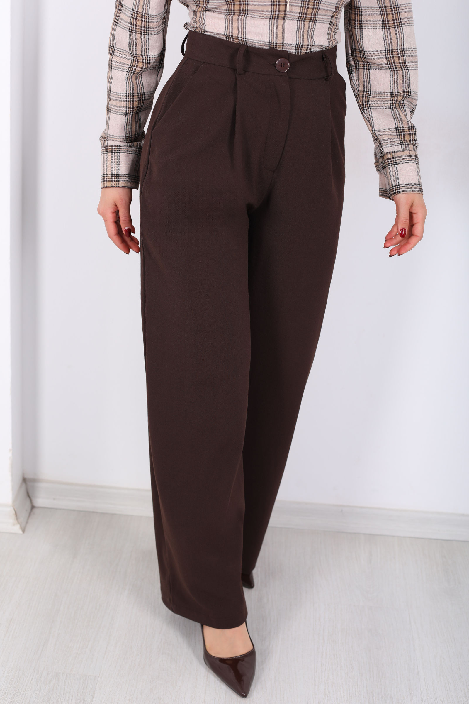 Yüksel Bel Pileli Cepli Kadın Acı Kahve Palazzo Pantolon