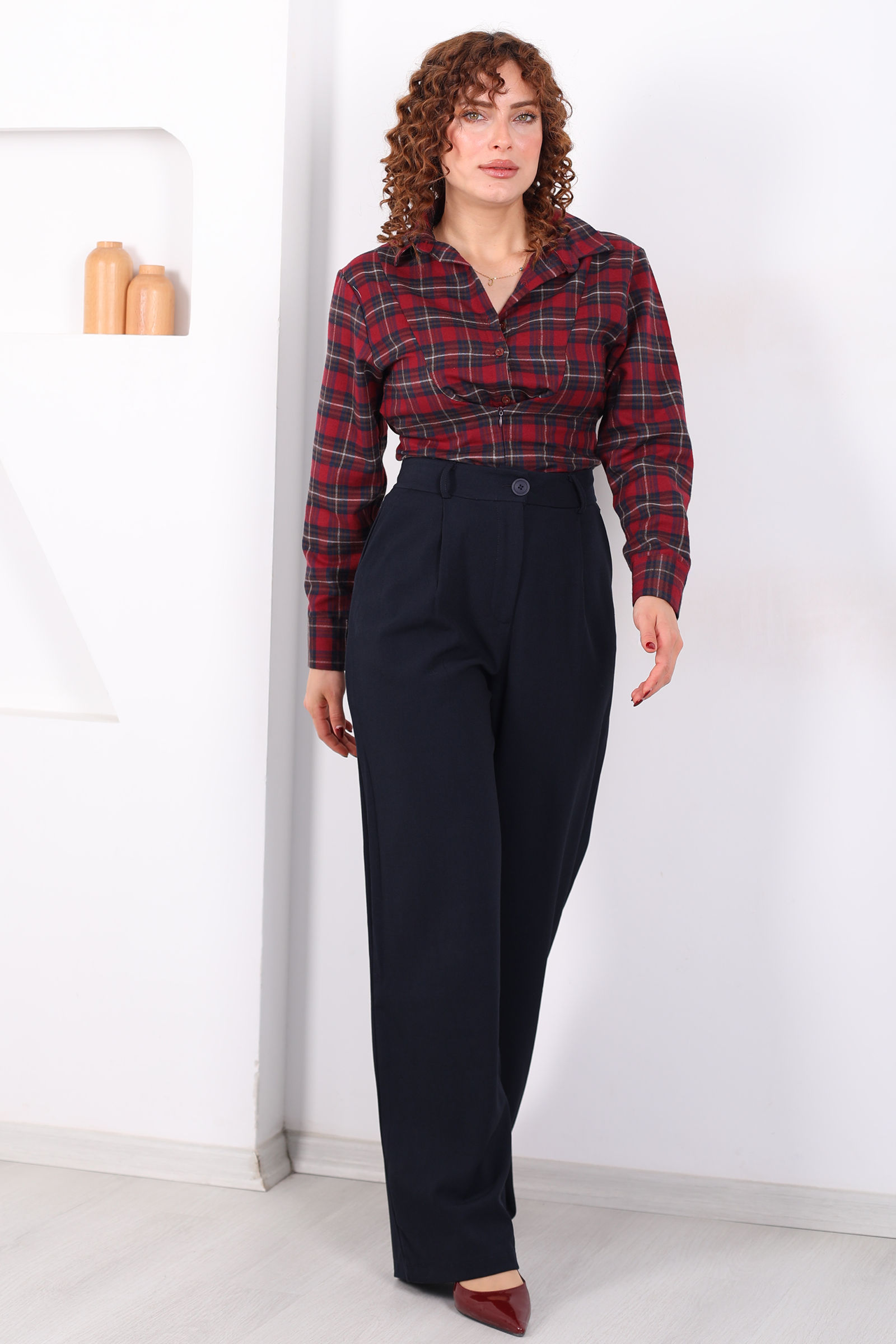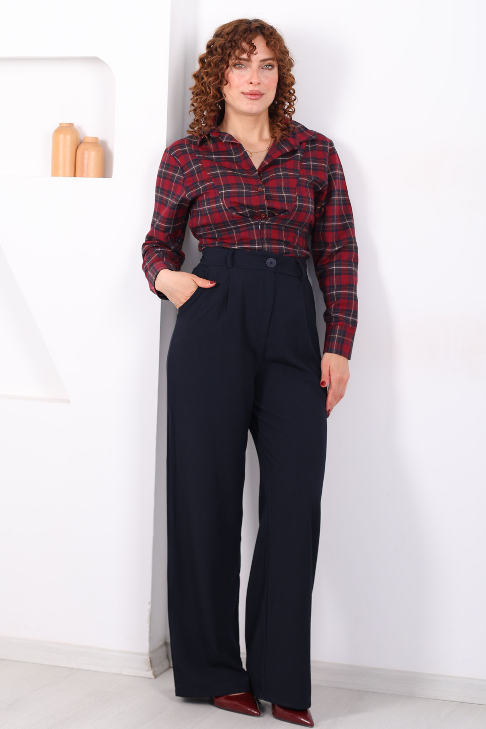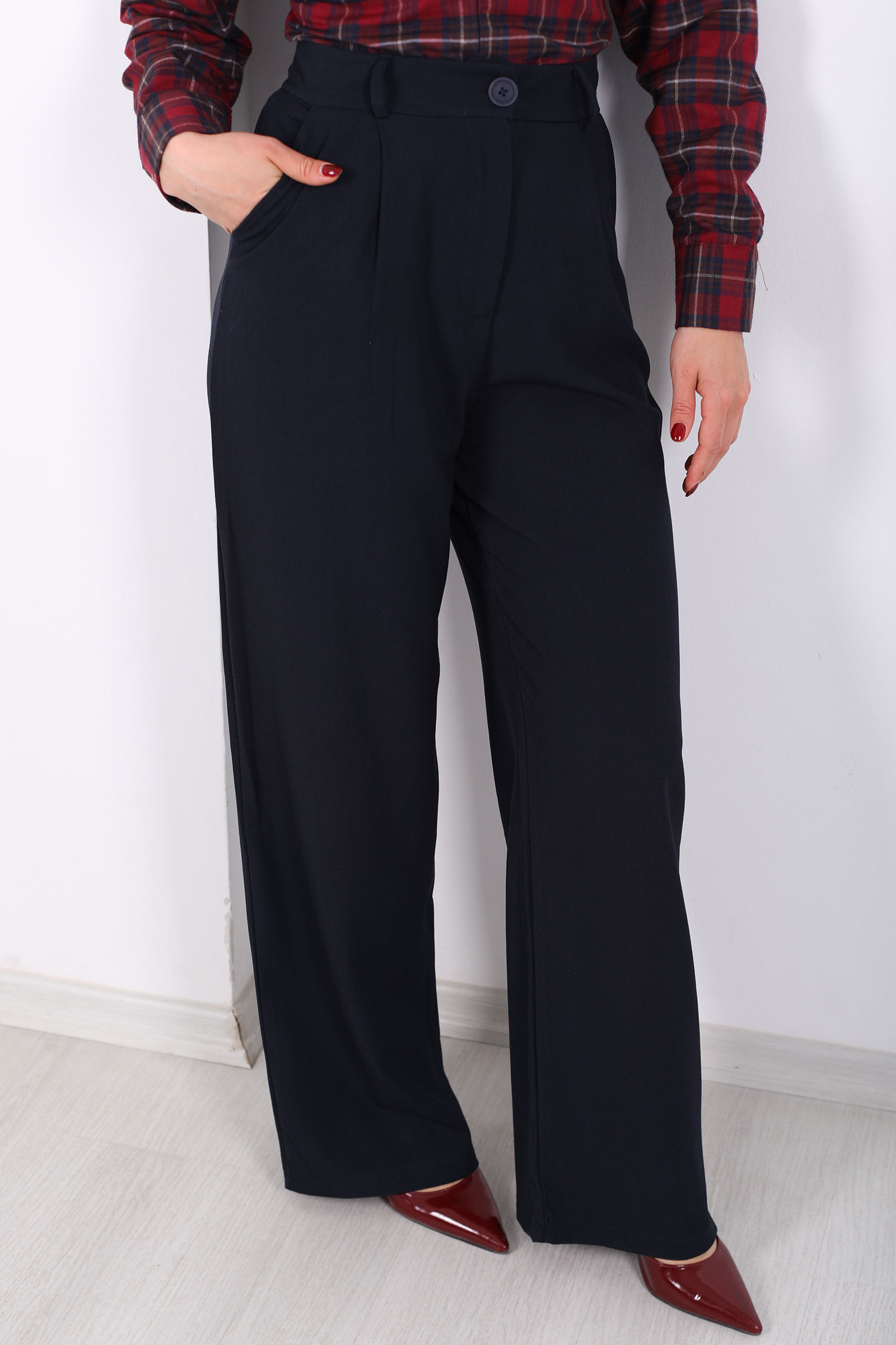 Lacivertin kolay kombinlenebilir gücünü kullanmak her gardırop için harika bir avantajdır. İster açık tonlarda pastel bluzlarla ferah bir hava yakalayın, isterseniz canlı ve enerjik renklerle kontrast yaratarak stilinizi konuşturun; bu palazzo pantolon size her ortamda şıklık vadediyor.
