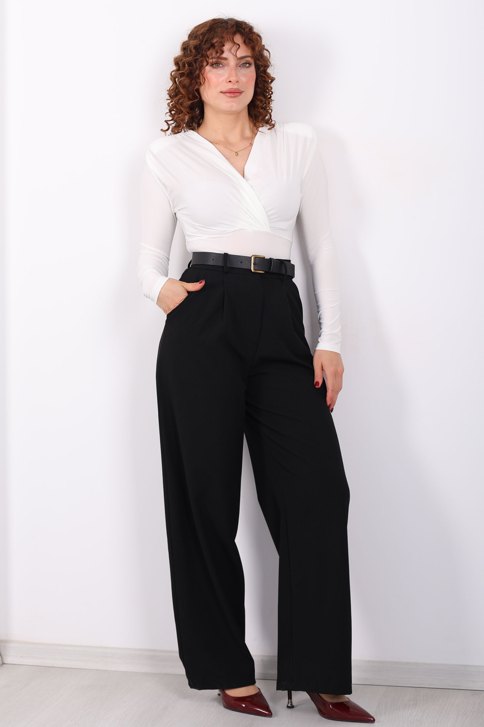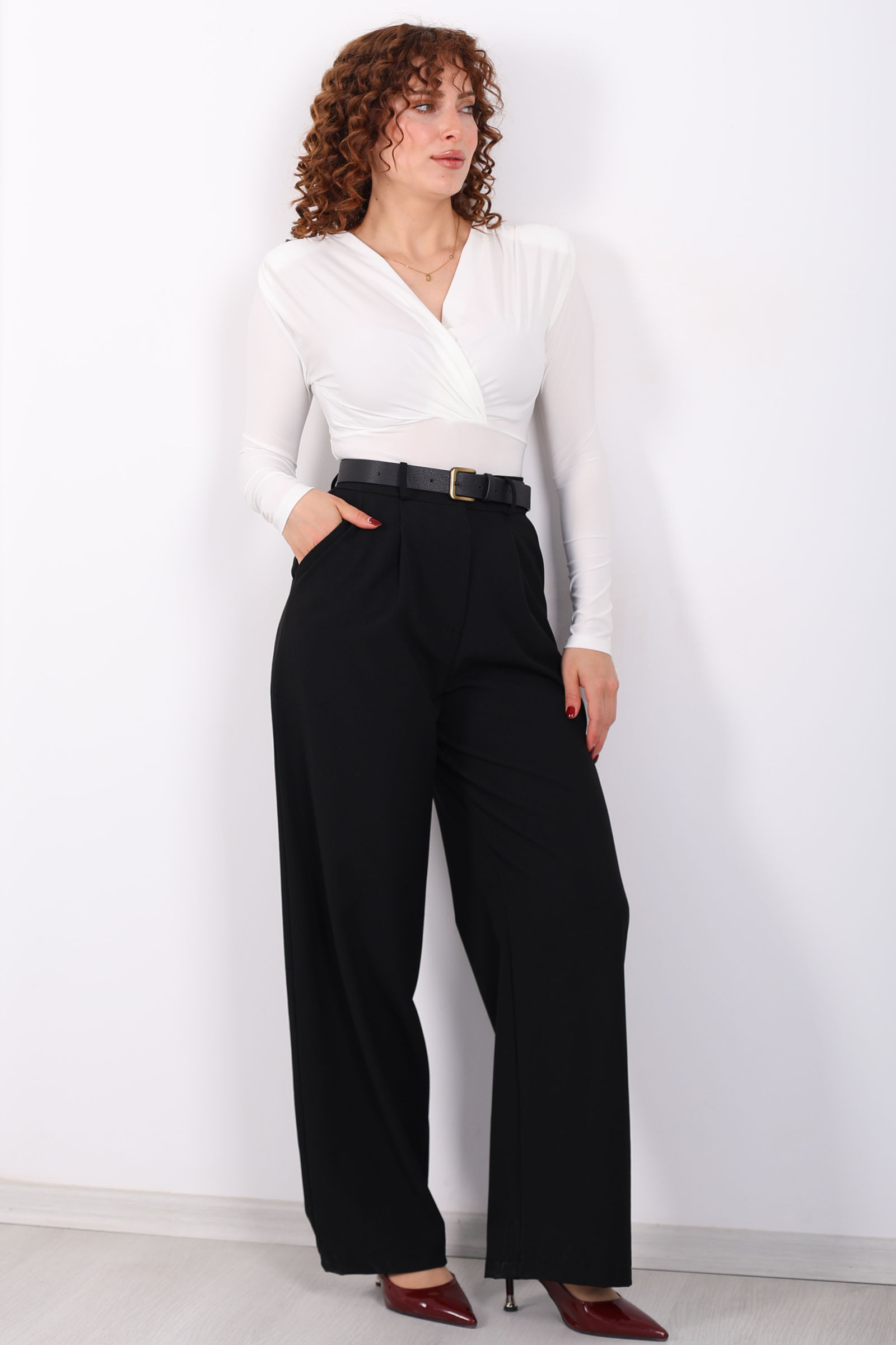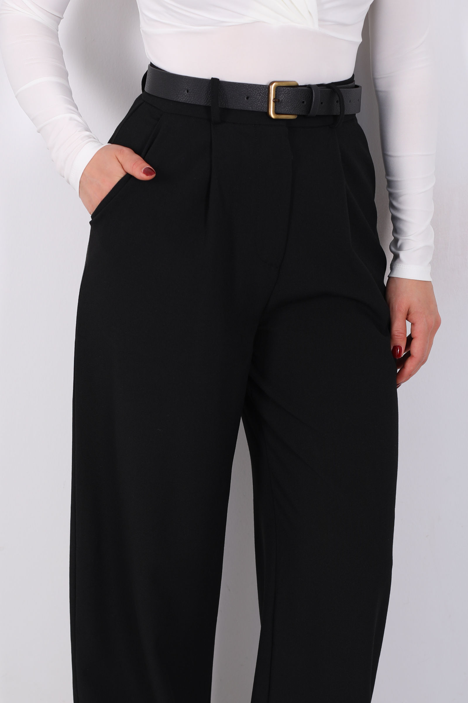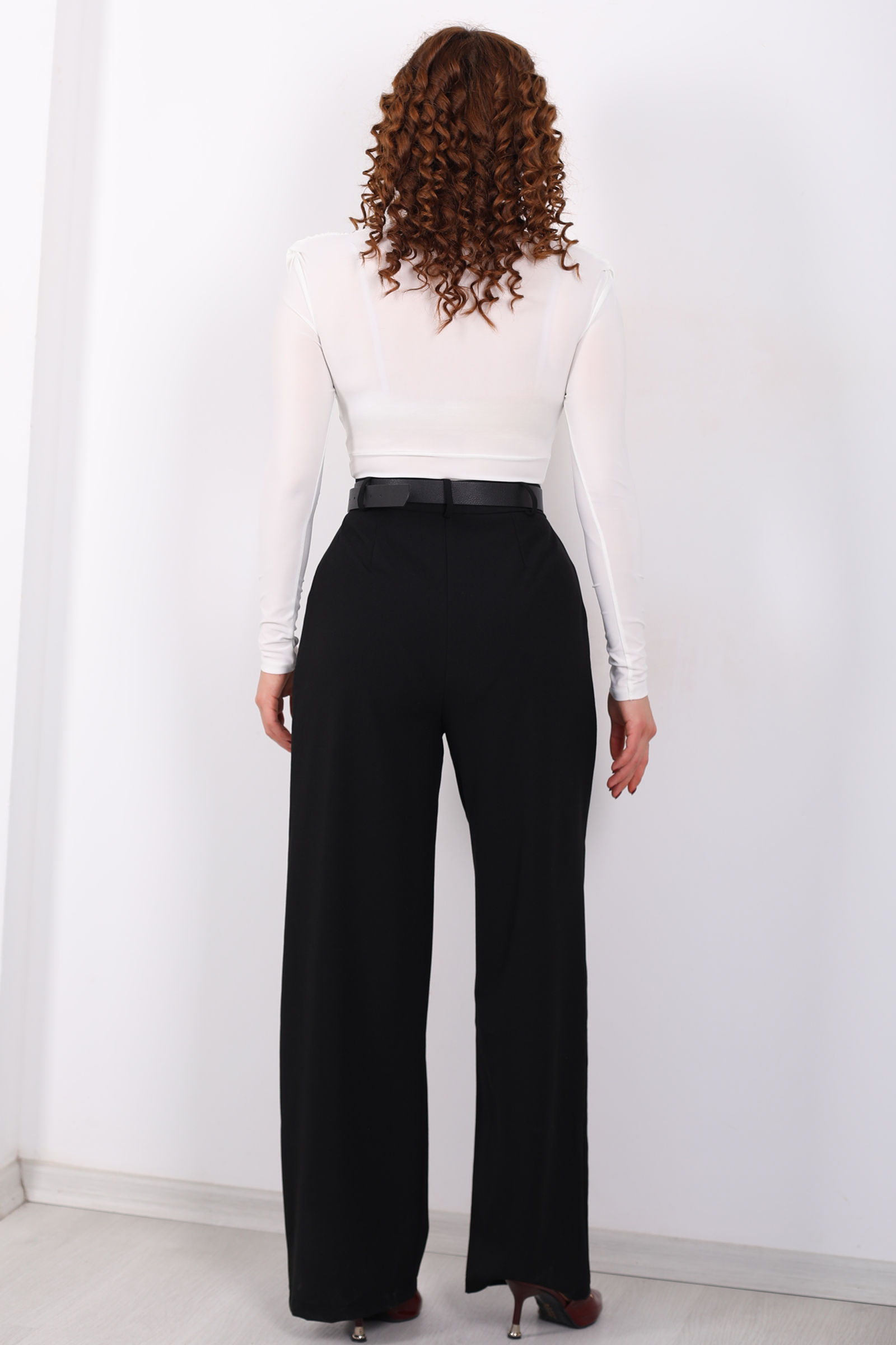 Yüksel Bel Pileli Cepli Kadın Siyah Palazzo Pantolon