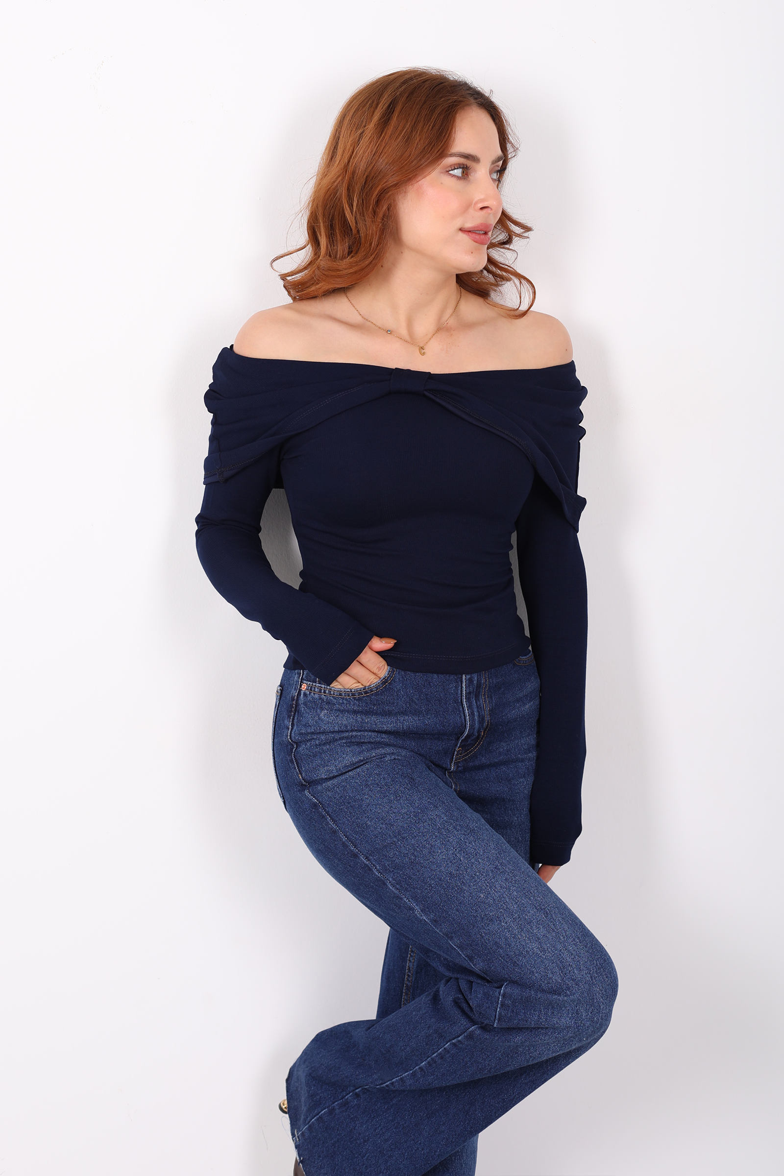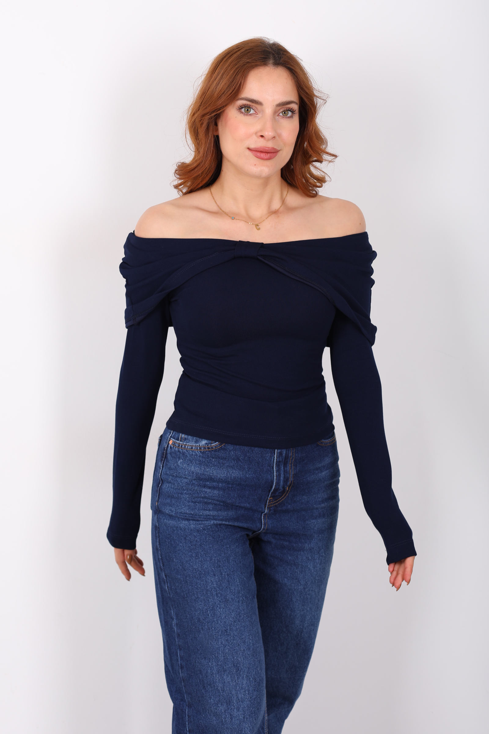 Yuvarlak Yaka Fiyonk Detaylı Kadın Lacivert Bluz