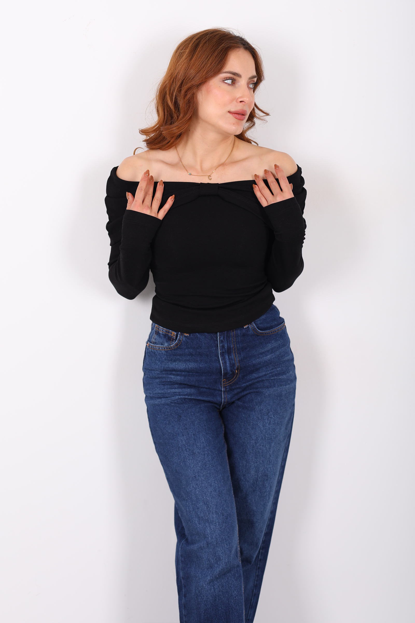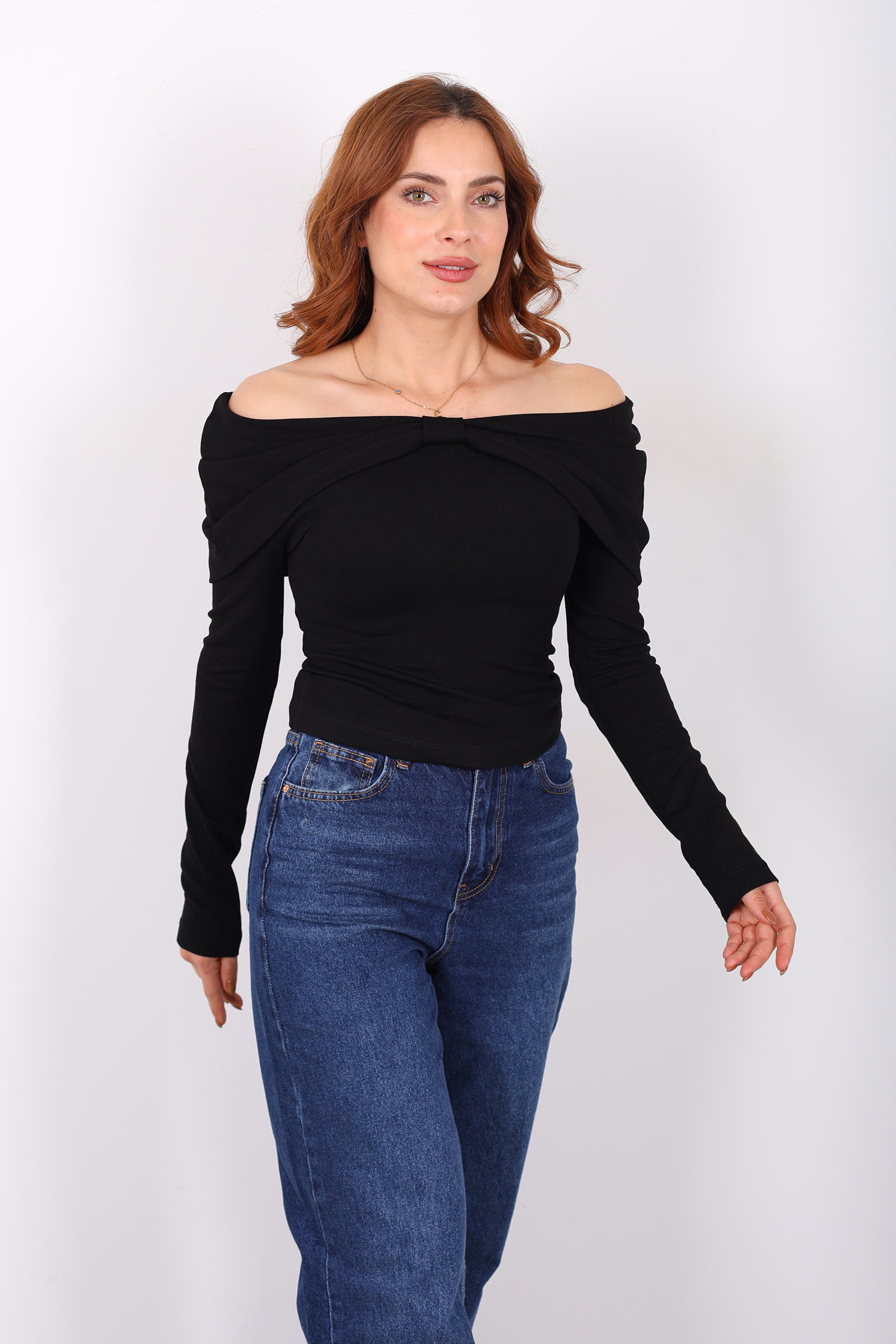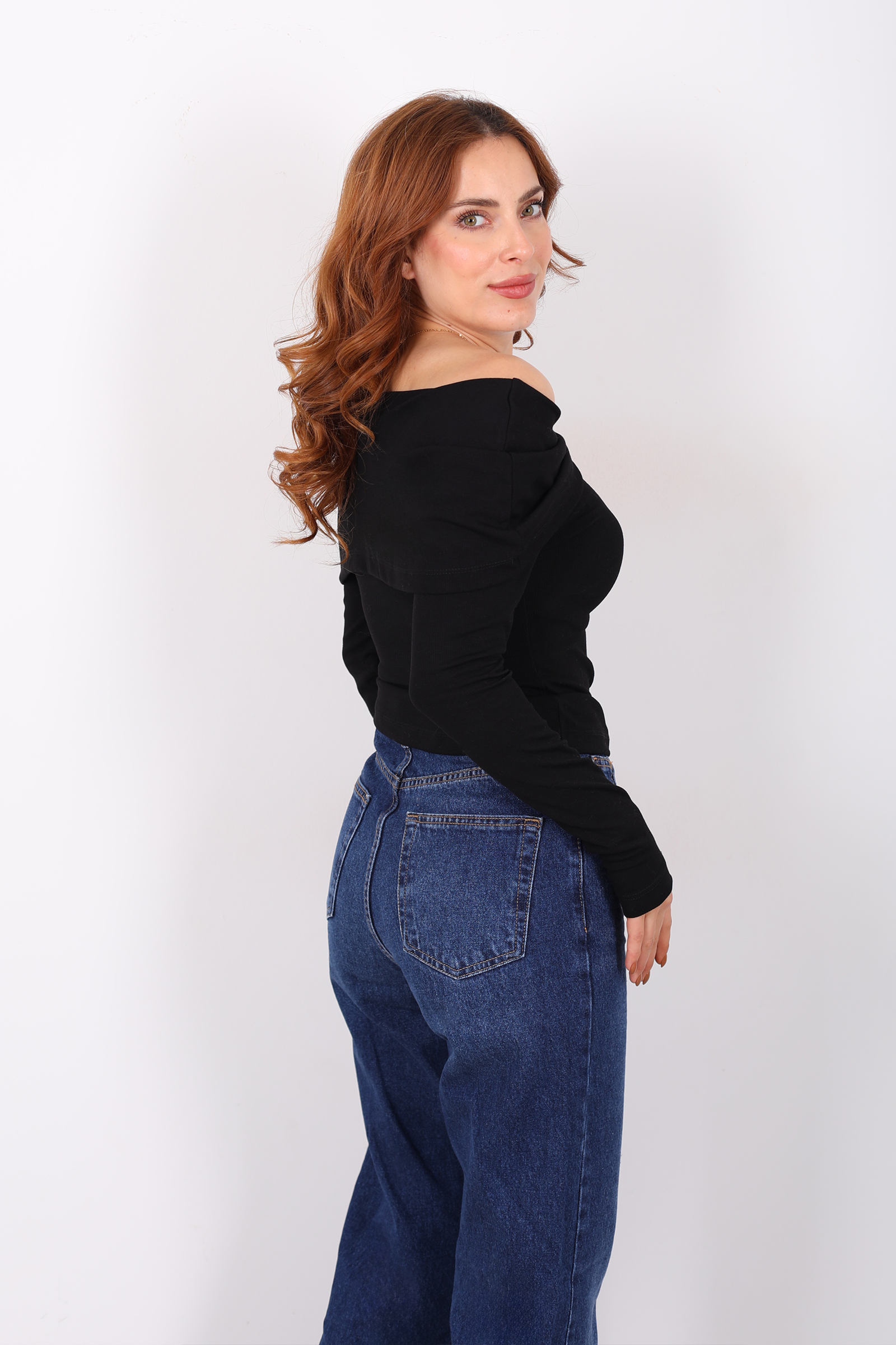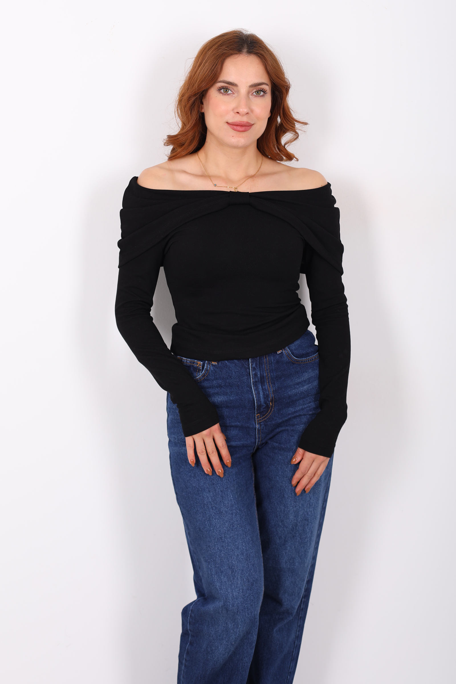 Kayık Yaka Drapeli Sandy Siyah Kadın Bluz