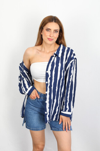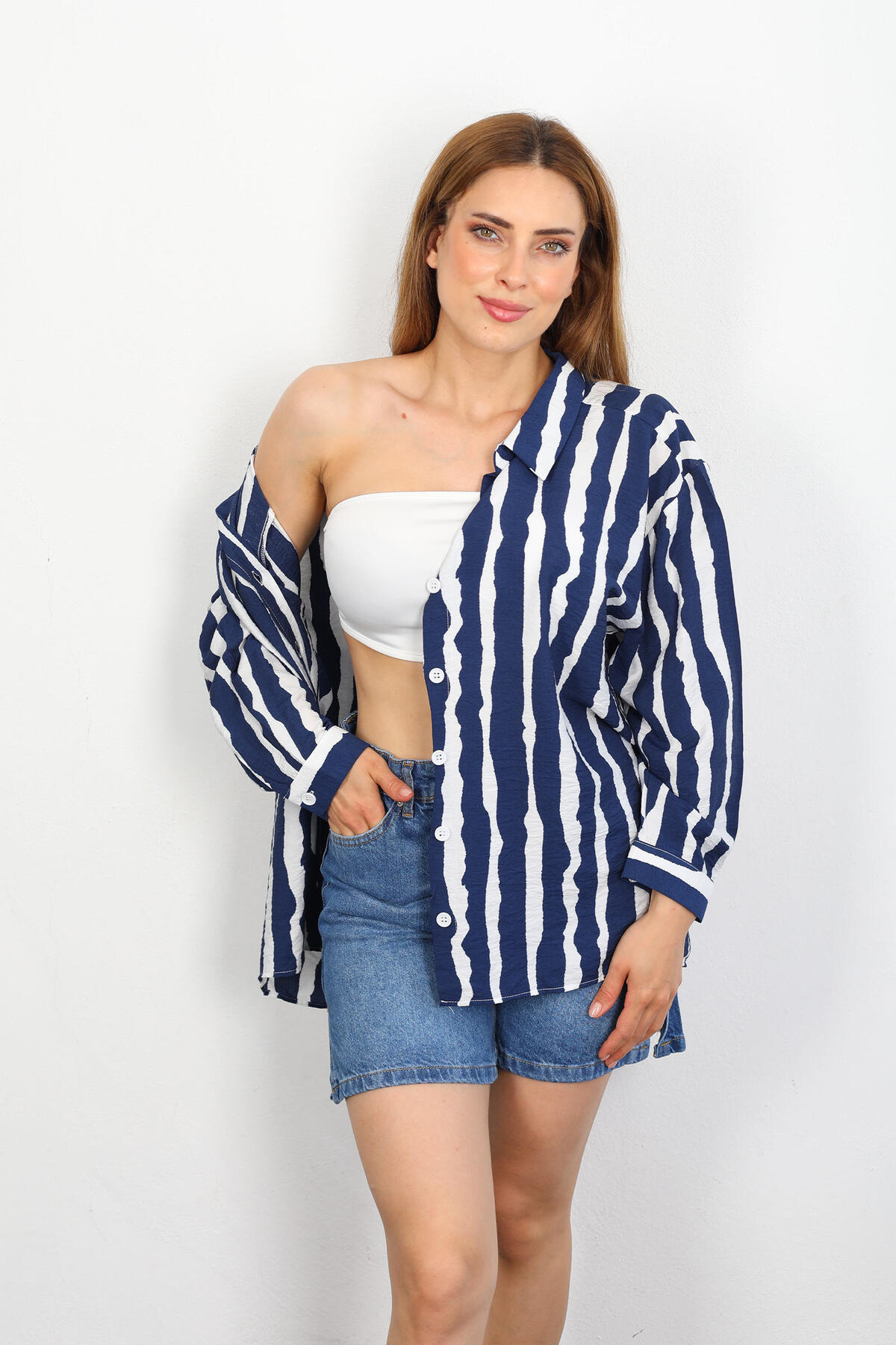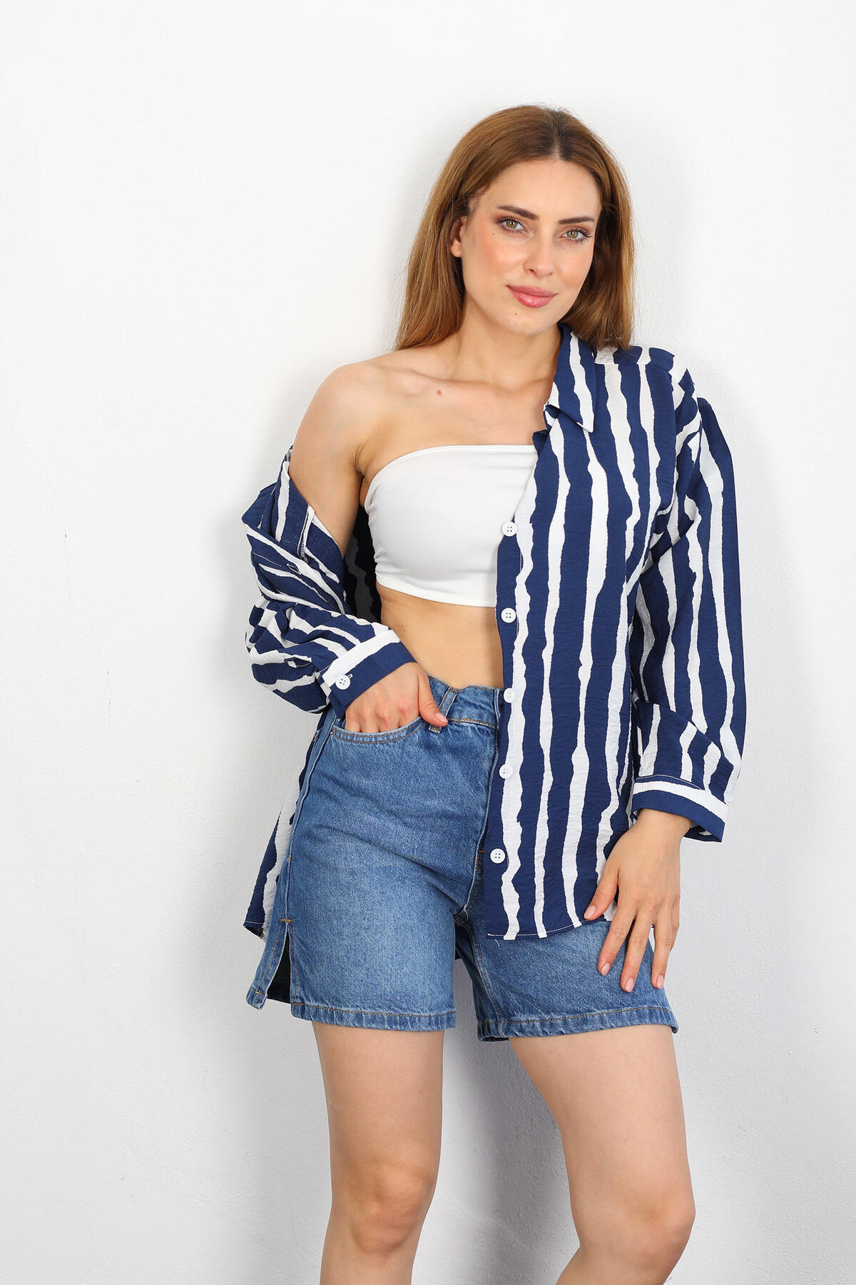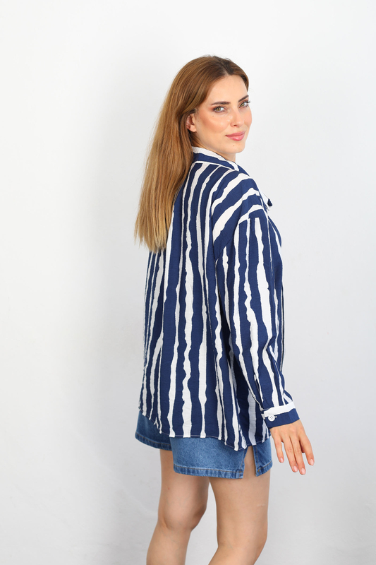 Zebra Desen Lilyum Kumaş Lacivert Kadın Gömlek, modern ve şık tasarımıyla gardırobunuzun vazgeçilmezi olmaya aday. Zebra deseninin enerjik ve dinamik havası, lacivert rengin zarafetiyle birleşerek sofistike bir görünüm sunar. Lilyum kumaşının hafif ve nefes alabilir yapısı, sıcak havalarda bile konfor sağlar. Astarlı iç kısmı, şıklığı ve rahatlığı bir arada sunuyor.