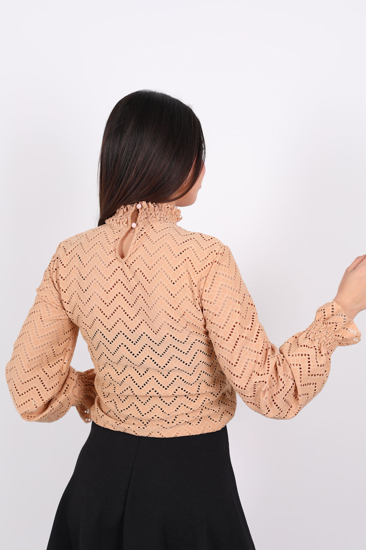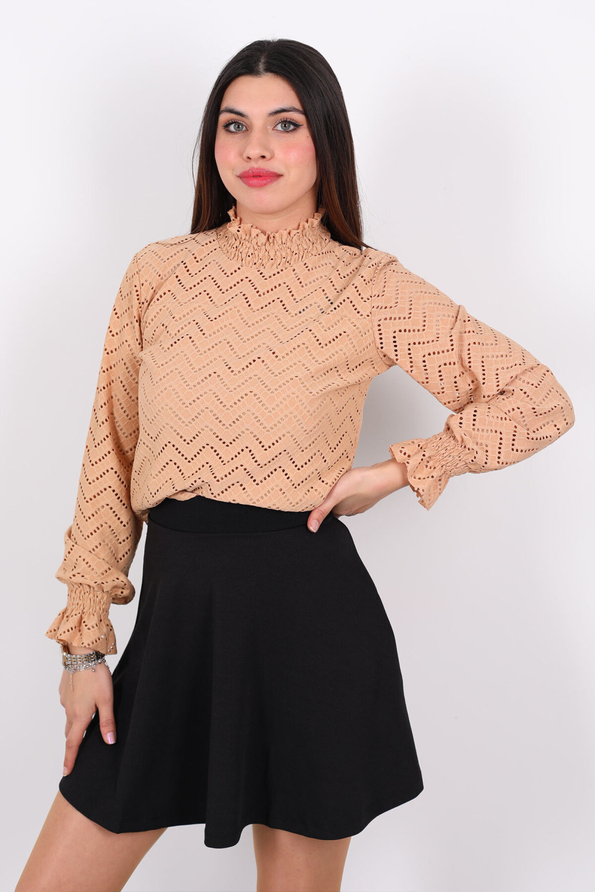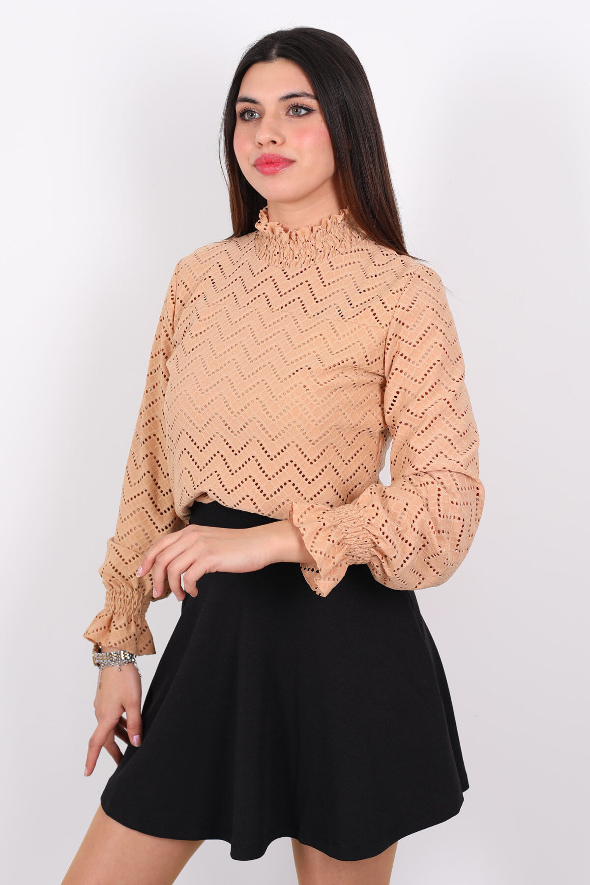 Zikzak Desen Dik Yaka Kadın Vizon Ajurlu Bluz, zarif detayları ve modern tasarımıyla gardırobunuzun vazgeçilmezi olmaya aday. Vizon renginin asaletiyle tasarlanmış bu bluz, ön kısmındaki zikzak desen ve ajurlu dokusuyla şıklığınızı tamamlar. Dik yaka tasarımı, bluzunuza sofistike bir hava katarken, uzun kol yapısı ile hem şıklığı hem de rahatlığı bir arada sunar. Pamuk ve elastan karışımı kumaşı, esnek yapısıyla vücuda oturur ve hareket özgürlüğü sağlar. Normal kalıp kesimi, her bedene uyum sağlar.