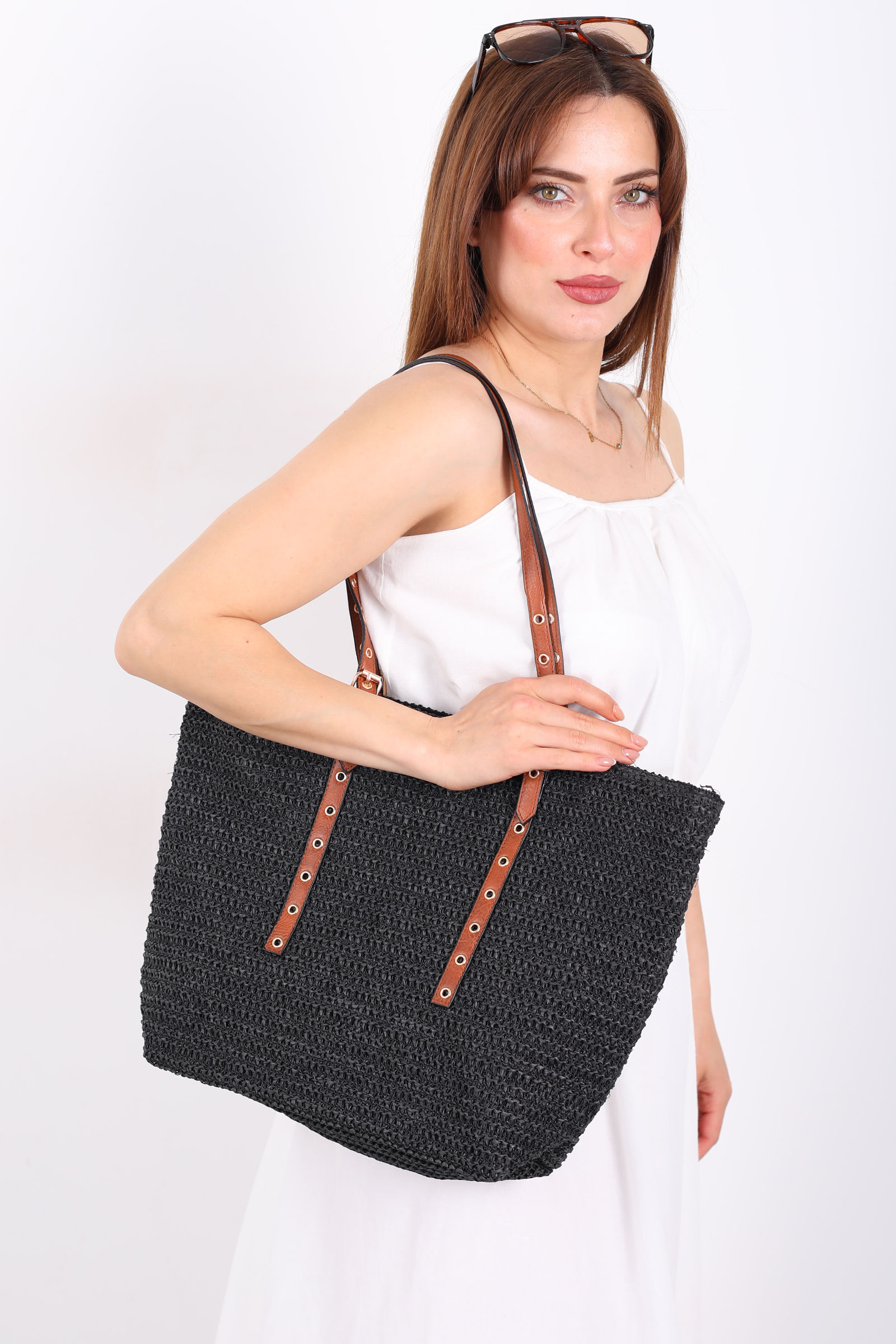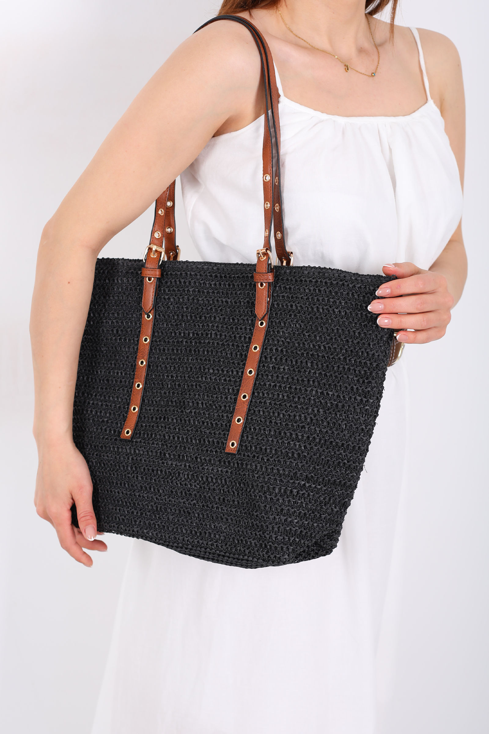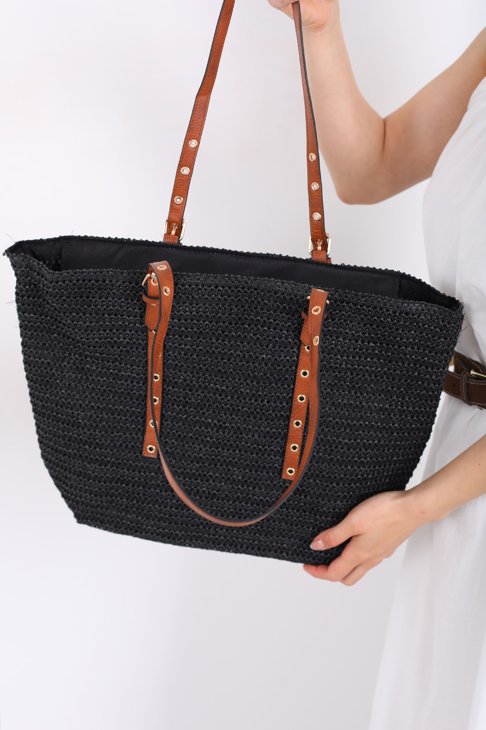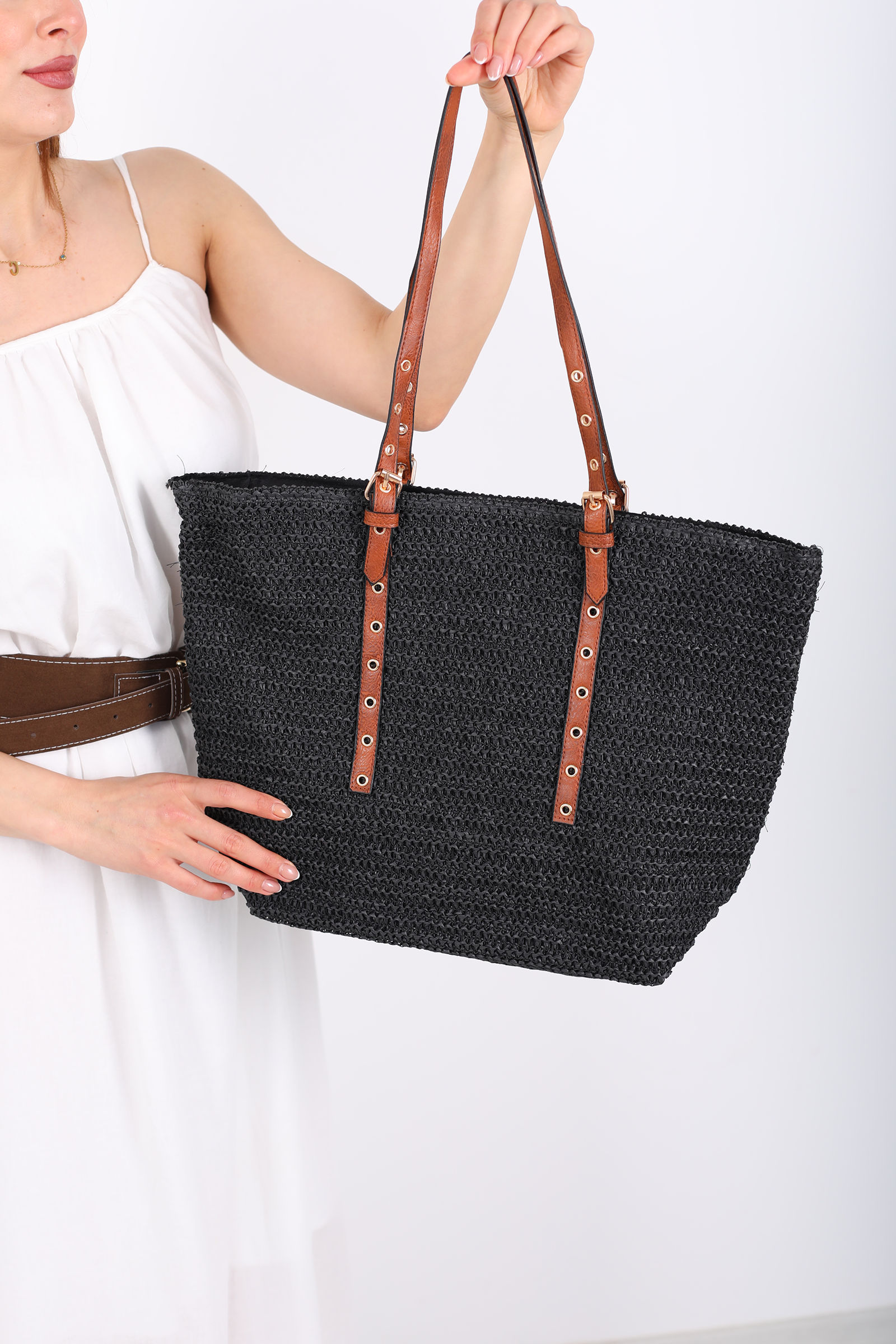 Zımba Detaylı Siyah Hasır Çanta
