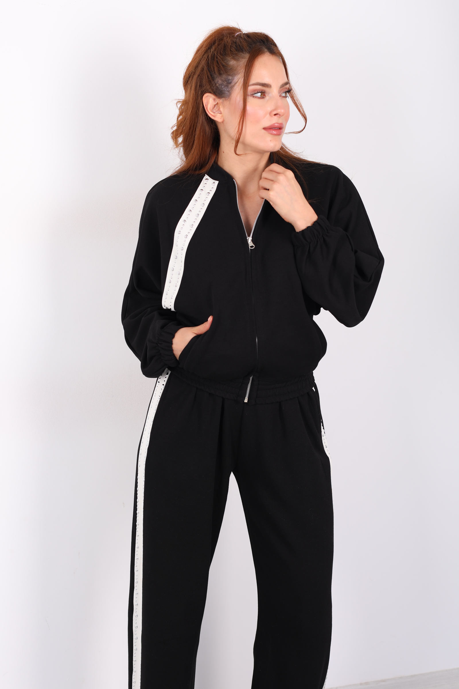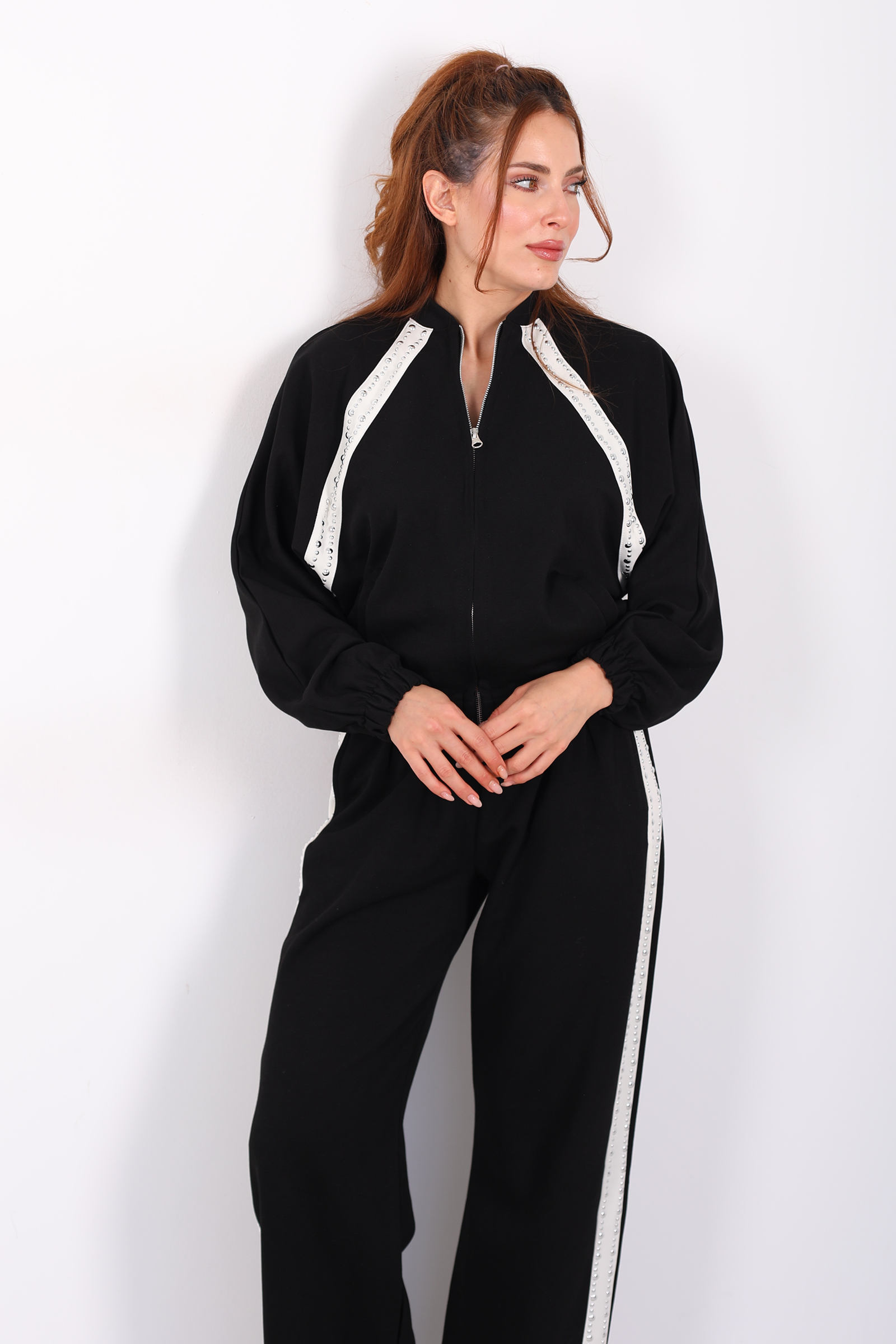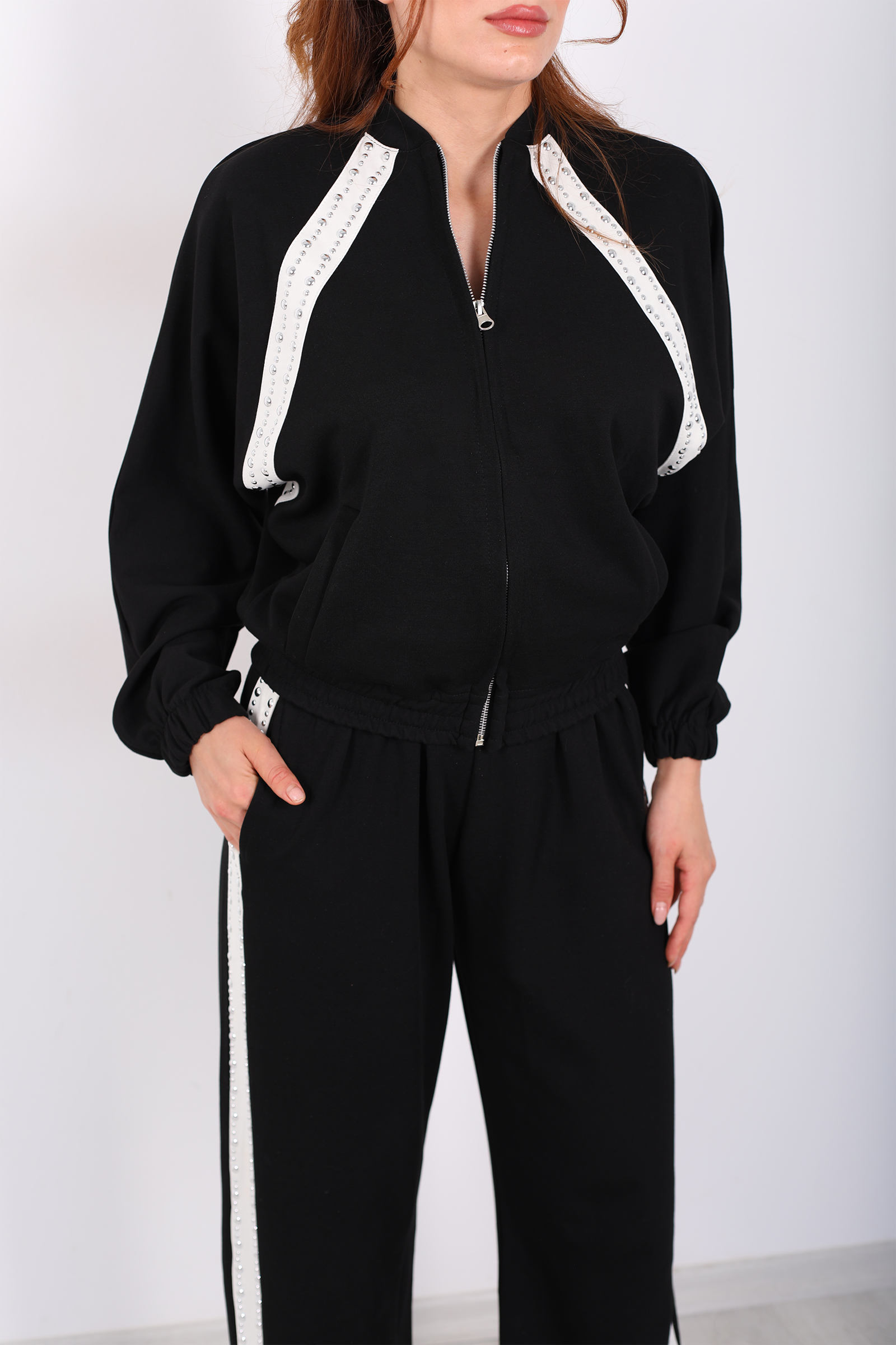 Zımbalı Biyeli Fermuarlı Siyah Kadın Takım