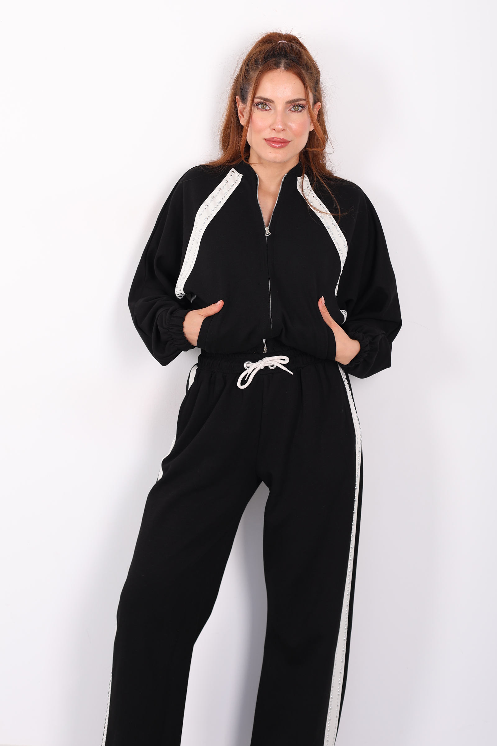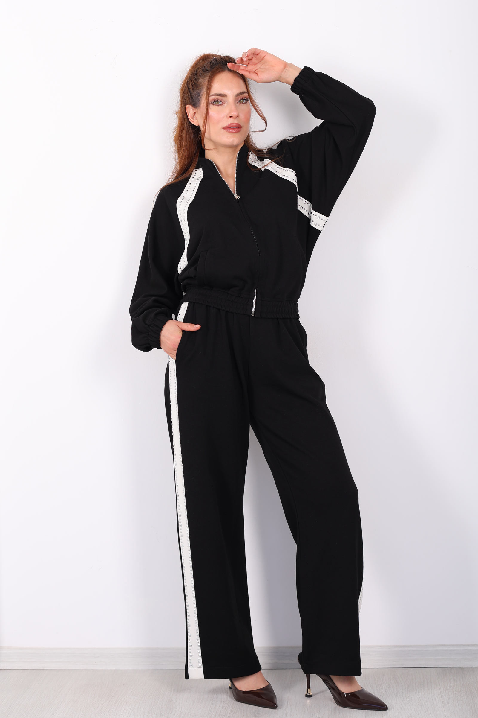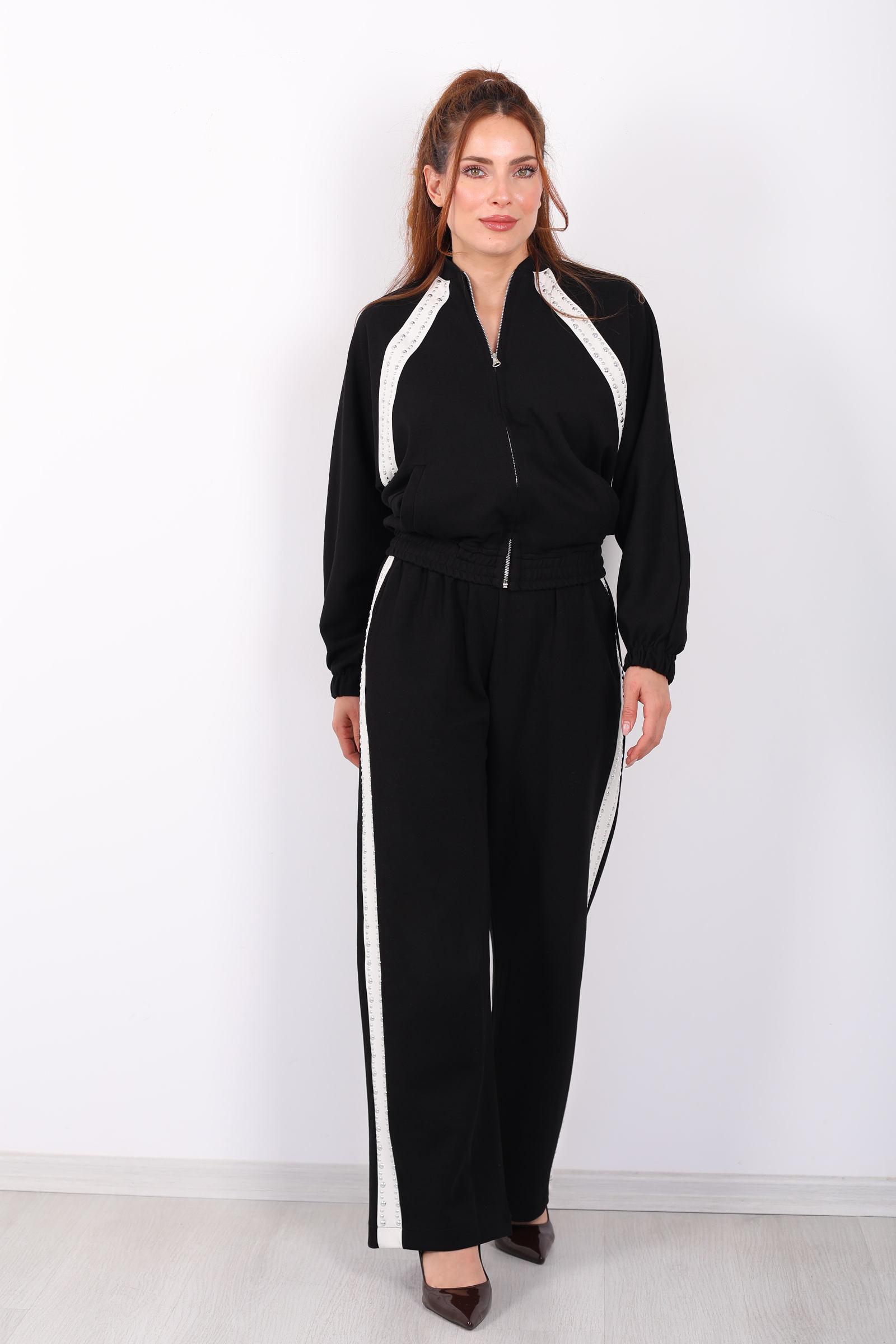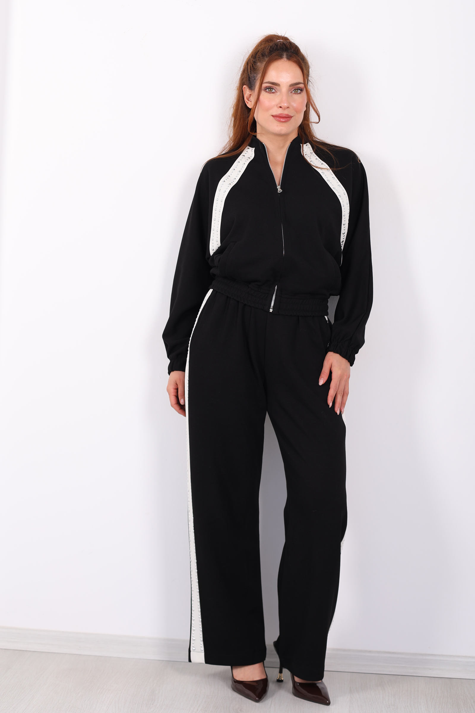 Zımbalı Biyeli Fermuarlı Siyah Kadın Takım