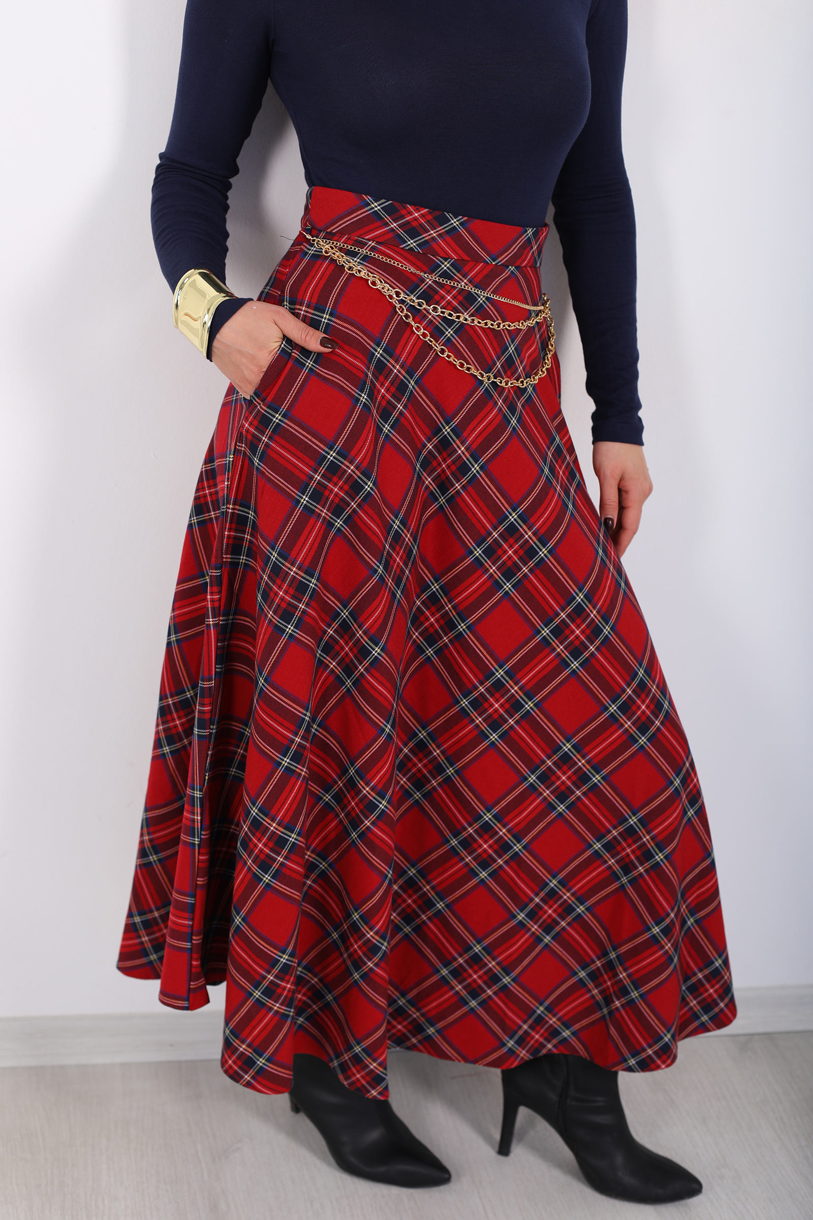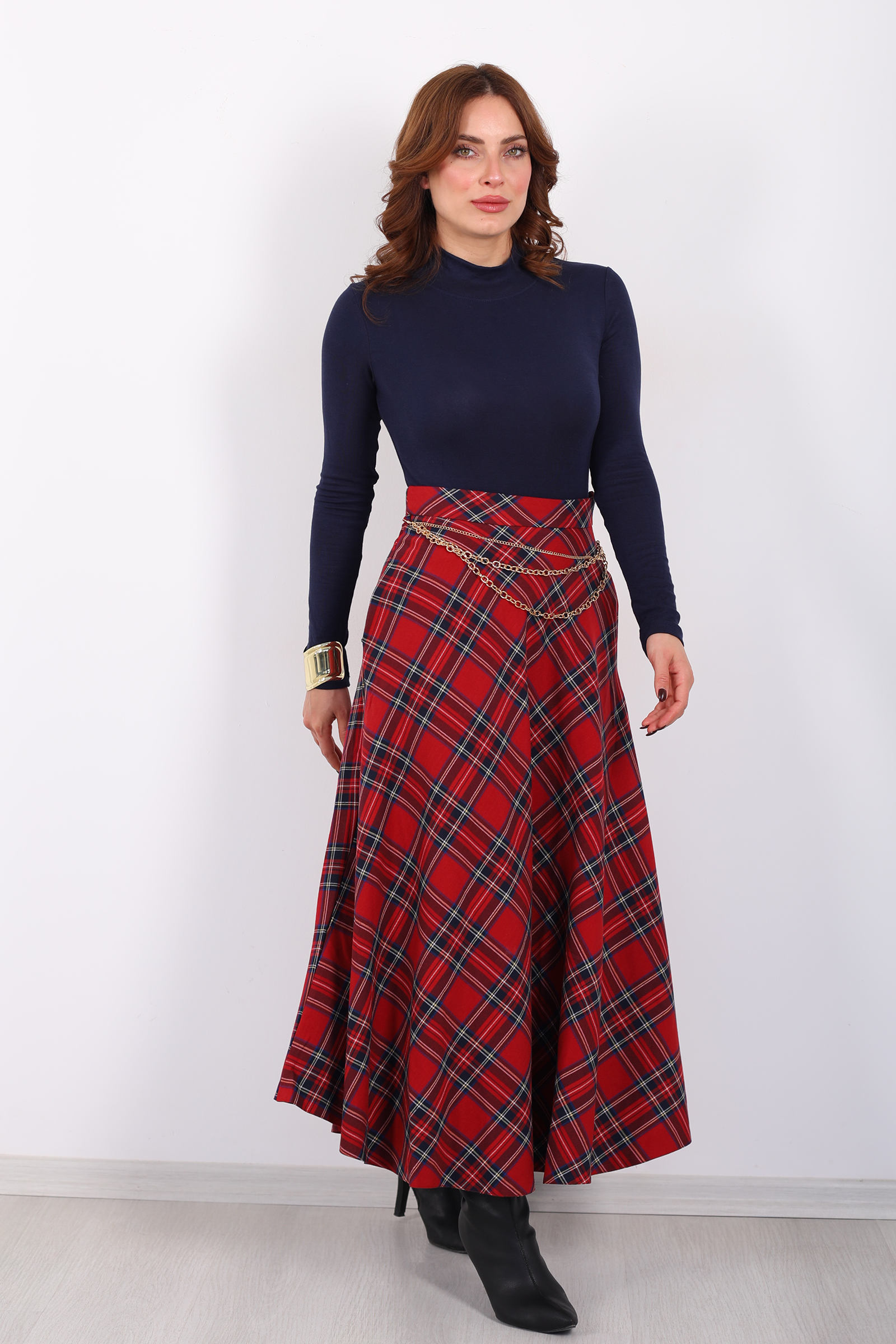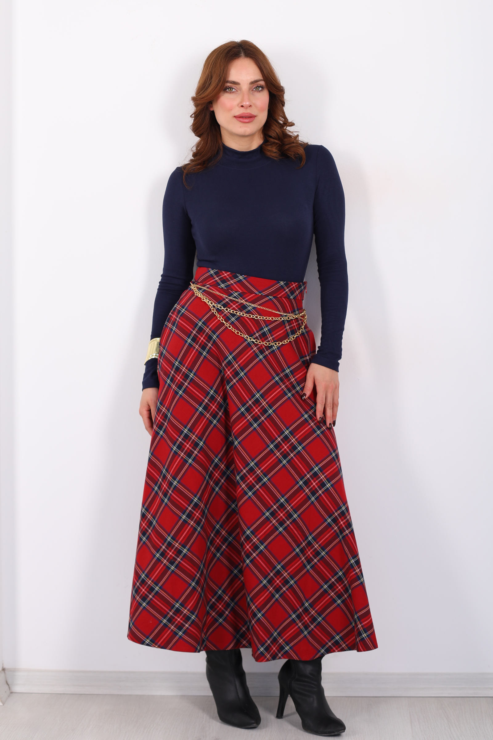 Canlı kırmızı ekose desenini metalik zincir kemer detayıyla buluşturan bu midi etek, stilinize cesur ve dinamik bir karakter ekliyor. Kumaşın akıcı yapısı adımlarınızla birlikte zarif bir hareket yaratırken, midi boy etek formu feminen bir duruş sağlar. Zincir kemer, klasik ekose siluetine modern ve asi bir dokunuş katar; sonuç olarak sade parçalarla bile güçlü bir kontrast elde edersiniz. Günlük şehir stilinden akşam ritimlerine kadar geniş kombin seçenekleriyle öne çıkan bu parça, modayı özgün bir ritimle ifade etmek isteyenler için ideal.