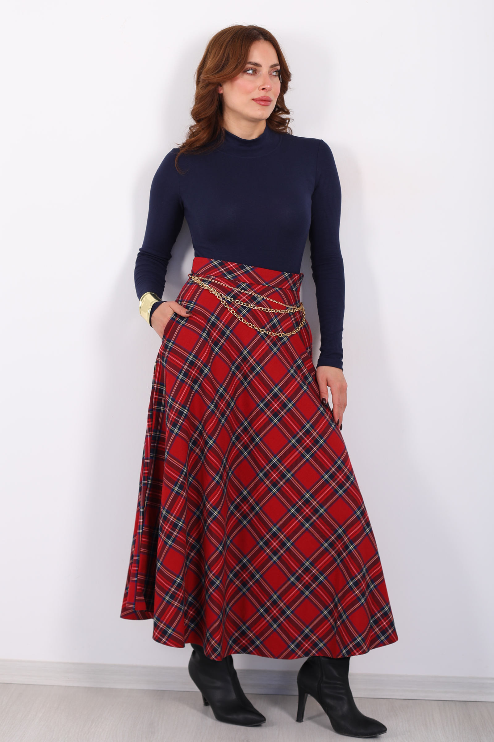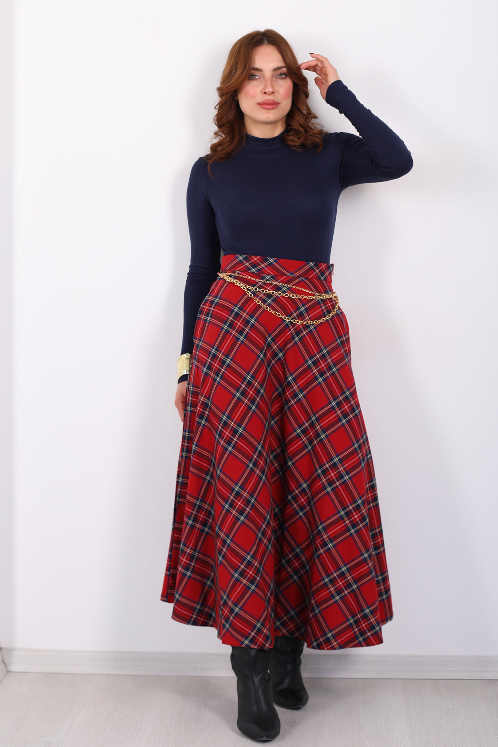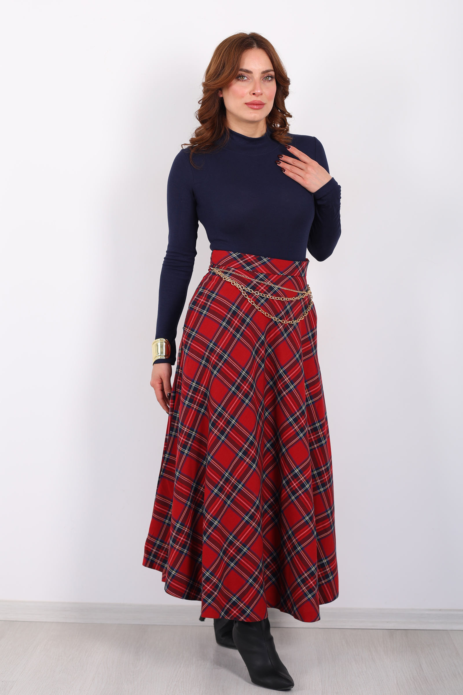 Canlı kırmızı ekose desenini metalik zincir kemer detayıyla buluşturan bu midi etek, stilinize cesur ve dinamik bir karakter ekliyor. Kumaşın akıcı yapısı adımlarınızla birlikte zarif bir hareket yaratırken, midi boy etek formu feminen bir duruş sağlar. Zincir kemer, klasik ekose siluetine modern ve asi bir dokunuş katar; sonuç olarak sade parçalarla bile güçlü bir kontrast elde edersiniz. Günlük şehir stilinden akşam ritimlerine kadar geniş kombin seçenekleriyle öne çıkan bu parça, modayı özgün bir ritimle ifade etmek isteyenler için ideal.